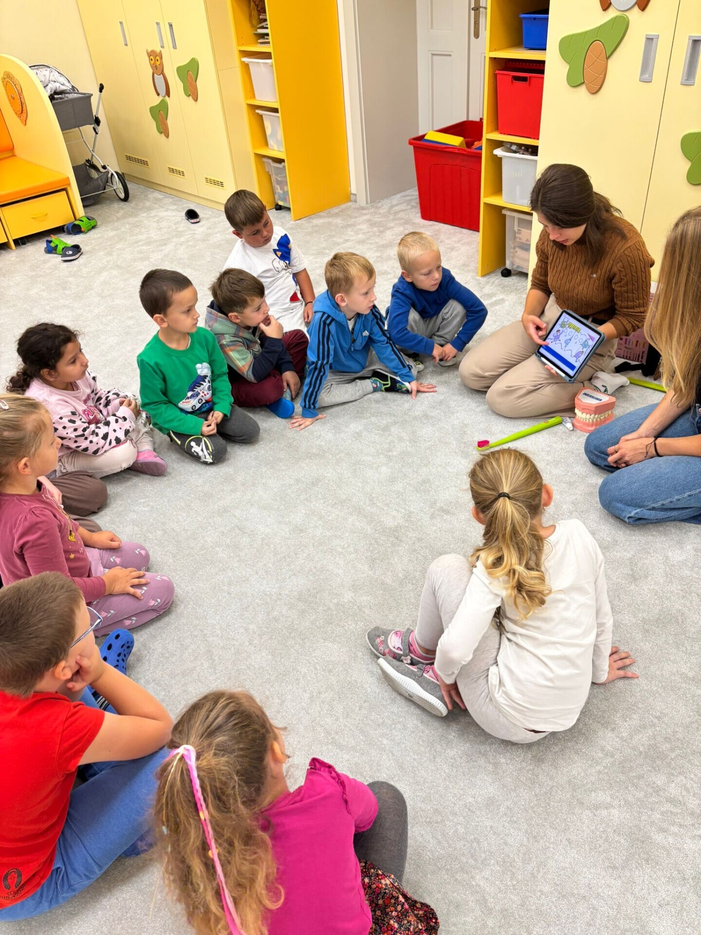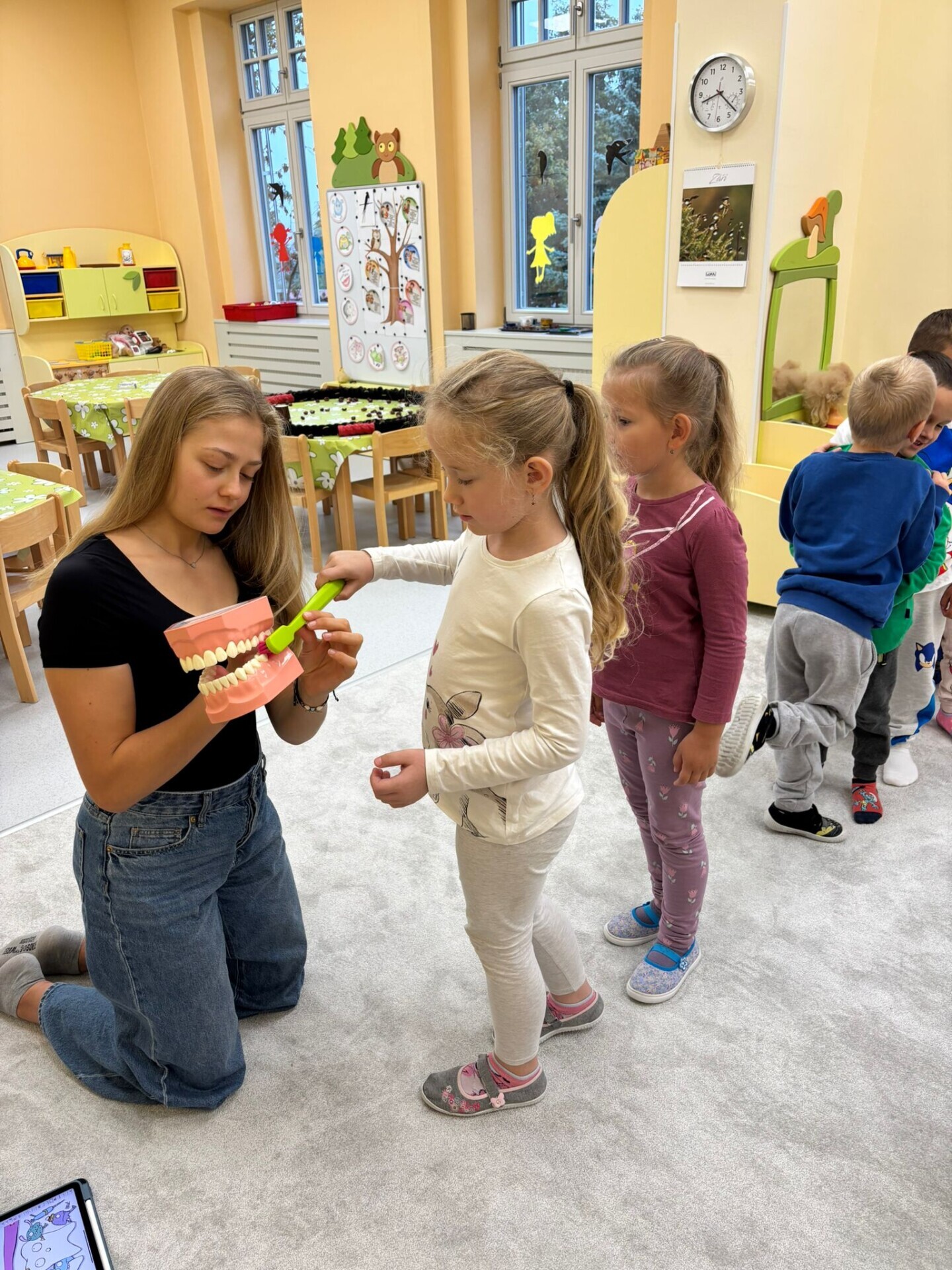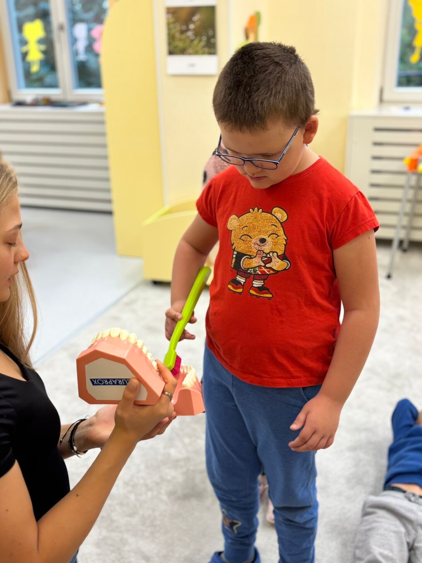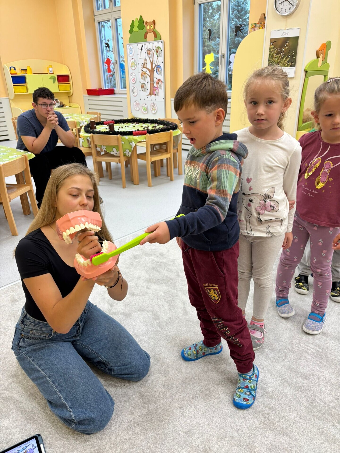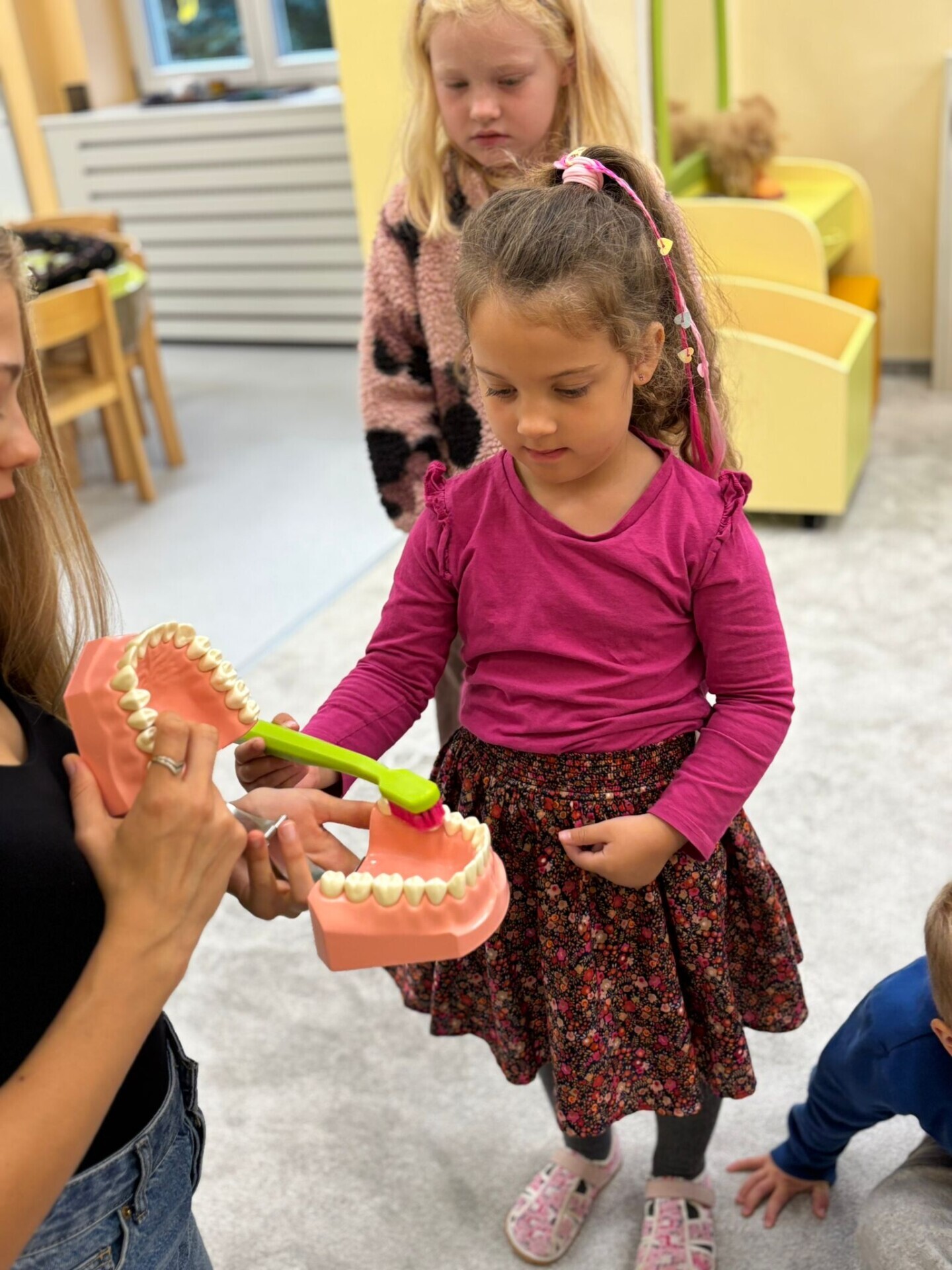 V pátek 26. 9. 2025 k nám do školky přijely studentky z vysoké školy z Plzně, které děti zábavnou formou učily starat se o své zuby. Dozvěděli jsme se, že zubní kartáček téměř všichni držíme špatně. Naučili jsem se tedy správné držení kartáčku, správný pohyb kartáčku a také, co je pro naše zuby zdravé a co škodlivé.