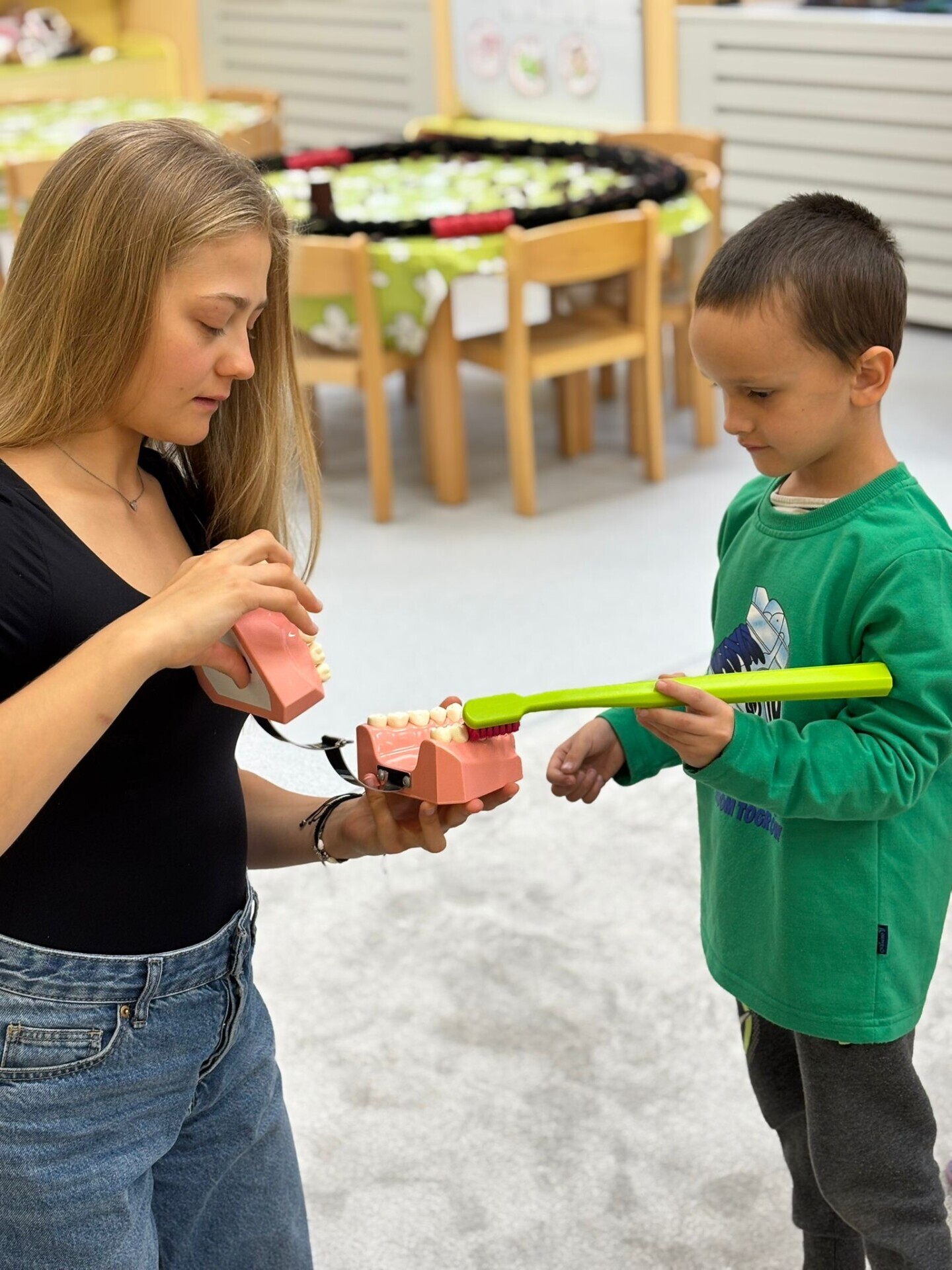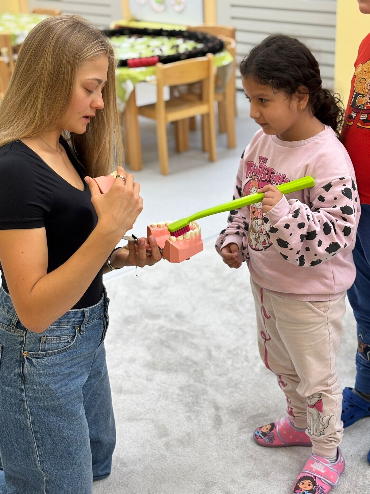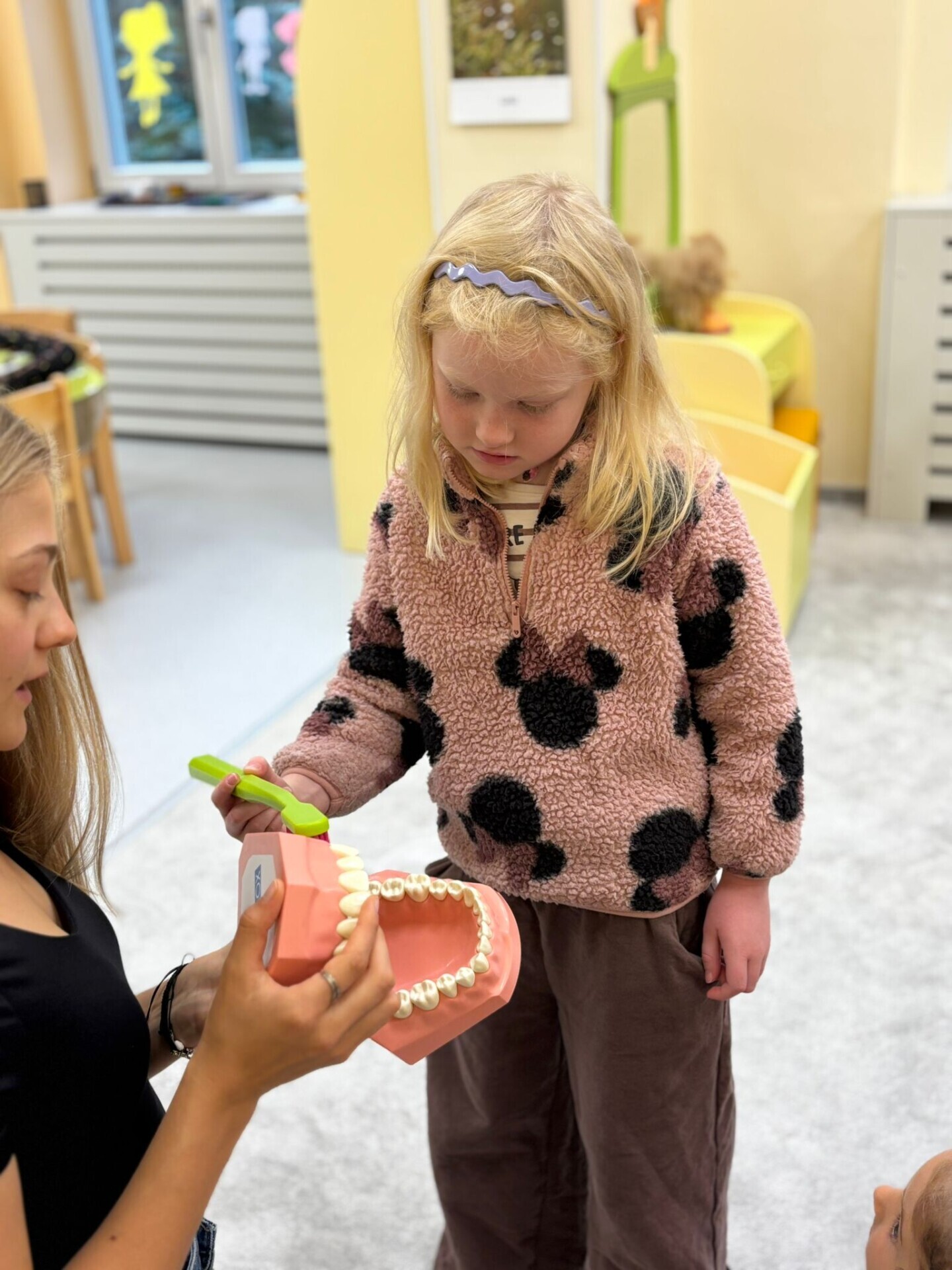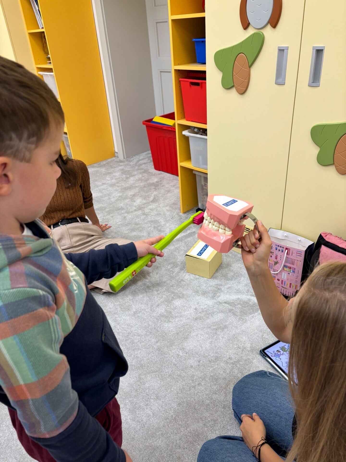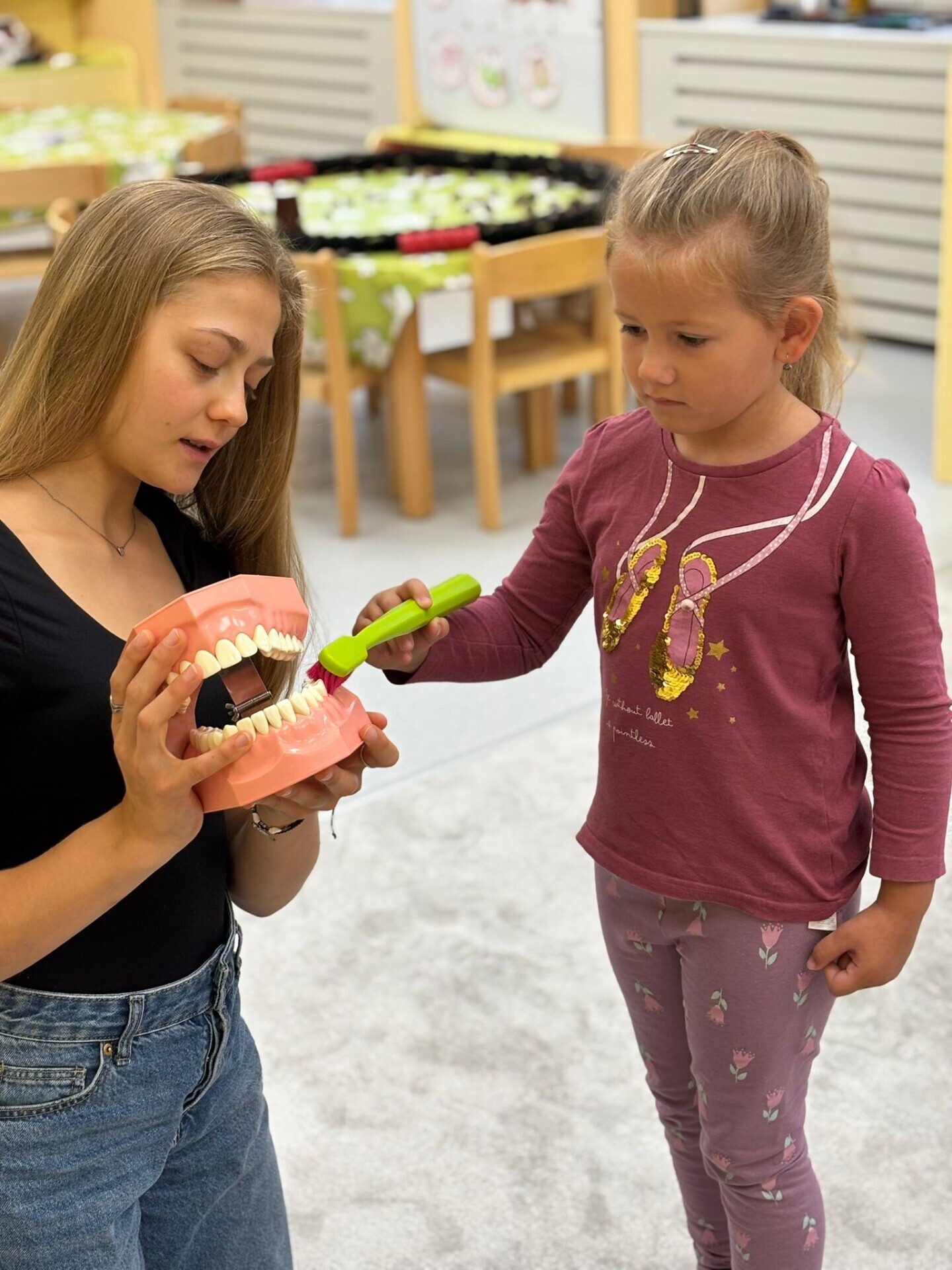 V pátek 26. 9. 2025 k nám do školky přijely studentky z vysoké školy z Plzně, které děti zábavnou formou učily starat se o své zuby. Dozvěděli jsme se, že zubní kartáček téměř všichni držíme špatně. Naučili jsem se tedy správné držení kartáčku, správný pohyb kartáčku a také, co je pro naše zuby zdravé a co škodlivé.