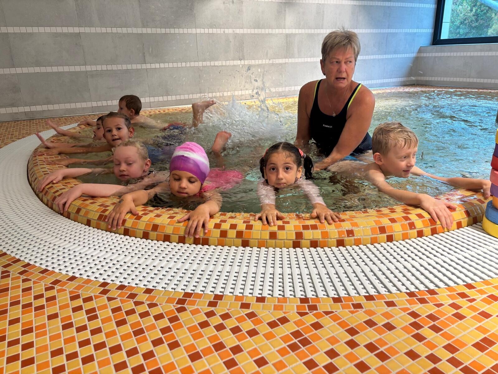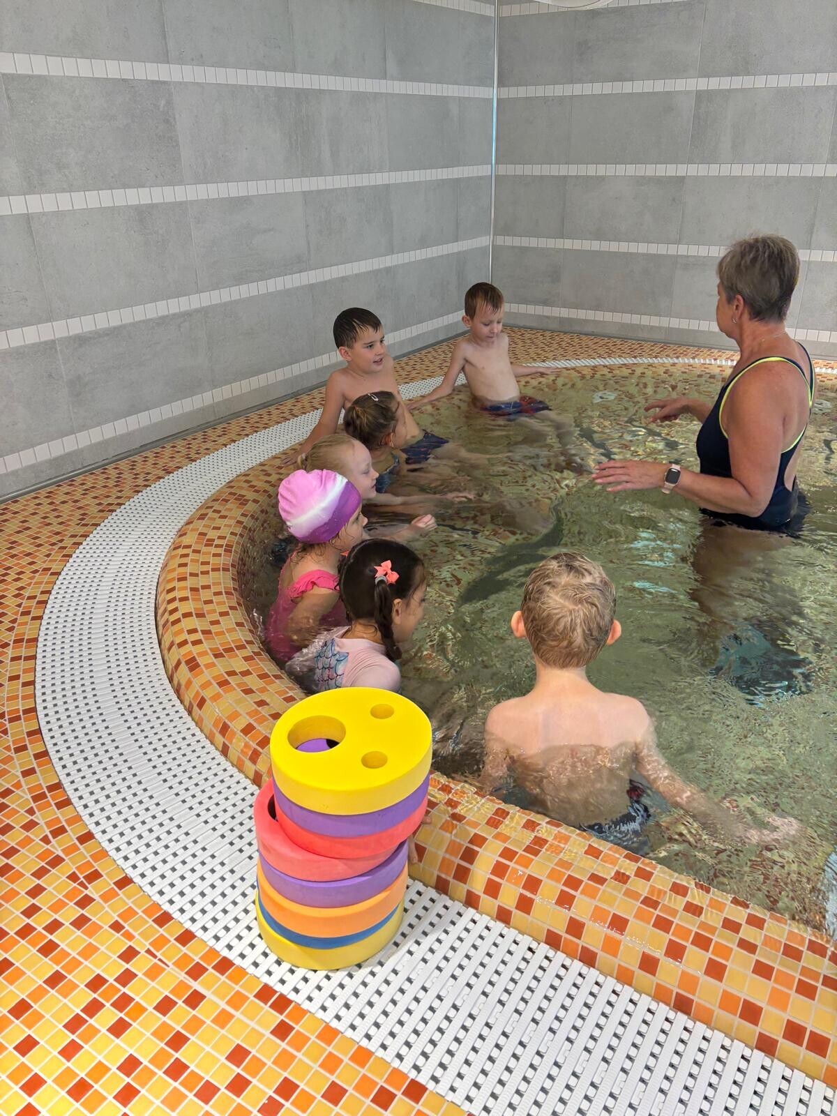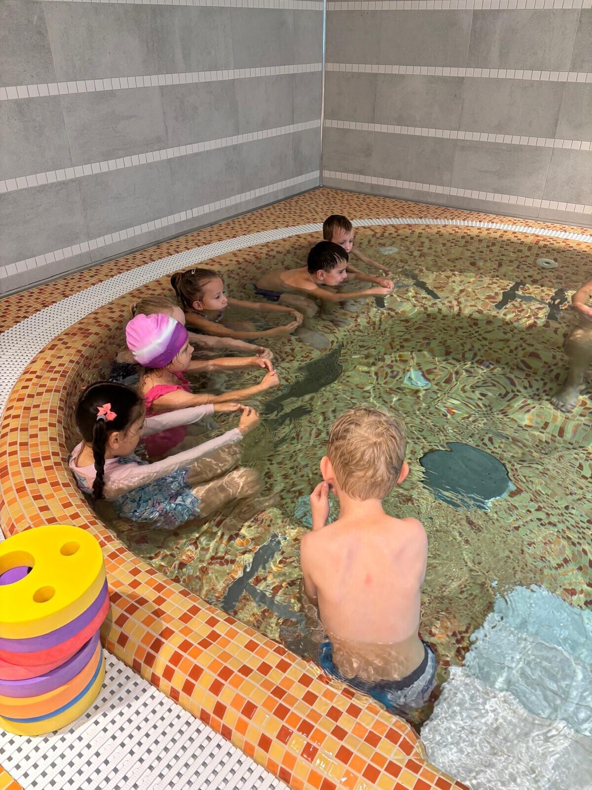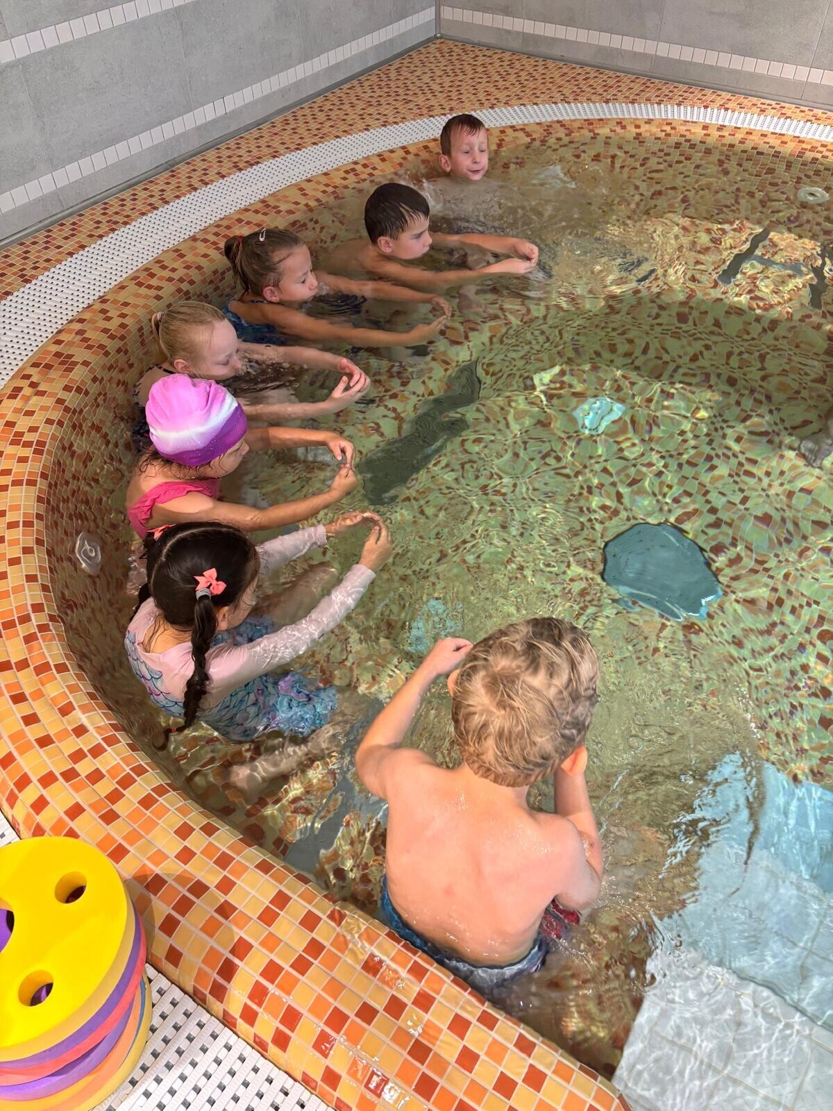 Tentokrát se celá výuka odehrávala ve vířivce. Bublinky měly děti vypnuté, ale voda byla teplá a vyzkoušely si, jaké to je plavat v místě, kde ne všichni dosahnou na zem, učily se plavat v hloubce. Kdo se bál, mohl mít rukávky nebo pás. Našly se i odvážlivci, kteří plavali bez jakýchkoli pomůcek.
