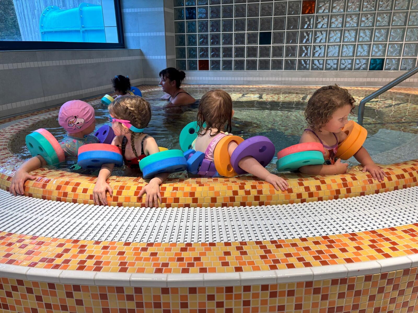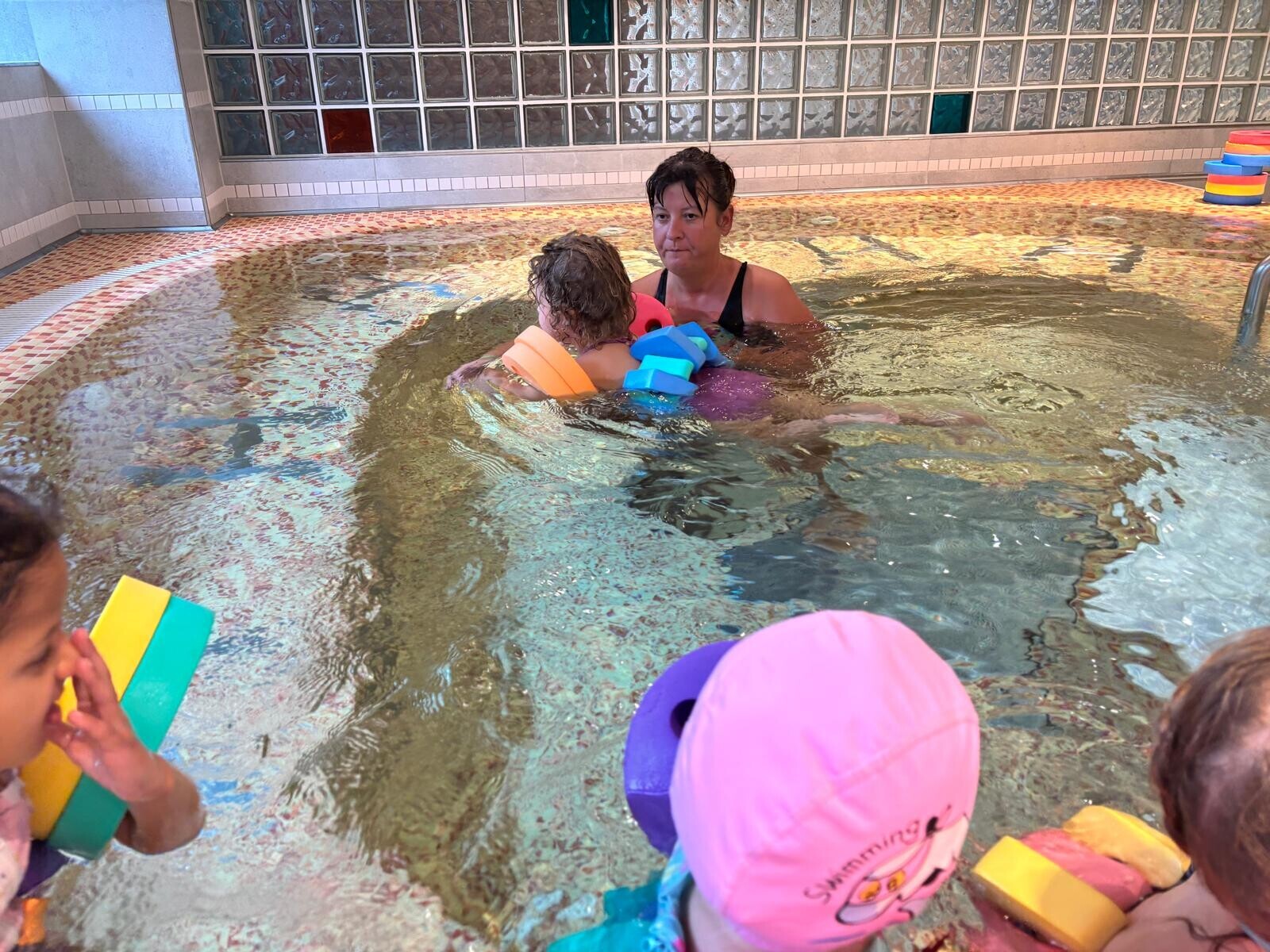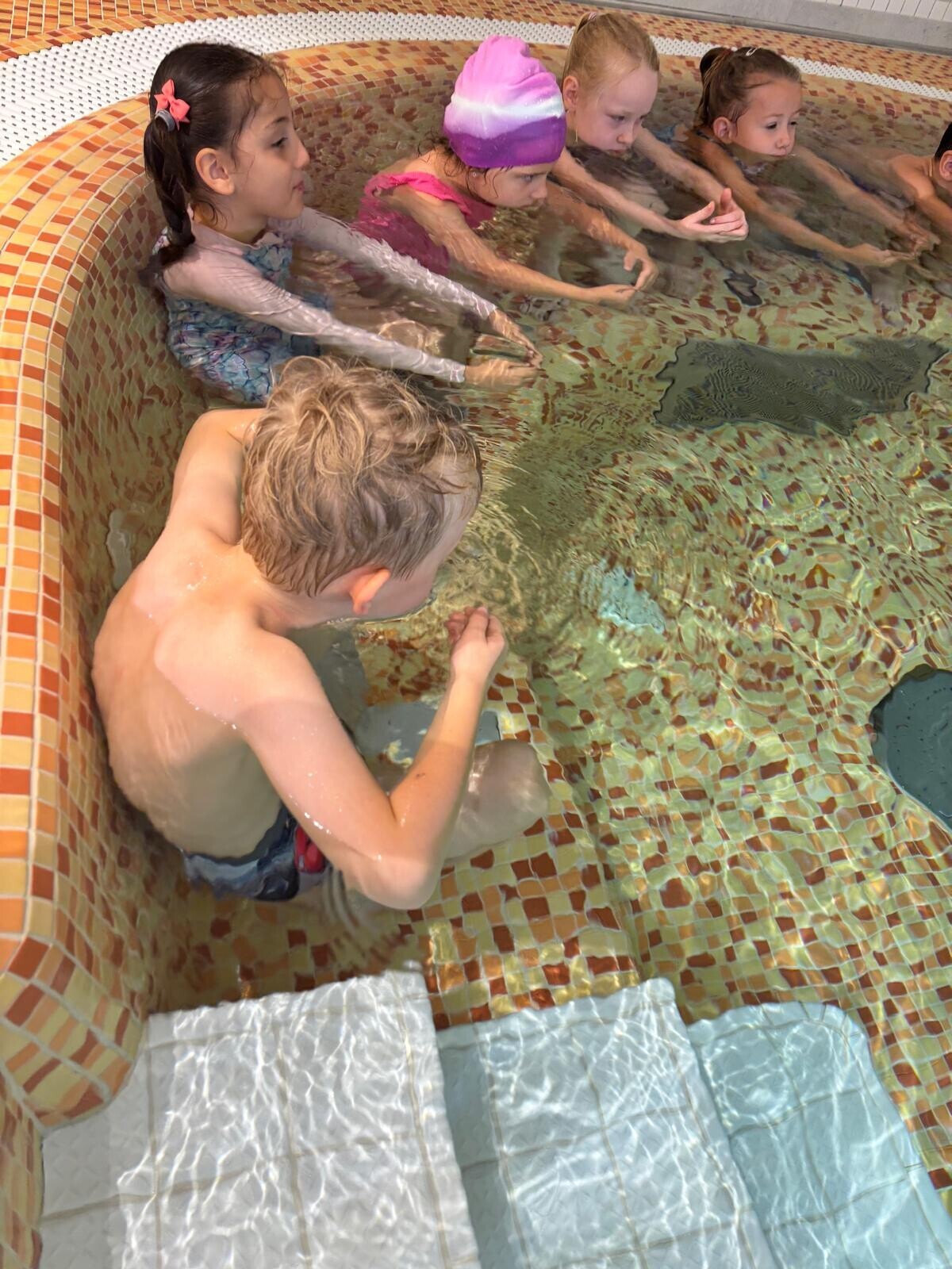 Tentokrát se celá výuka odehrávala ve vířivce. Bublinky měly děti vypnuté, ale voda byla teplá a vyzkoušely si, jaké to je plavat v místě, kde ne všichni dosahnou na zem, učily se plavat v hloubce. Kdo se bál, mohl mít rukávky nebo pás. Našly se i odvážlivci, kteří plavali bez jakýchkoli pomůcek.