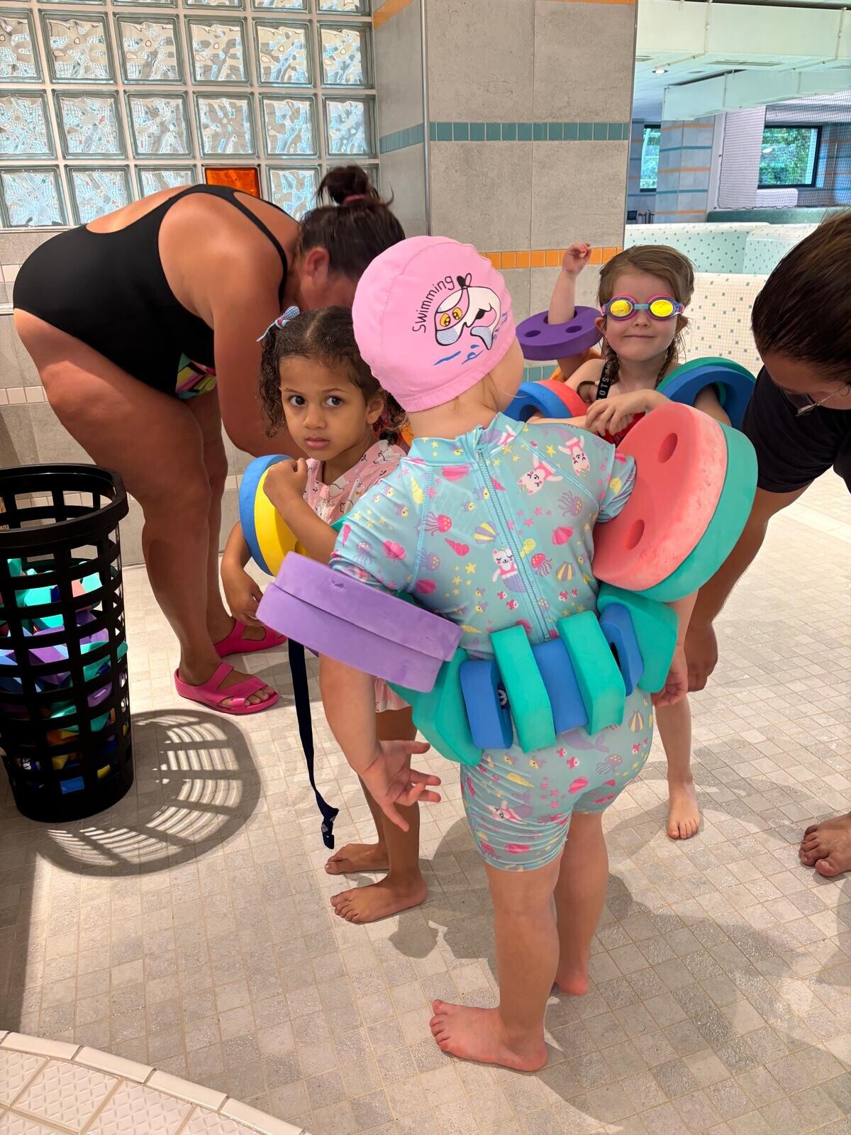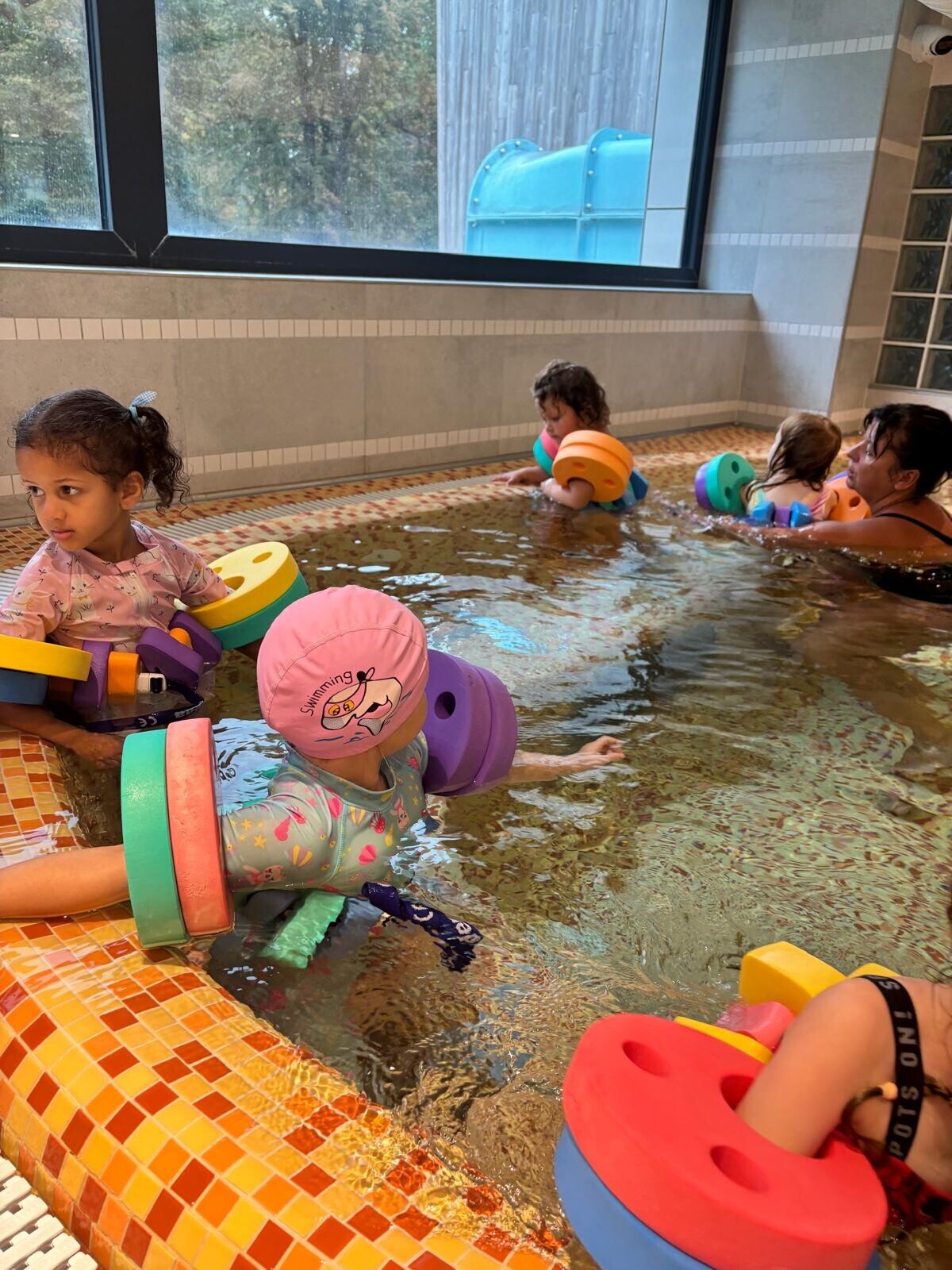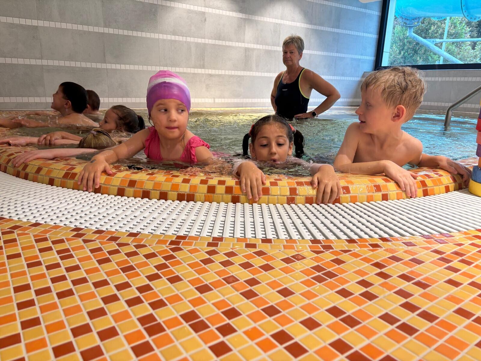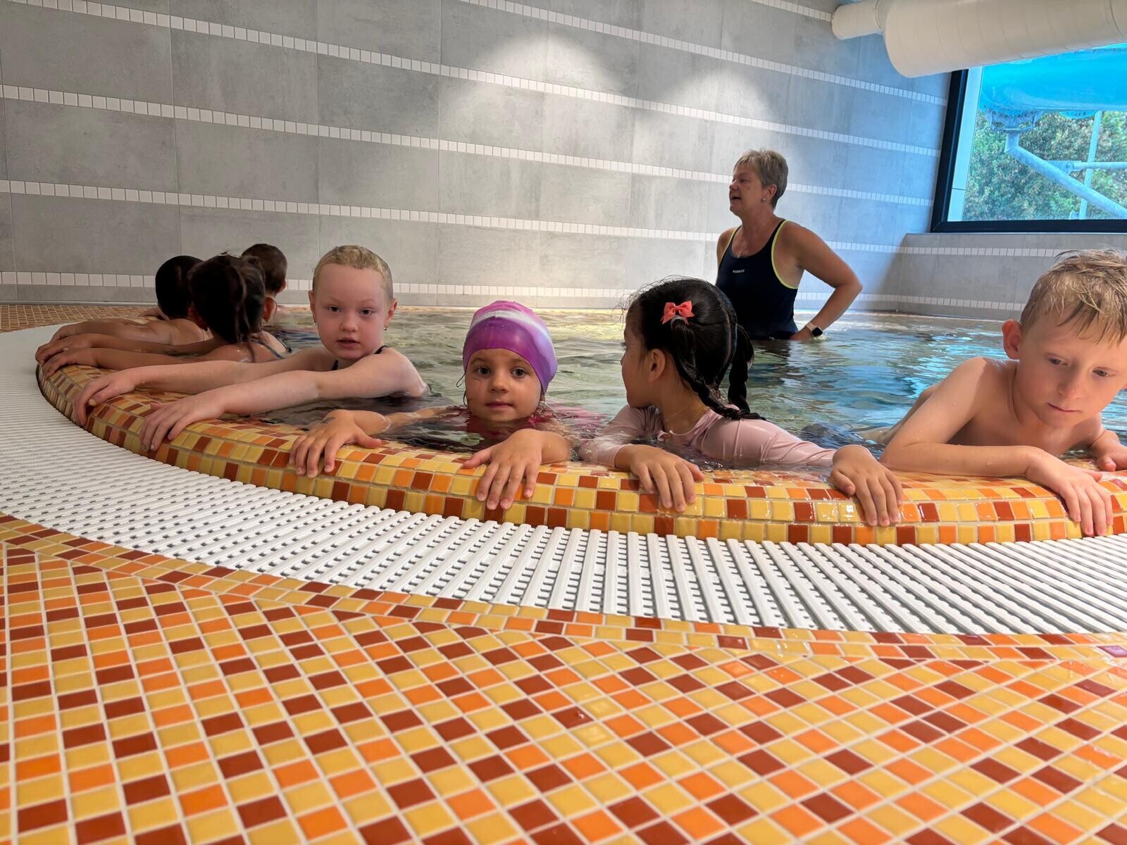 Tentokrát se celá výuka odehrávala ve vířivce. Bublinky měly děti vypnuté, ale voda byla teplá a vyzkoušely si, jaké to je plavat v místě, kde ne všichni dosahnou na zem, učily se plavat v hloubce. Kdo se bál, mohl mít rukávky nebo pás. Našly se i odvážlivci, kteří plavali bez jakýchkoli pomůcek.