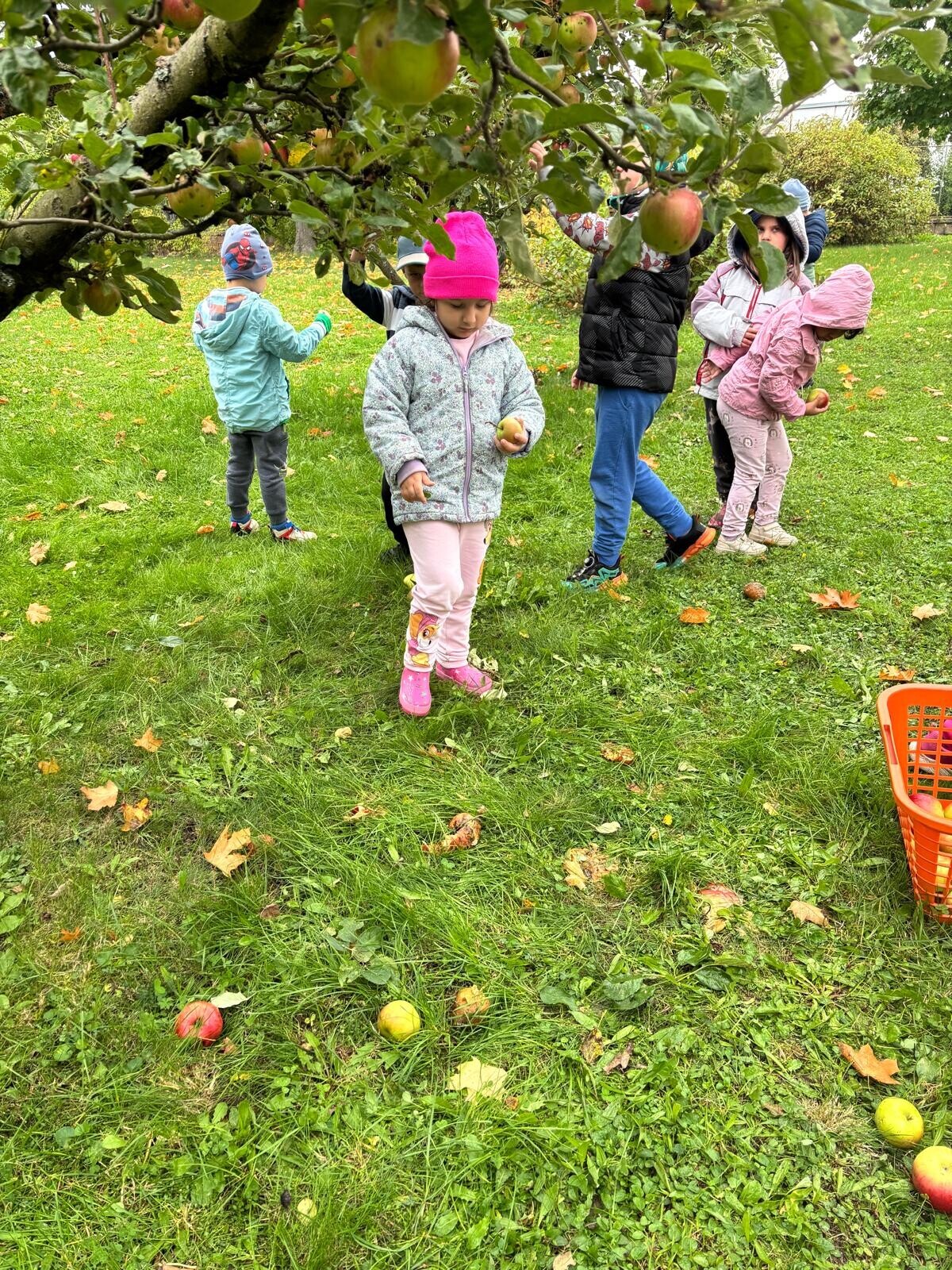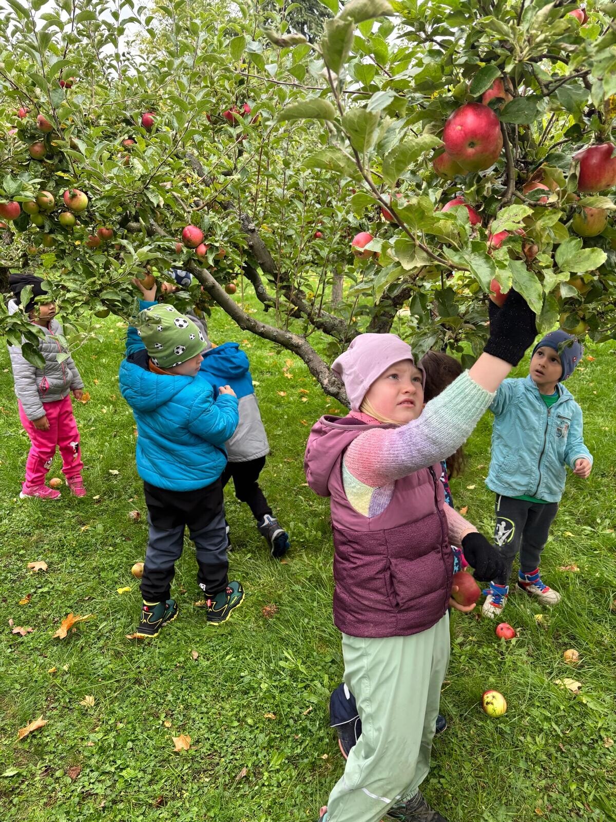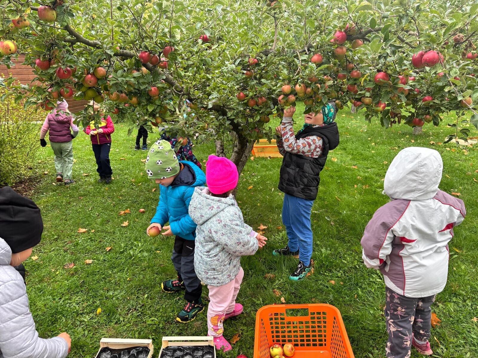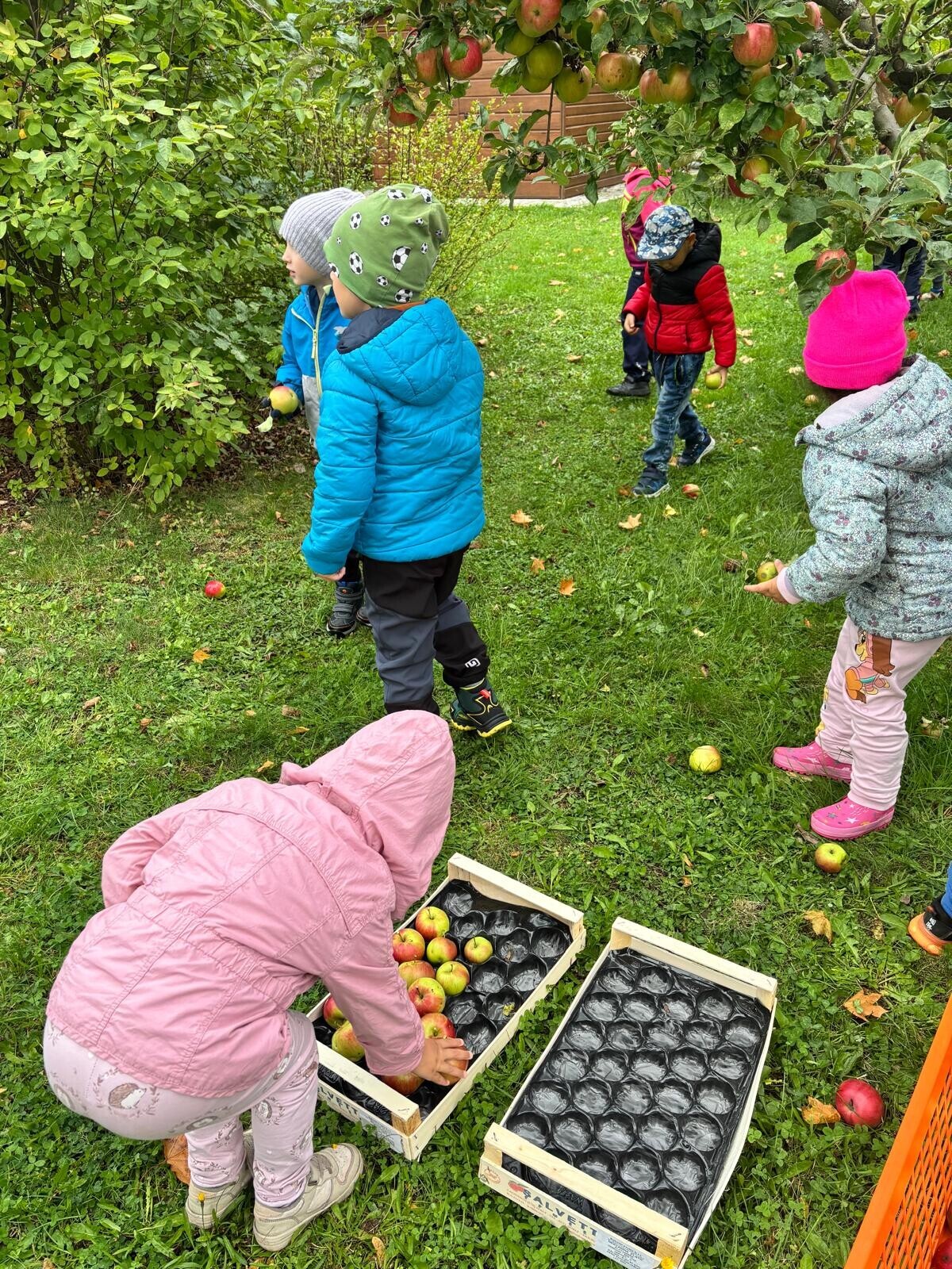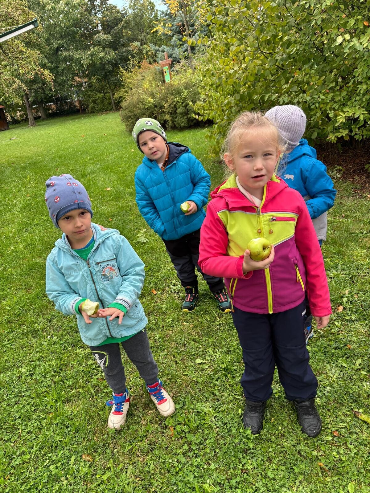 Ve školce máme malý sad jabloní, kde každým rokem pozorujeme, jak stromy kvetou a později rostou jablíčka. Když jablíčka vyrostou a dozrají, mají děti možnost vyzkoušet si, jak se jablka sbírají. A samozřejmě po práci si každý může jablíčka ochutnat. Nasbíraná jablka skladujeme ve školce a dáváme je dětem ke svačince během roku.