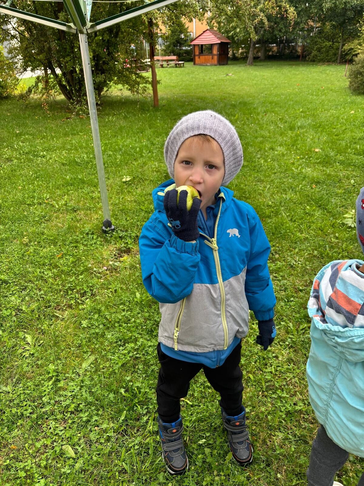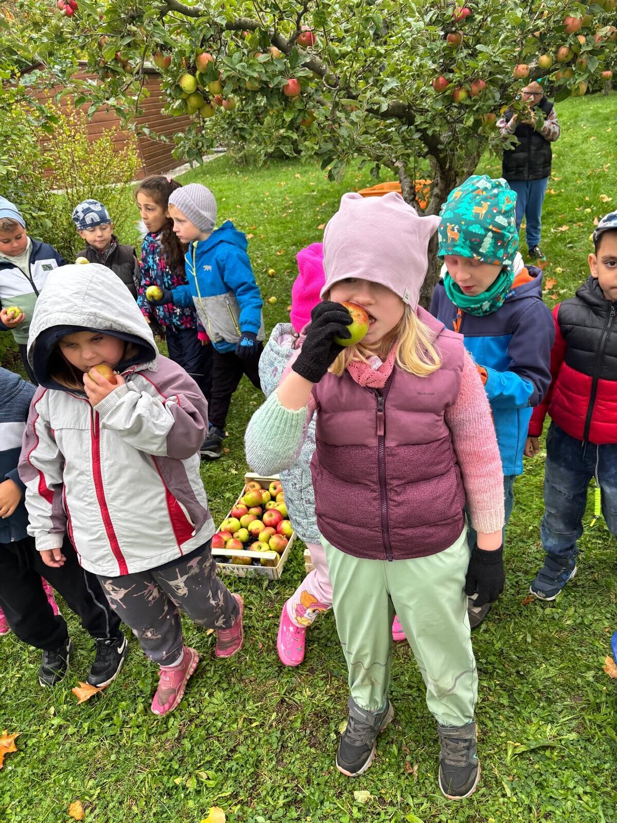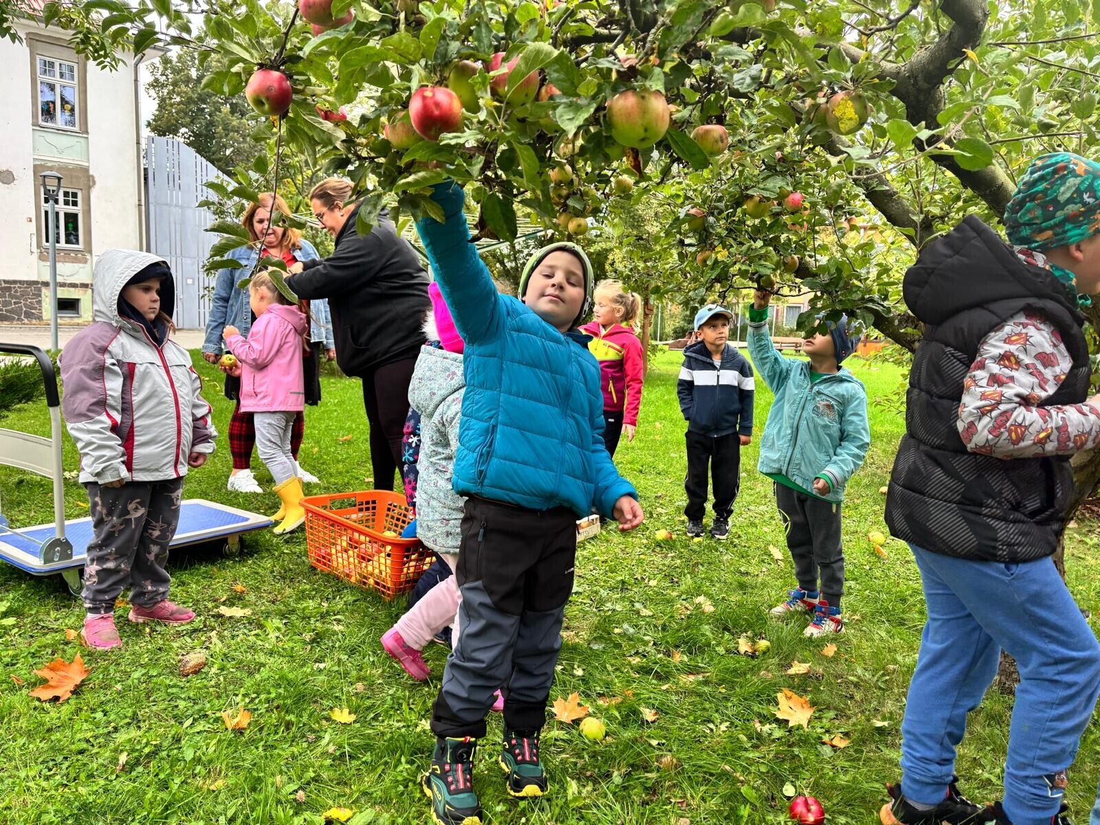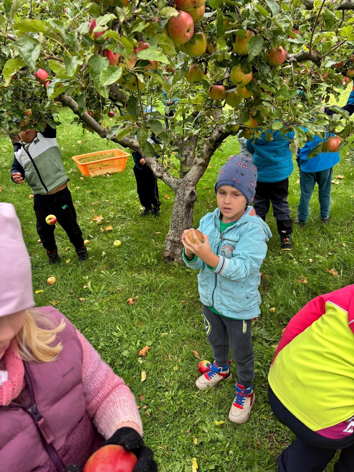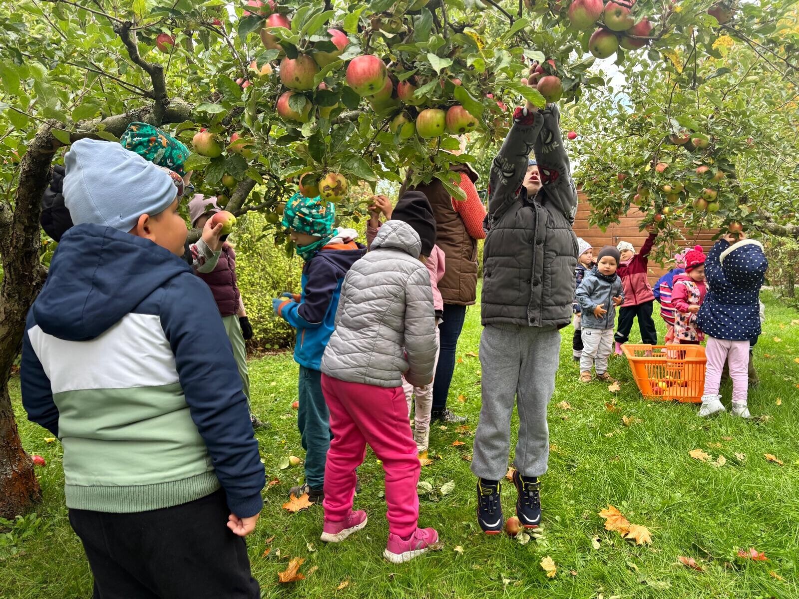 Ve školce máme malý sad jabloní, kde každým rokem pozorujeme, jak stromy kvetou a později rostou jablíčka. Když jablíčka vyrostou a dozrají, mají děti možnost vyzkoušet si, jak se jablka sbírají. A samozřejmě po práci si každý může jablíčka ochutnat. Nasbíraná jablka skladujeme ve školce a dáváme je dětem ke svačince během roku.