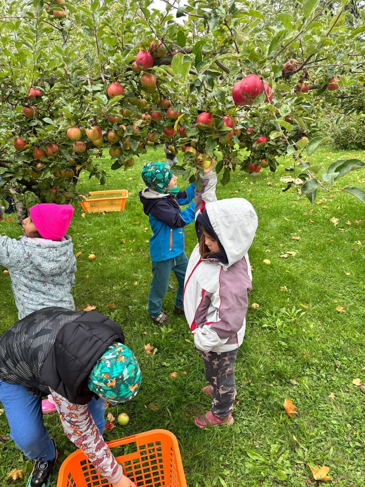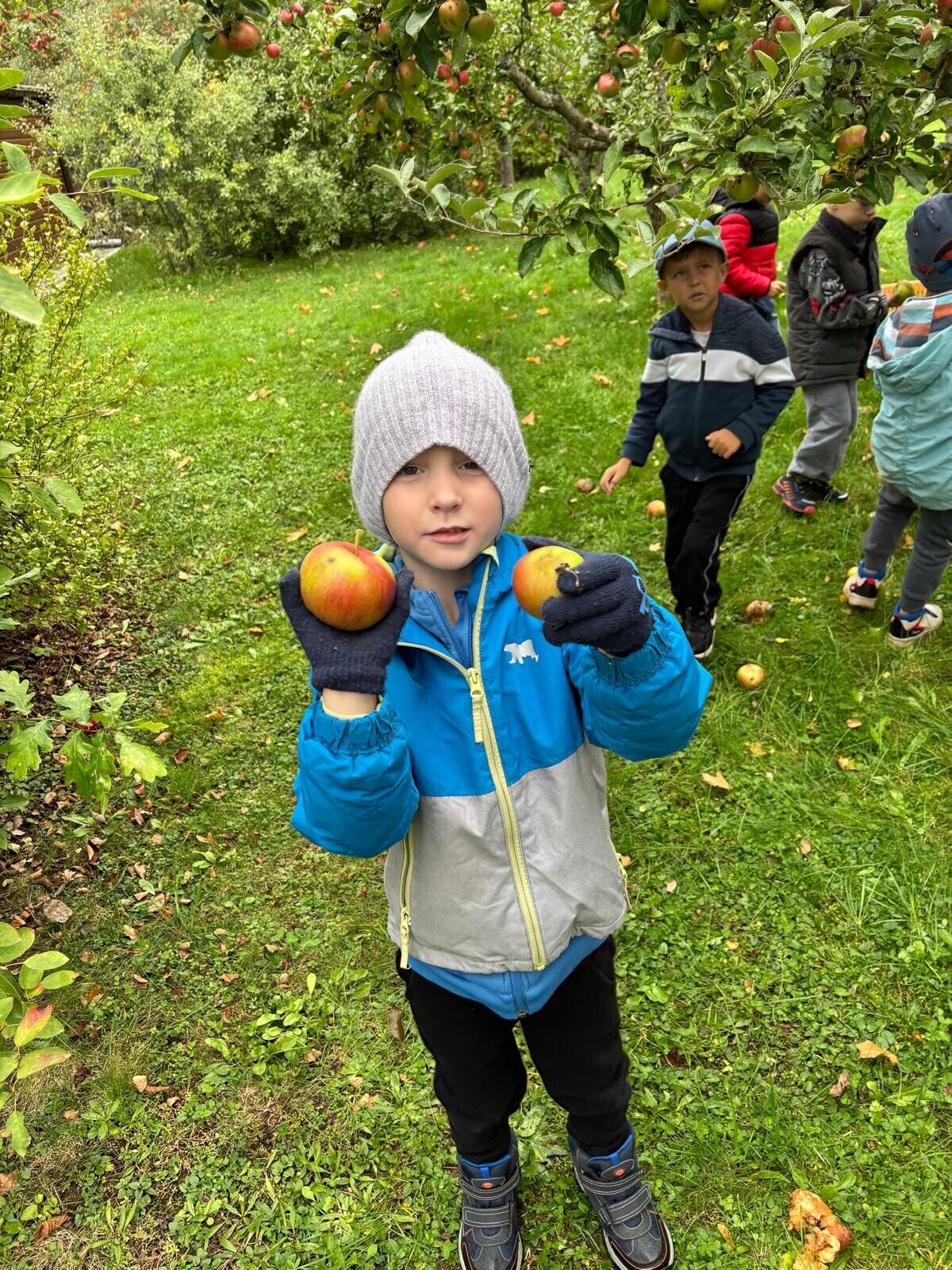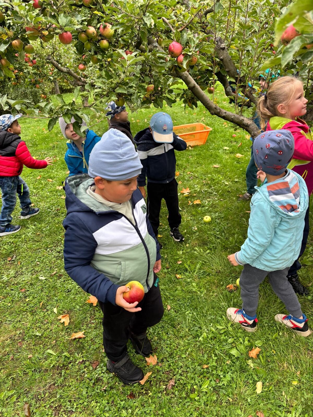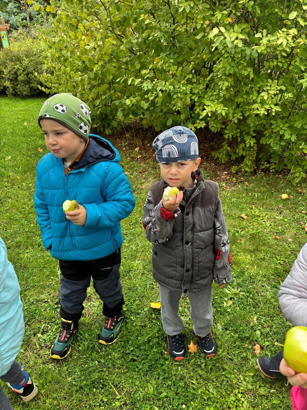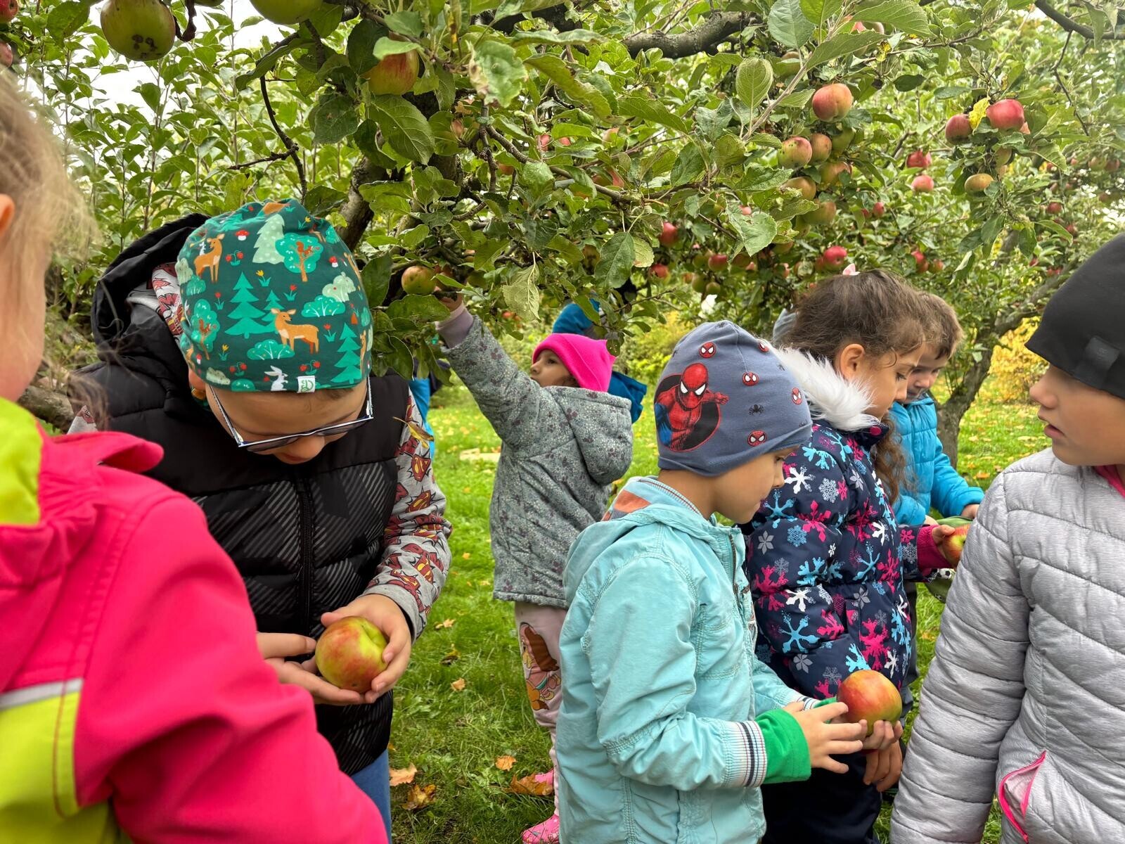Ve školce máme malý sad jabloní, kde každým rokem pozorujeme, jak stromy kvetou a později rostou jablíčka. Když jablíčka vyrostou a dozrají, mají děti možnost vyzkoušet si, jak se jablka sbírají. A samozřejmě po práci si každý může jablíčka ochutnat. Nasbíraná jablka skladujeme ve školce a dáváme je dětem ke svačince během roku.