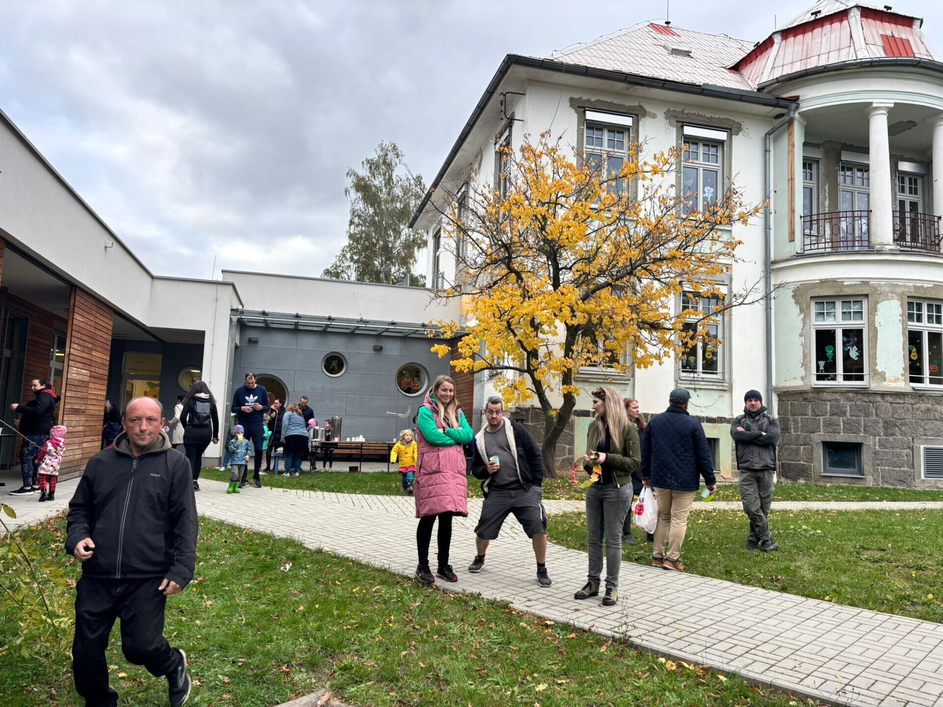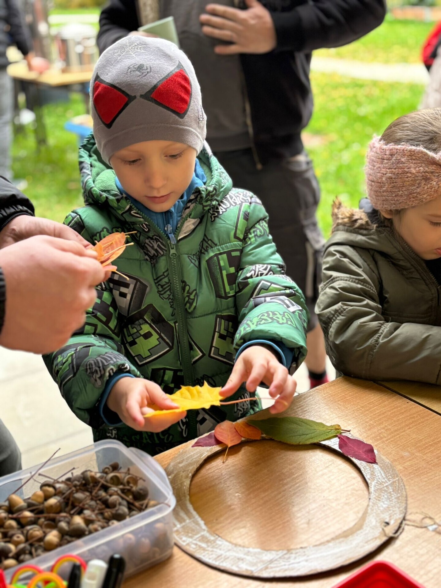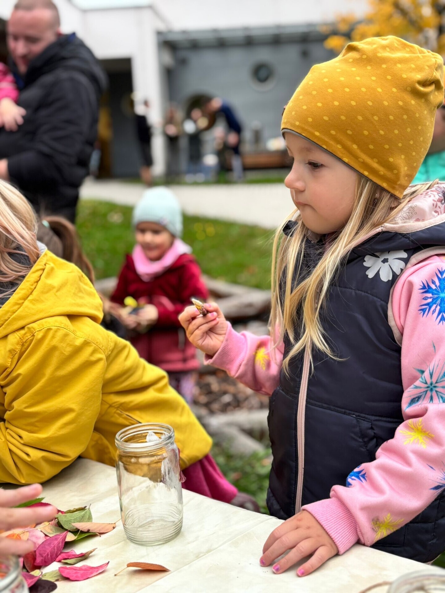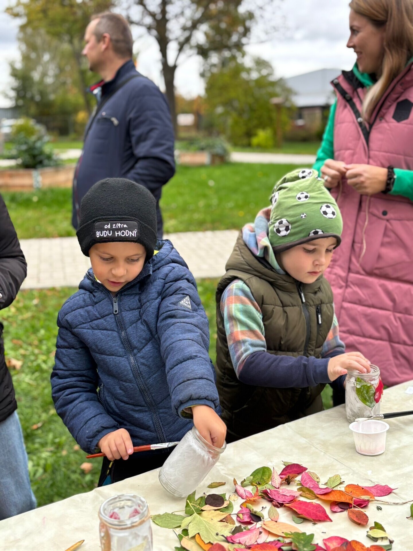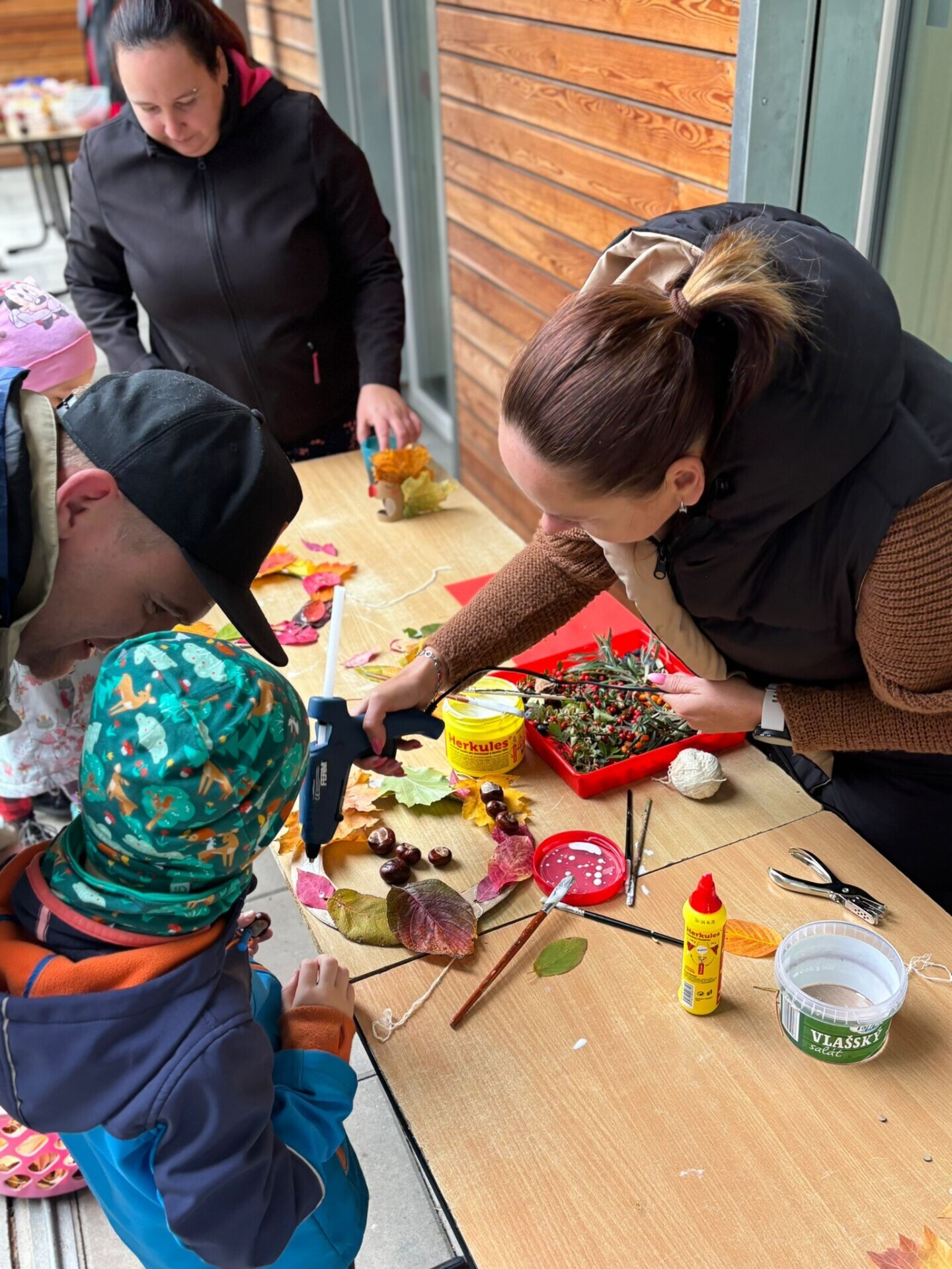 Ve čtvrtek 16. 10. 2025 jsme na zahradě naší MŠ uspořádali podzimní dílničky. Dílničky byly celkem tři (za každou třídu jedna), ve kterých jste si s dětmi mohli vytvořit podzimní dekorace z přírodnin. V dílničce připravené třídou Motýlků byla možnost vyrobit si skřítka Podzimníčka z listů a roličky od toaletního papíru. U stanoviště ze třídy Ježečků se vyráběl podzimní věnec z listů a kaštanů a u stolečku Soviček se vyrábělo opět z listí. Děti, ale i rodiče, si u tohoto stolečku mohli vyrobit podzimní svícen ze sklenic a listí. Abychom si čekání na volné stanoviště zkrátili, byla připravena i ukázka moštování jablek, ochutnávka moštu i sladké občerstvení od naší paní školnice Marcely. Na závěr dne byl zapálen ohýnek, na kterém si každý mohl upéct v tomto roce (nejspíše) poslední vuřty či klobásy.