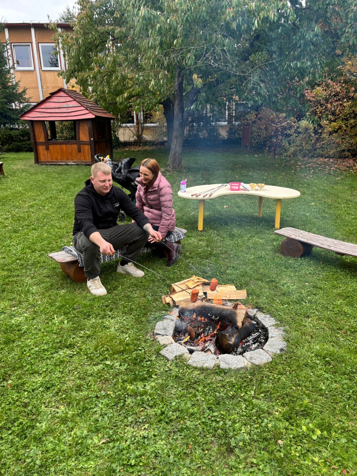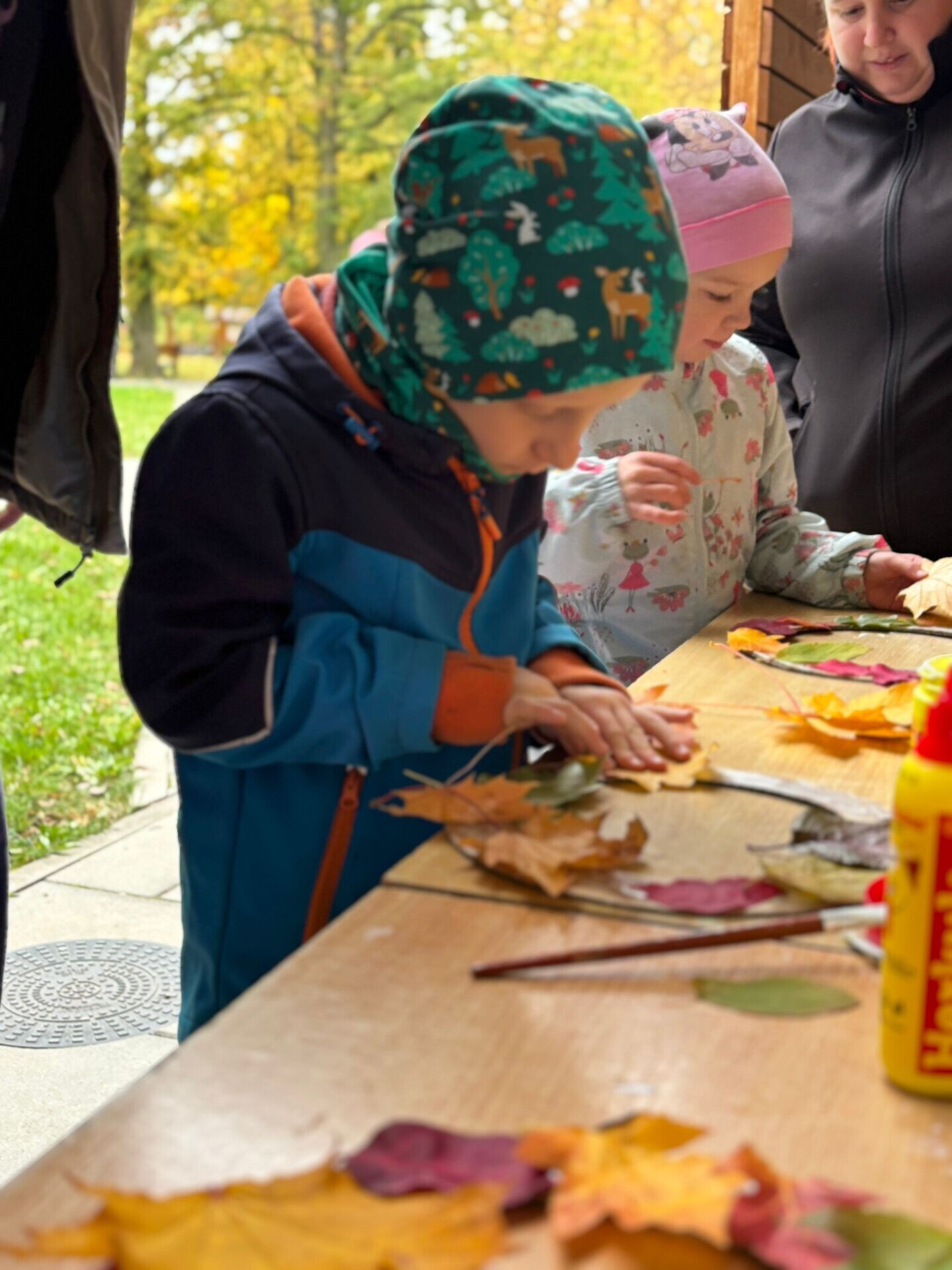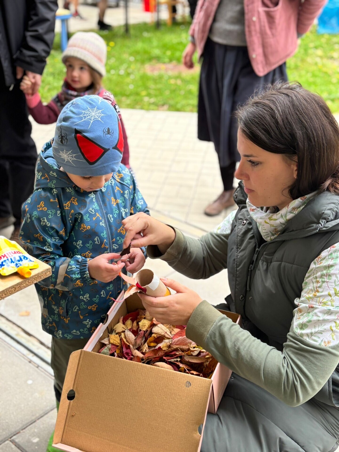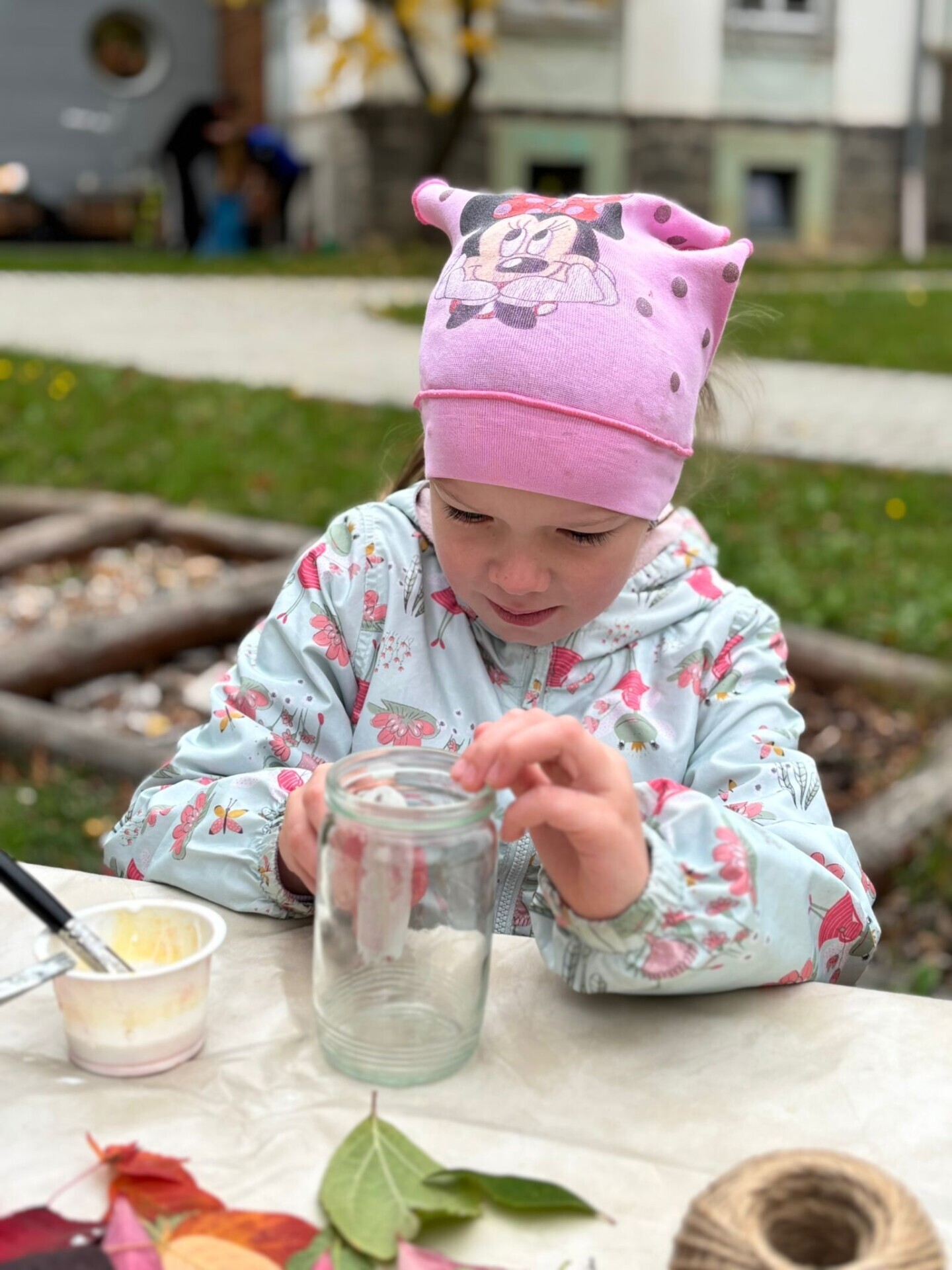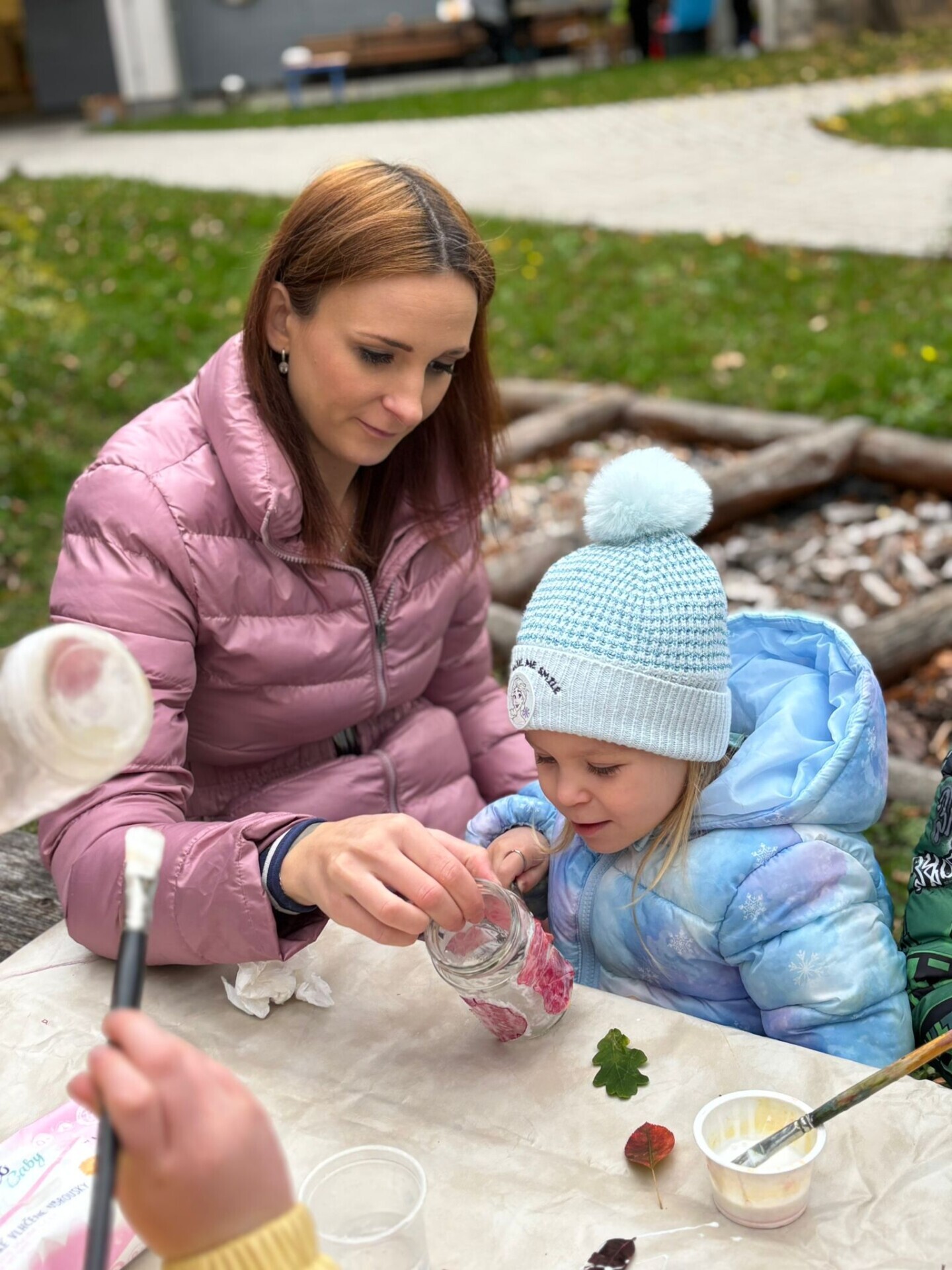 Ve čtvrtek 16. 10. 2025 jsme na zahradě naší MŠ uspořádali podzimní dílničky. Dílničky byly celkem tři (za každou třídu jedna), ve kterých jste si s dětmi mohli vytvořit podzimní dekorace z přírodnin. V dílničce připravené třídou Motýlků byla možnost vyrobit si skřítka Podzimníčka z listů a roličky od toaletního papíru. U stanoviště ze třídy Ježečků se vyráběl podzimní věnec z listů a kaštanů a u stolečku Soviček se vyrábělo opět z listí. Děti, ale i rodiče, si u tohoto stolečku mohli vyrobit podzimní svícen ze sklenic a listí. Abychom si čekání na volné stanoviště zkrátili, byla připravena i ukázka moštování jablek, ochutnávka moštu i sladké občerstvení od naší paní školnice Marcely. Na závěr dne byl zapálen ohýnek, na kterém si každý mohl upéct v tomto roce (nejspíše) poslední vuřty či klobásy.