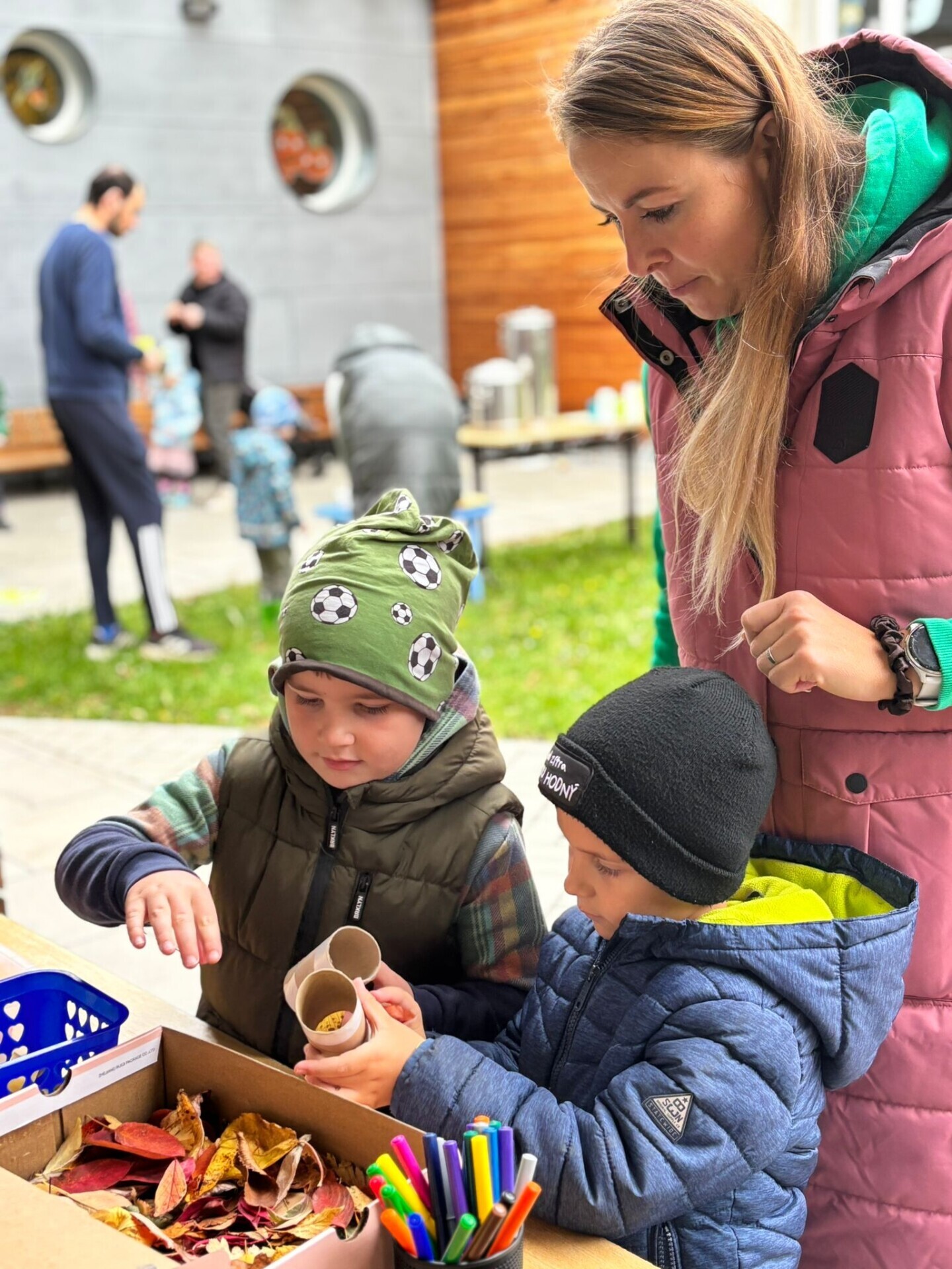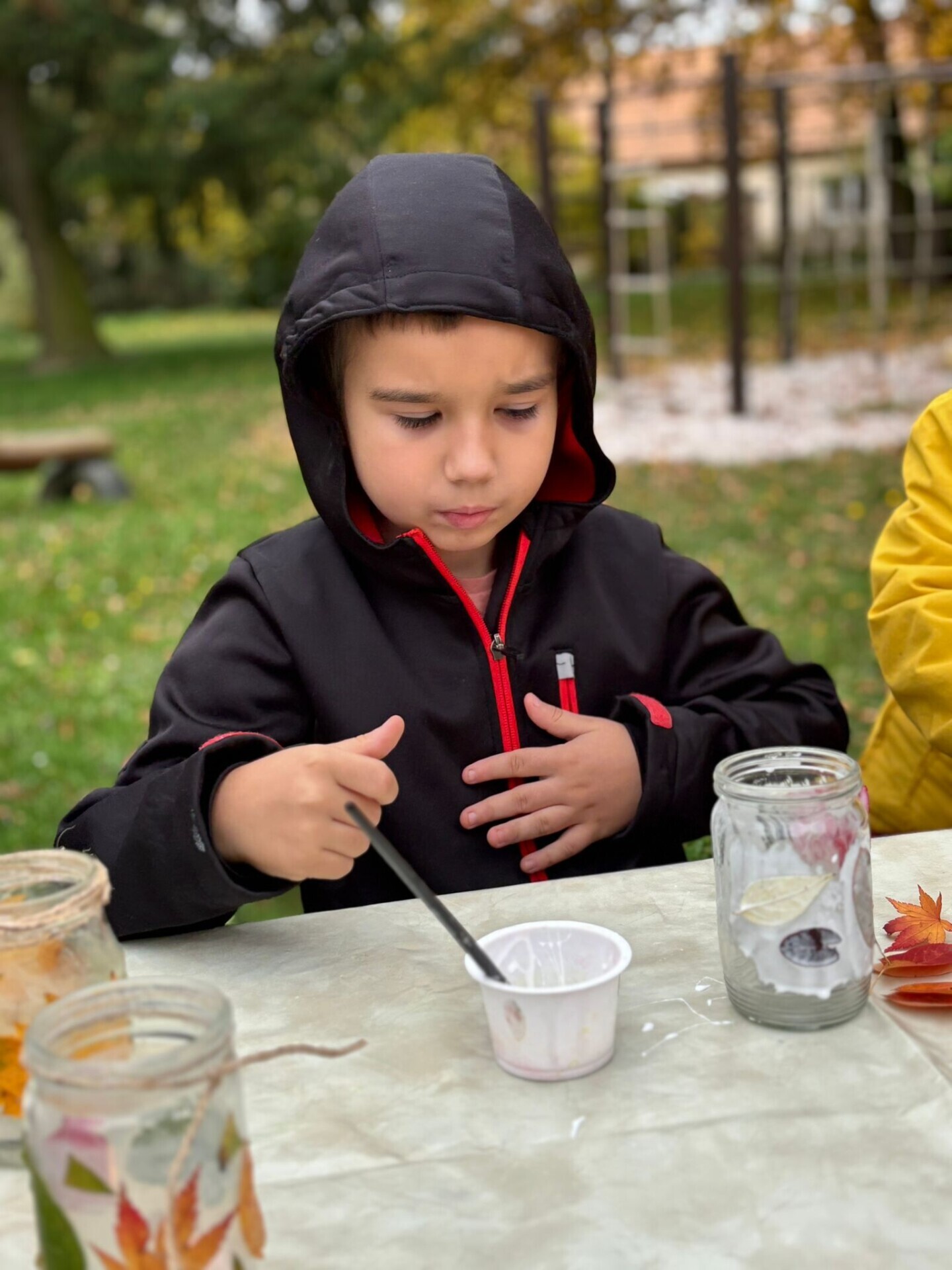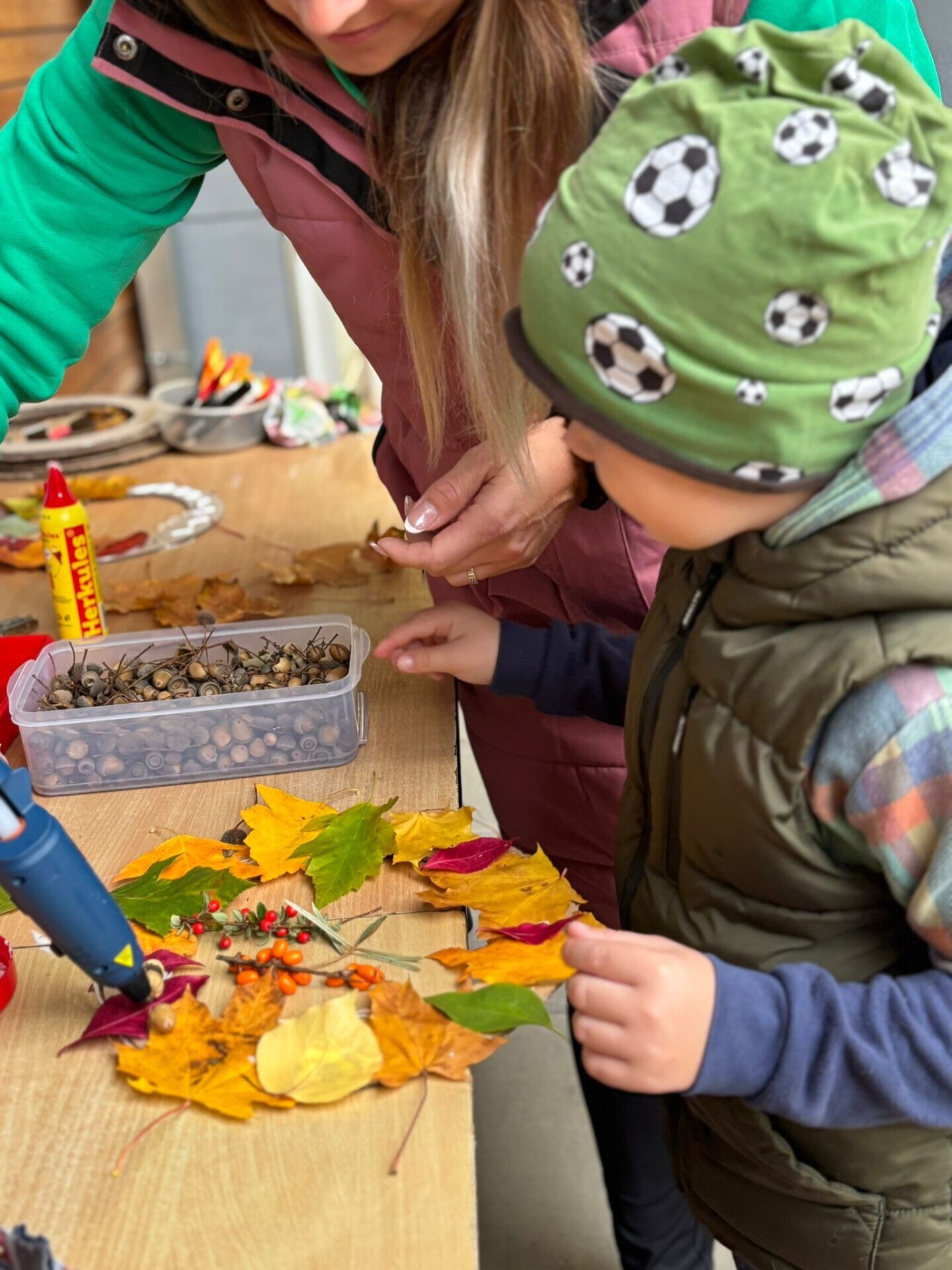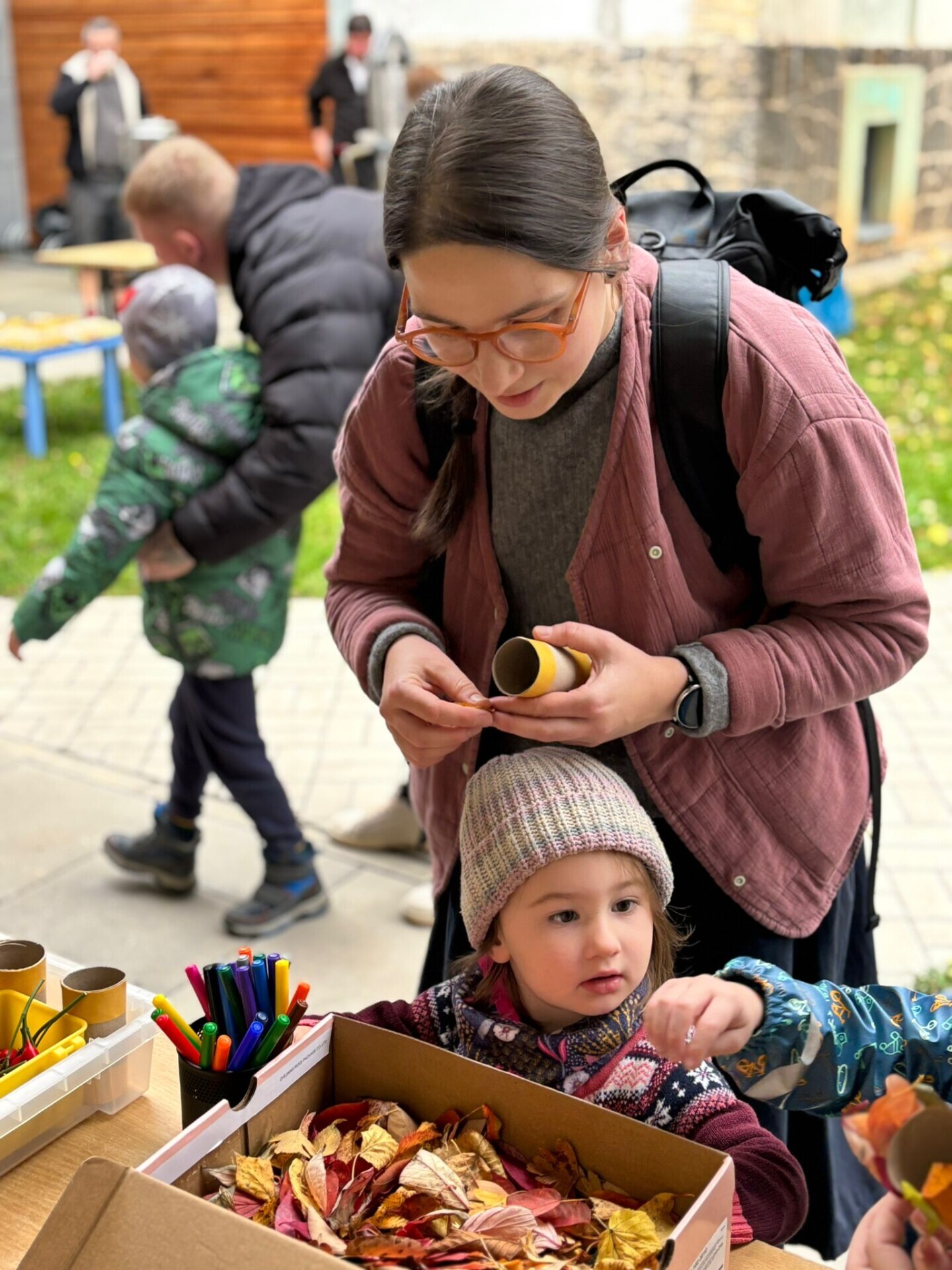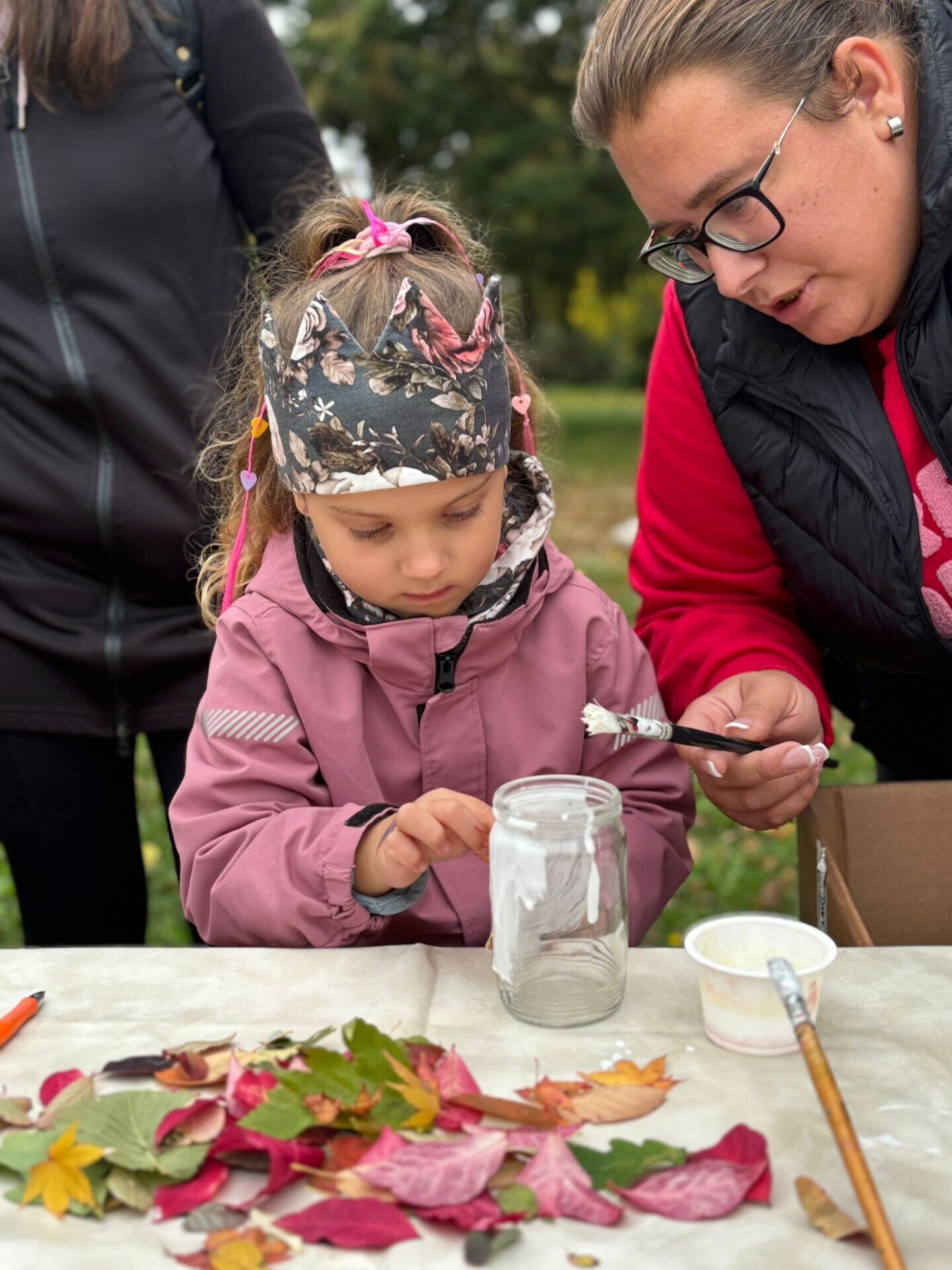 Ve čtvrtek 16. 10. 2025 jsme na zahradě naší MŠ uspořádali podzimní dílničky. Dílničky byly celkem tři (za každou třídu jedna), ve kterých jste si s dětmi mohli vytvořit podzimní dekorace z přírodnin. V dílničce připravené třídou Motýlků byla možnost vyrobit si skřítka Podzimníčka z listů a roličky od toaletního papíru. U stanoviště ze třídy Ježečků se vyráběl podzimní věnec z listů a kaštanů a u stolečku Soviček se vyrábělo opět z listí. Děti, ale i rodiče, si u tohoto stolečku mohli vyrobit podzimní svícen ze sklenic a listí. Abychom si čekání na volné stanoviště zkrátili, byla připravena i ukázka moštování jablek, ochutnávka moštu i sladké občerstvení od naší paní školnice Marcely. Na závěr dne byl zapálen ohýnek, na kterém si každý mohl upéct v tomto roce (nejspíše) poslední vuřty či klobásy.