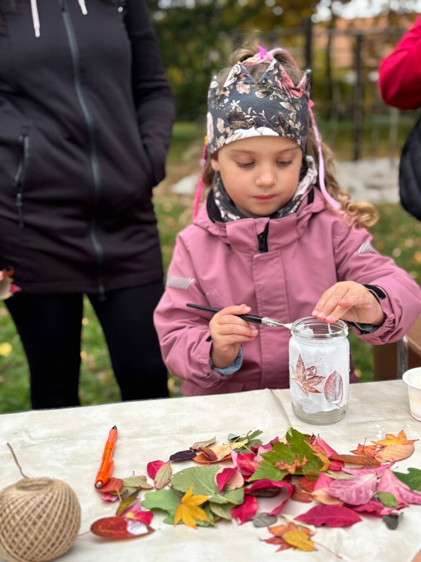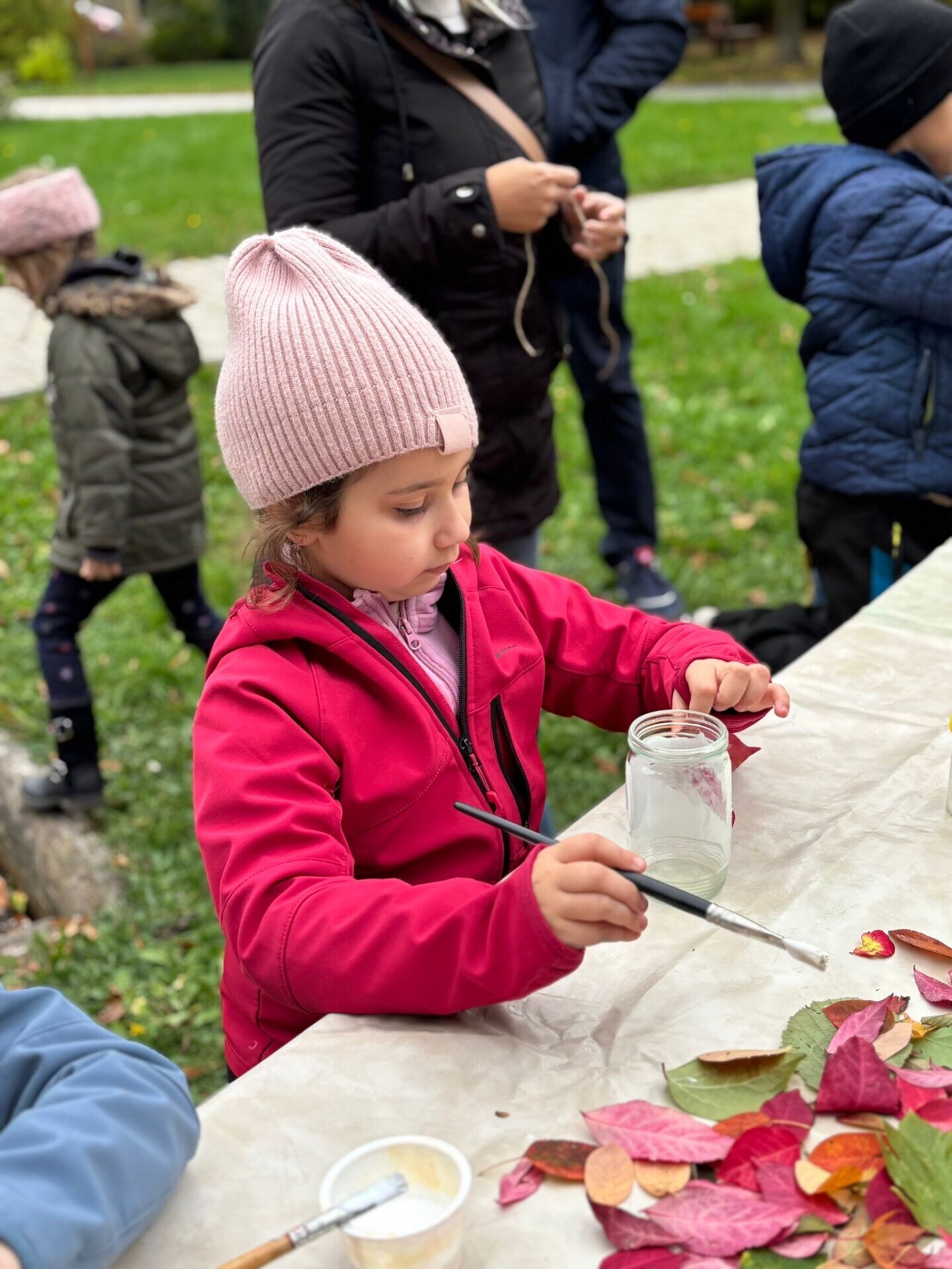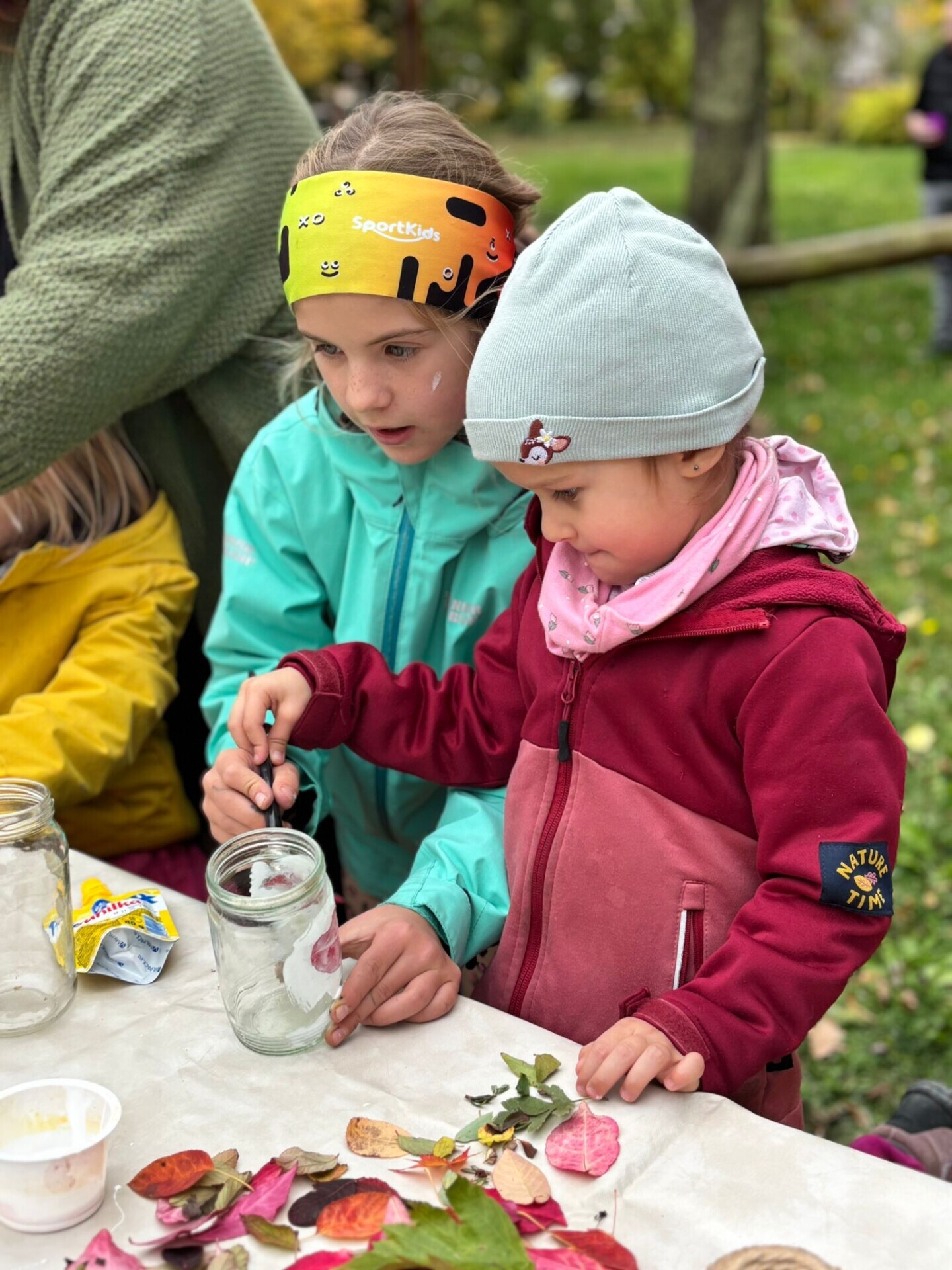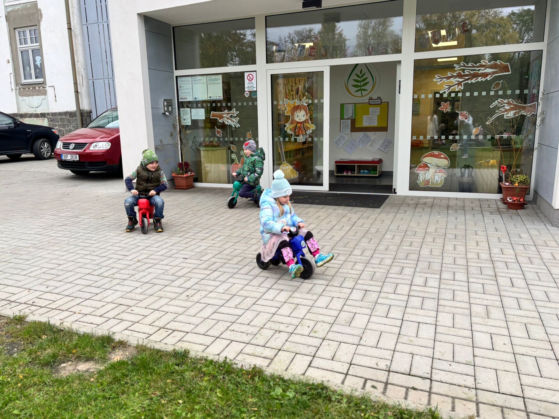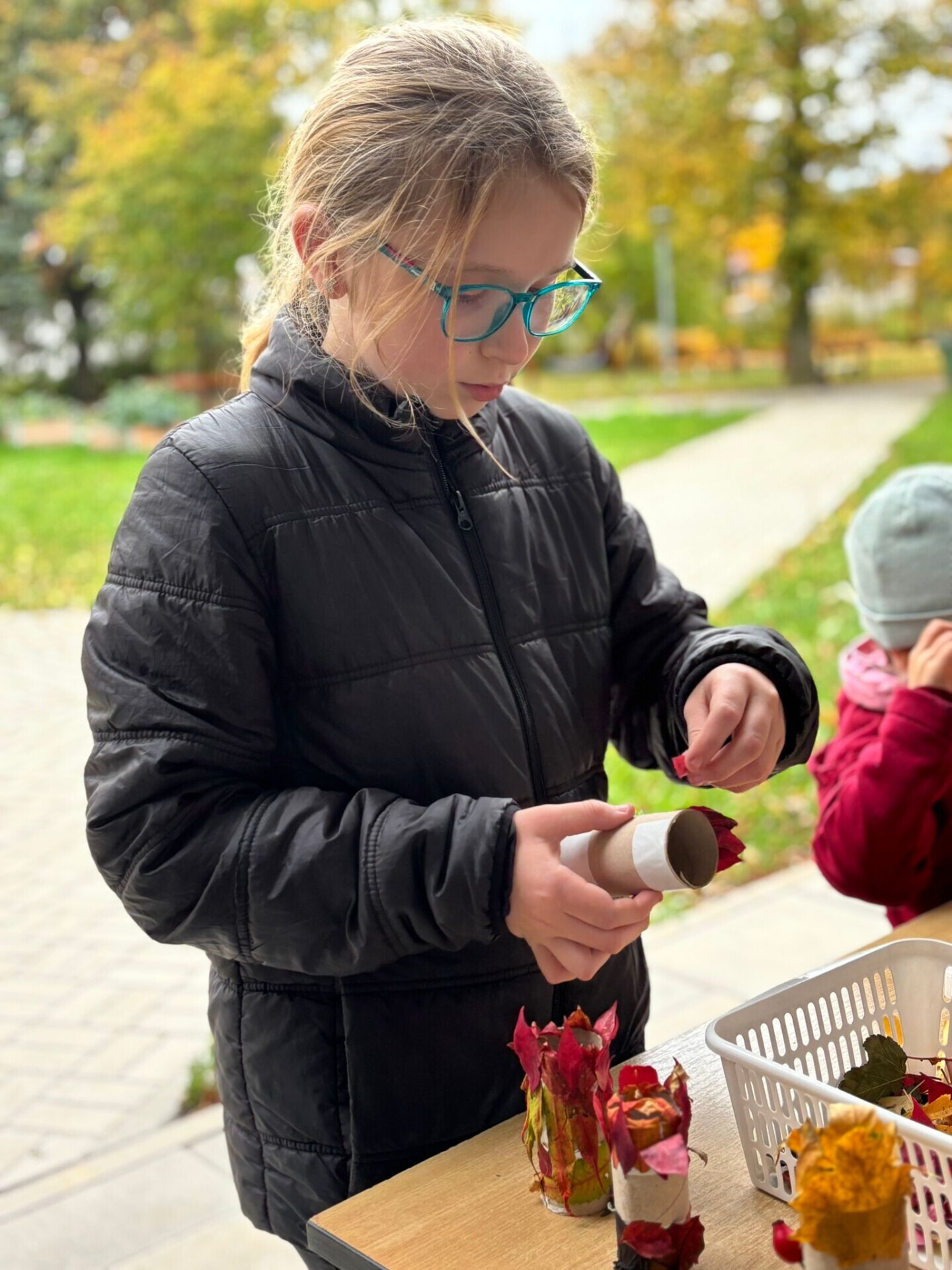 Ve čtvrtek 16. 10. 2025 jsme na zahradě naší MŠ uspořádali podzimní dílničky. Dílničky byly celkem tři (za každou třídu jedna), ve kterých jste si s dětmi mohli vytvořit podzimní dekorace z přírodnin. V dílničce připravené třídou Motýlků byla možnost vyrobit si skřítka Podzimníčka z listů a roličky od toaletního papíru. U stanoviště ze třídy Ježečků se vyráběl podzimní věnec z listů a kaštanů a u stolečku Soviček se vyrábělo opět z listí. Děti, ale i rodiče, si u tohoto stolečku mohli vyrobit podzimní svícen ze sklenic a listí. Abychom si čekání na volné stanoviště zkrátili, byla připravena i ukázka moštování jablek, ochutnávka moštu i sladké občerstvení od naší paní školnice Marcely. Na závěr dne byl zapálen ohýnek, na kterém si každý mohl upéct v tomto roce (nejspíše) poslední vuřty či klobásy.