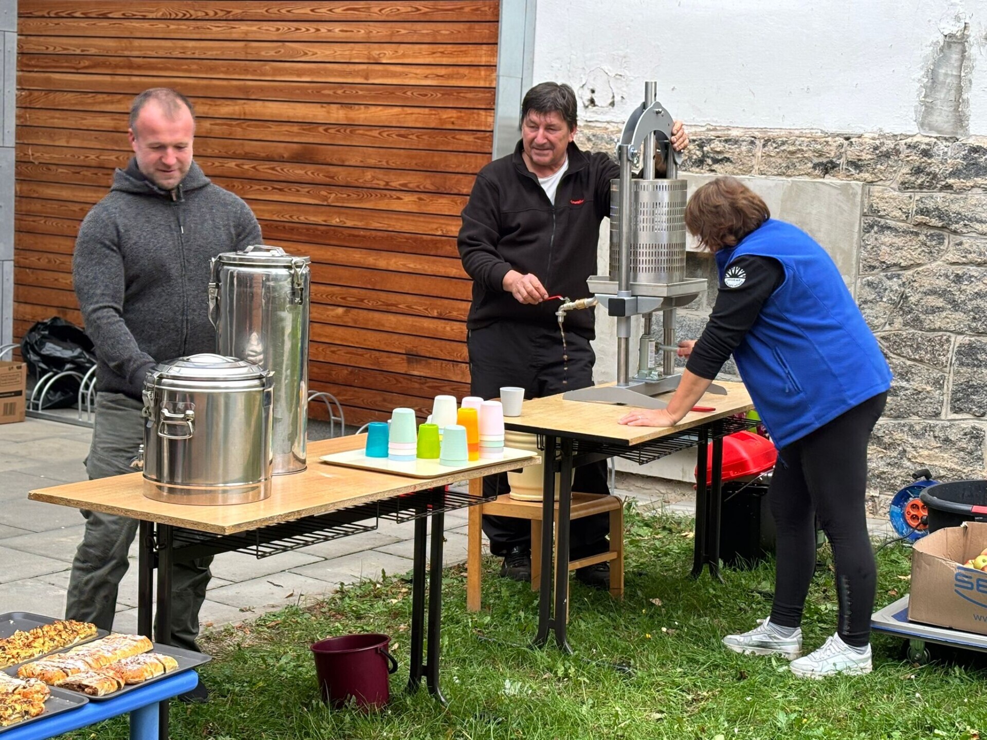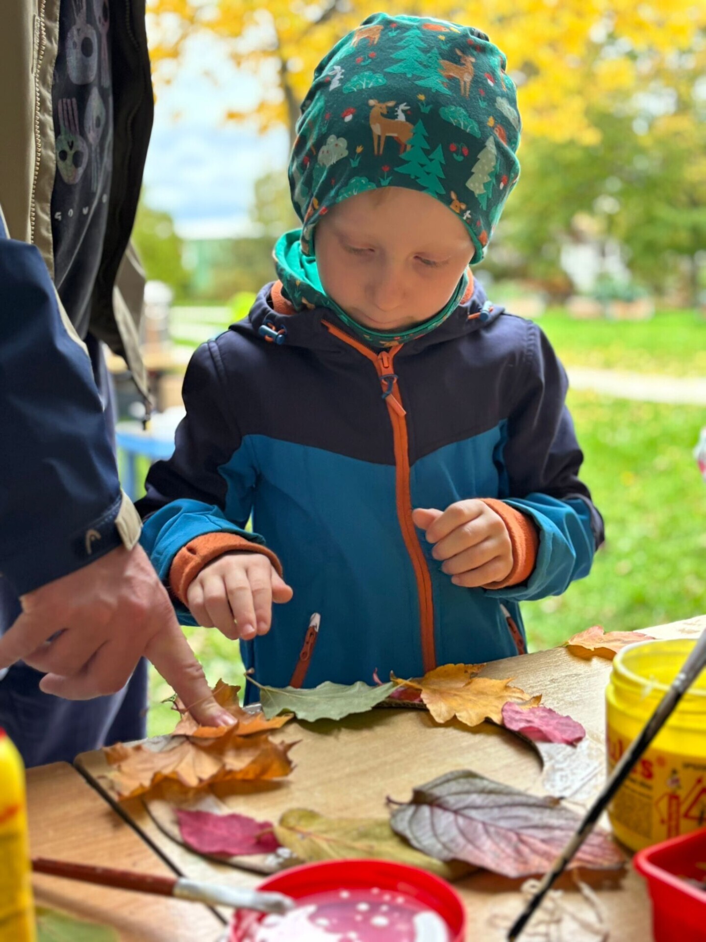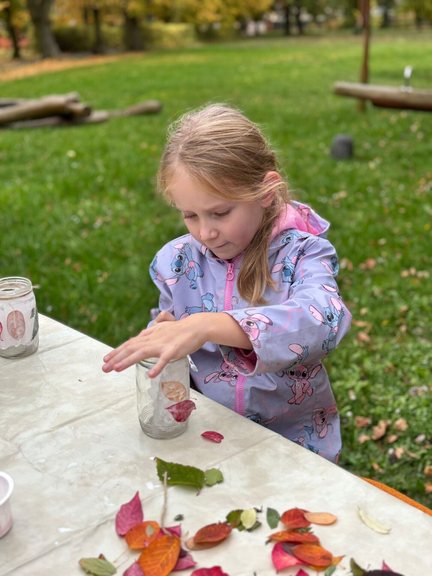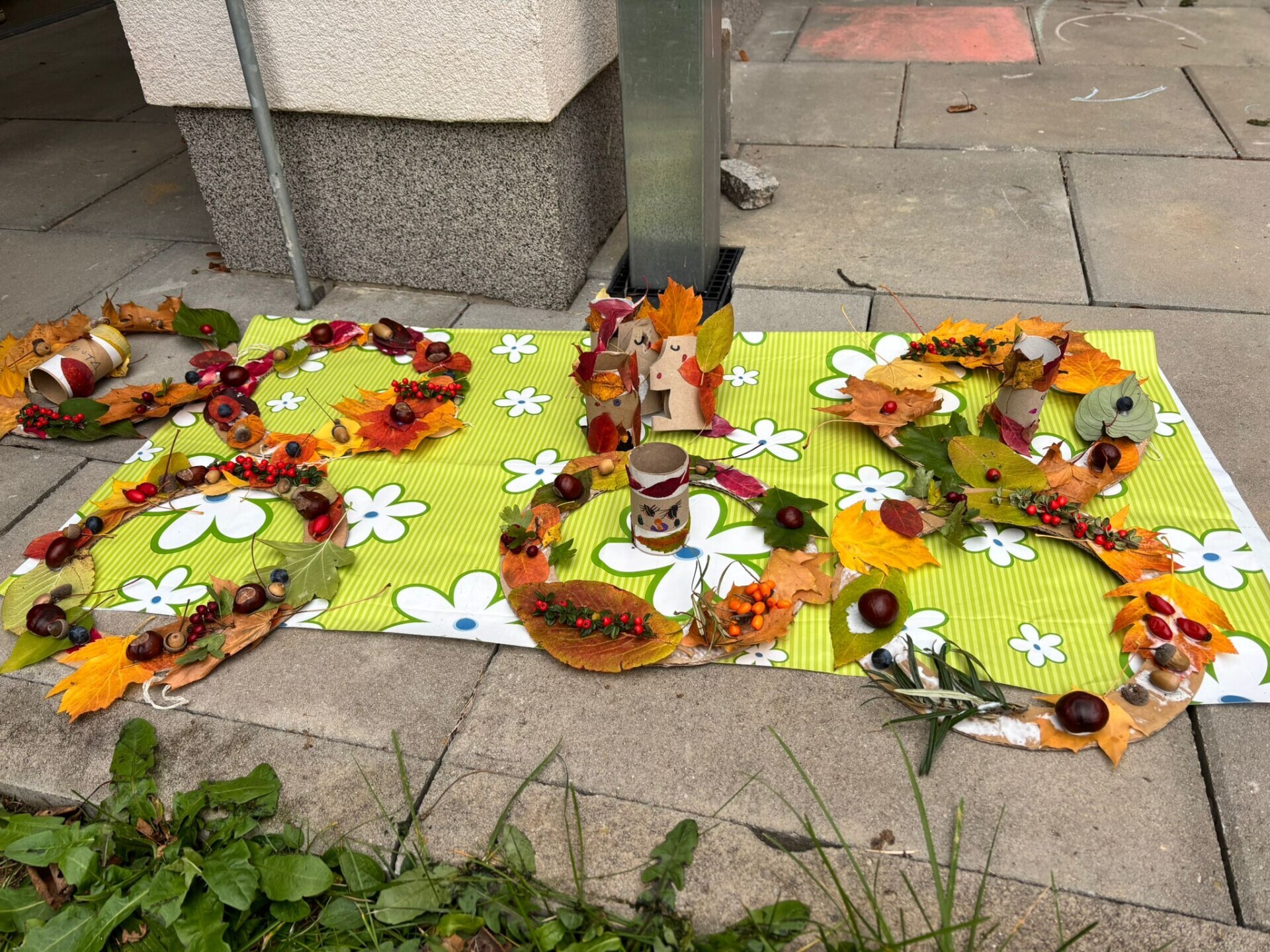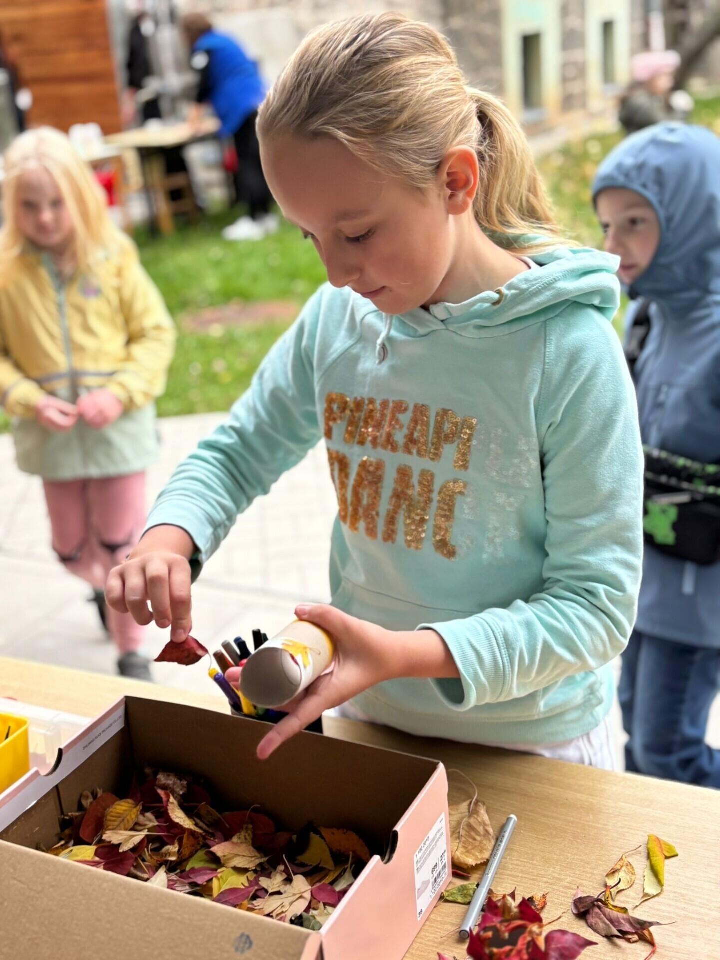 Ve čtvrtek 16. 10. 2025 jsme na zahradě naší MŠ uspořádali podzimní dílničky. Dílničky byly celkem tři (za každou třídu jedna), ve kterých jste si s dětmi mohli vytvořit podzimní dekorace z přírodnin. V dílničce připravené třídou Motýlků byla možnost vyrobit si skřítka Podzimníčka z listů a roličky od toaletního papíru. U stanoviště ze třídy Ježečků se vyráběl podzimní věnec z listů a kaštanů a u stolečku Soviček se vyrábělo opět z listí. Děti, ale i rodiče, si u tohoto stolečku mohli vyrobit podzimní svícen ze sklenic a listí. Abychom si čekání na volné stanoviště zkrátili, byla připravena i ukázka moštování jablek, ochutnávka moštu i sladké občerstvení od naší paní školnice Marcely. Na závěr dne byl zapálen ohýnek, na kterém si každý mohl upéct v tomto roce (nejspíše) poslední vuřty či klobásy.