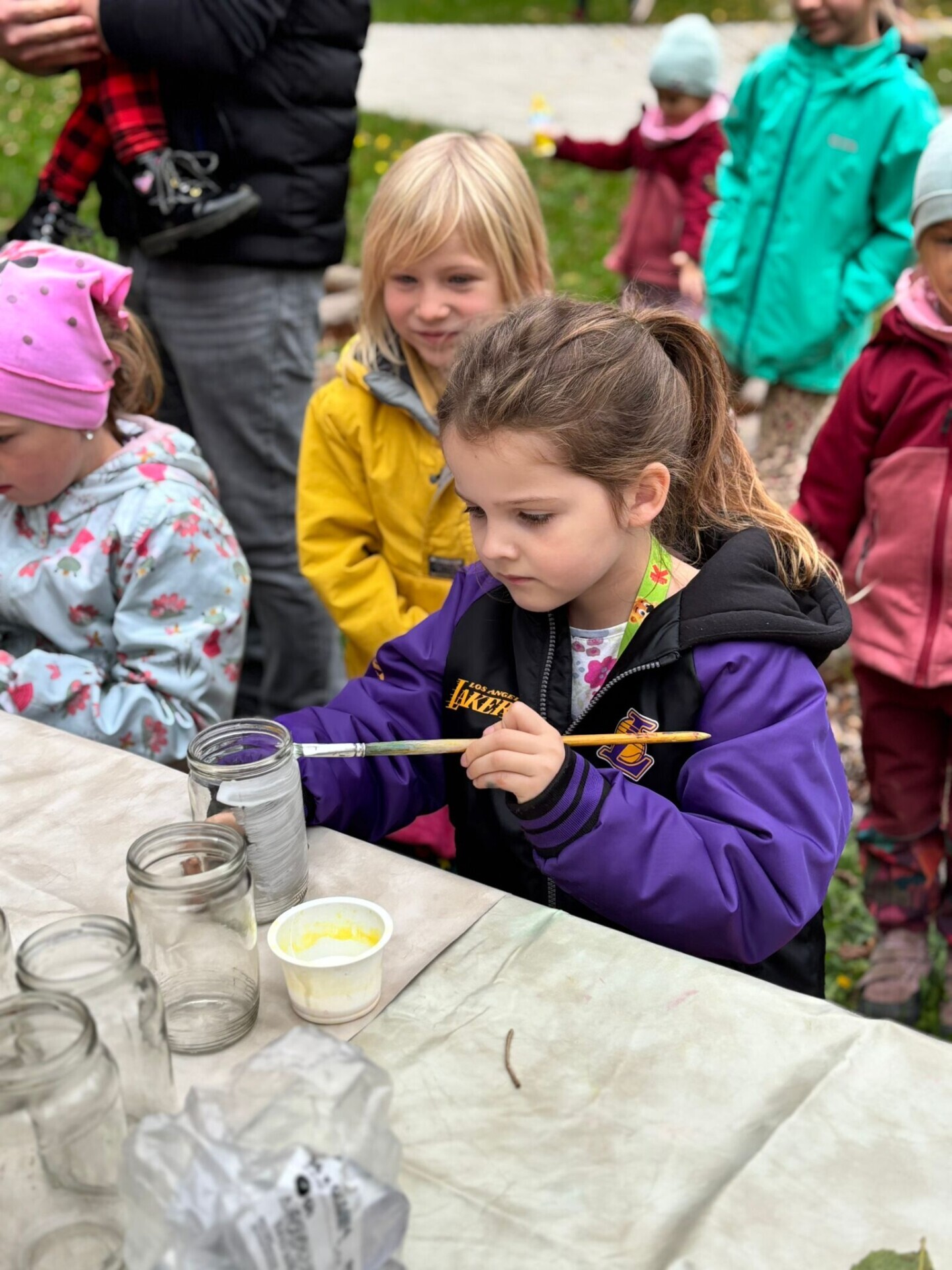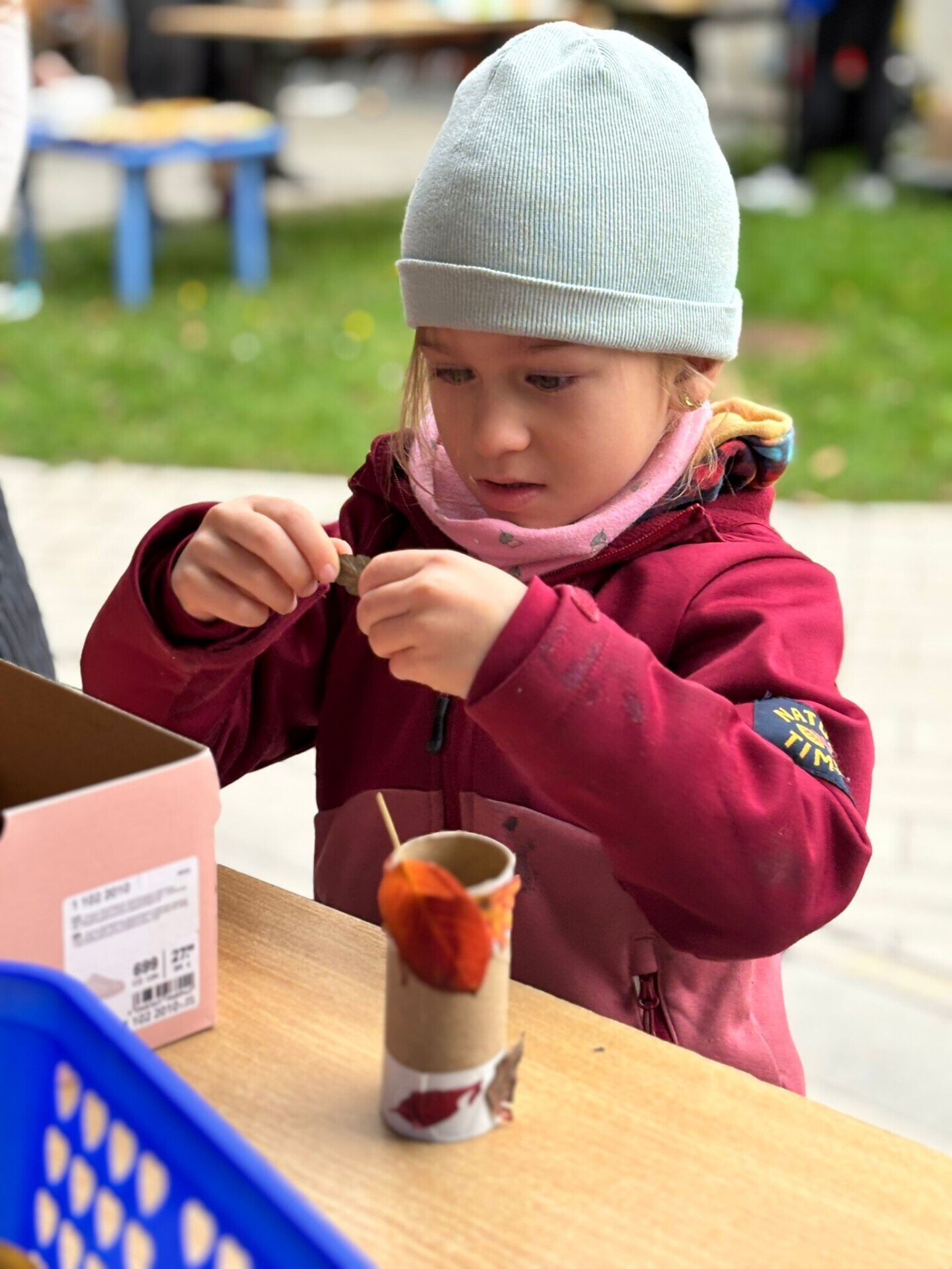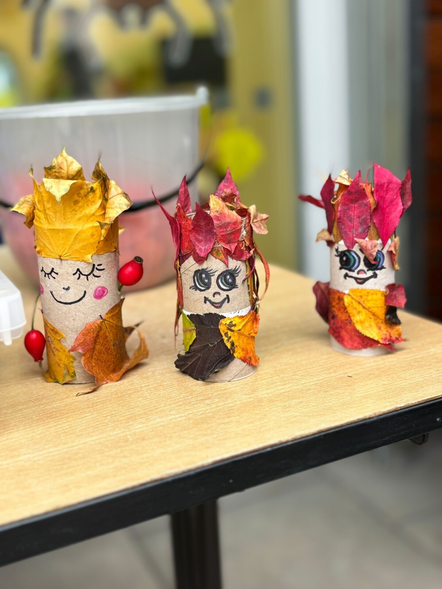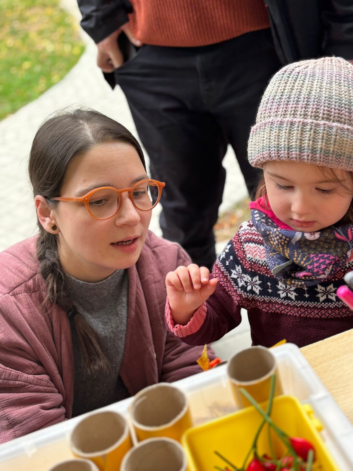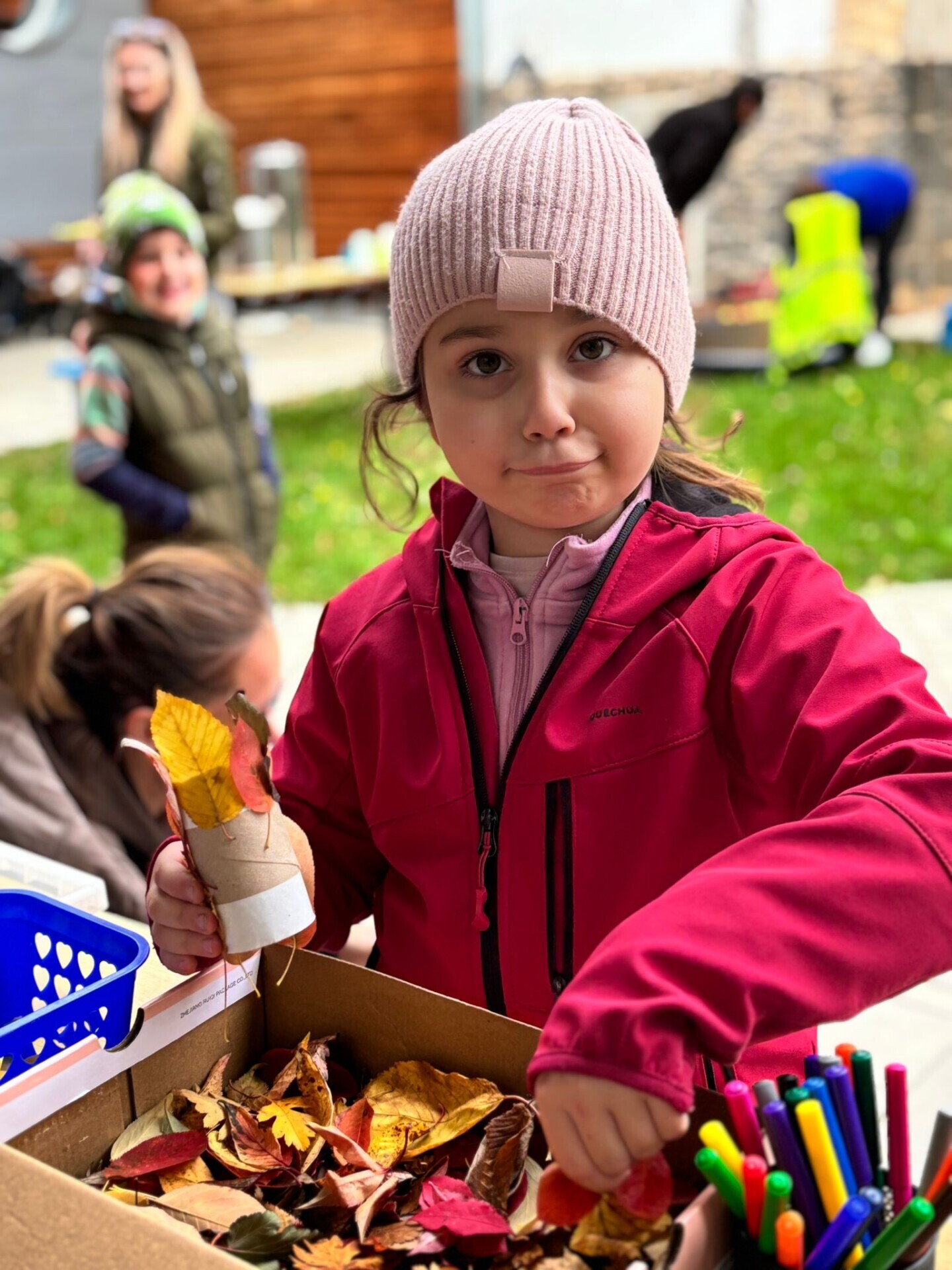 Ve čtvrtek 16. 10. 2025 jsme na zahradě naší MŠ uspořádali podzimní dílničky. Dílničky byly celkem tři (za každou třídu jedna), ve kterých jste si s dětmi mohli vytvořit podzimní dekorace z přírodnin. V dílničce připravené třídou Motýlků byla možnost vyrobit si skřítka Podzimníčka z listů a roličky od toaletního papíru. U stanoviště ze třídy Ježečků se vyráběl podzimní věnec z listů a kaštanů a u stolečku Soviček se vyrábělo opět z listí. Děti, ale i rodiče, si u tohoto stolečku mohli vyrobit podzimní svícen ze sklenic a listí. Abychom si čekání na volné stanoviště zkrátili, byla připravena i ukázka moštování jablek, ochutnávka moštu i sladké občerstvení od naší paní školnice Marcely. Na závěr dne byl zapálen ohýnek, na kterém si každý mohl upéct v tomto roce (nejspíše) poslední vuřty či klobásy.