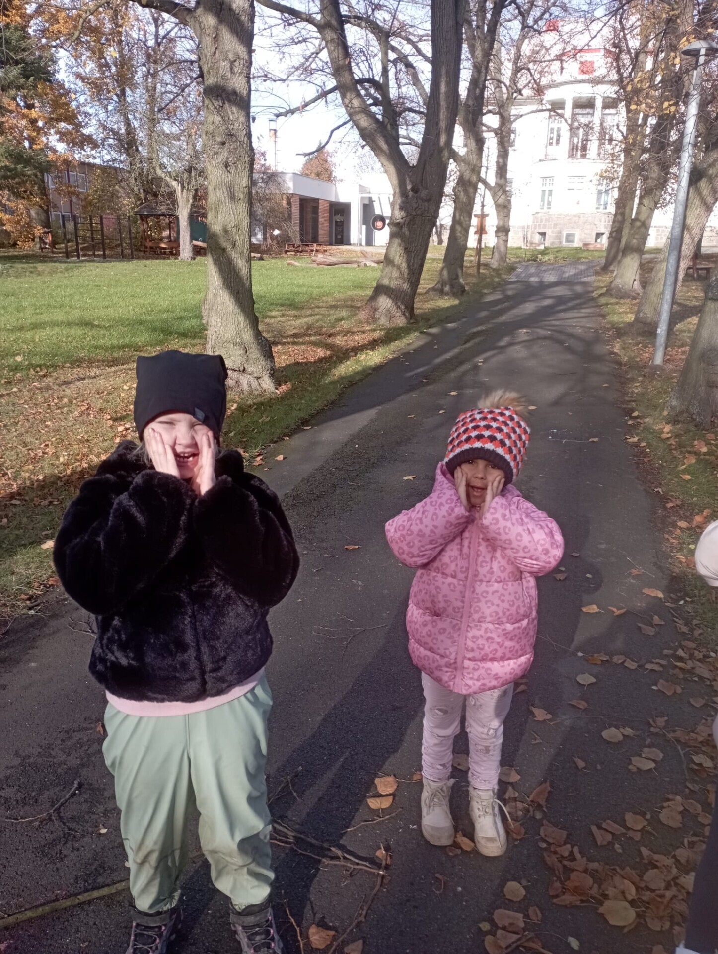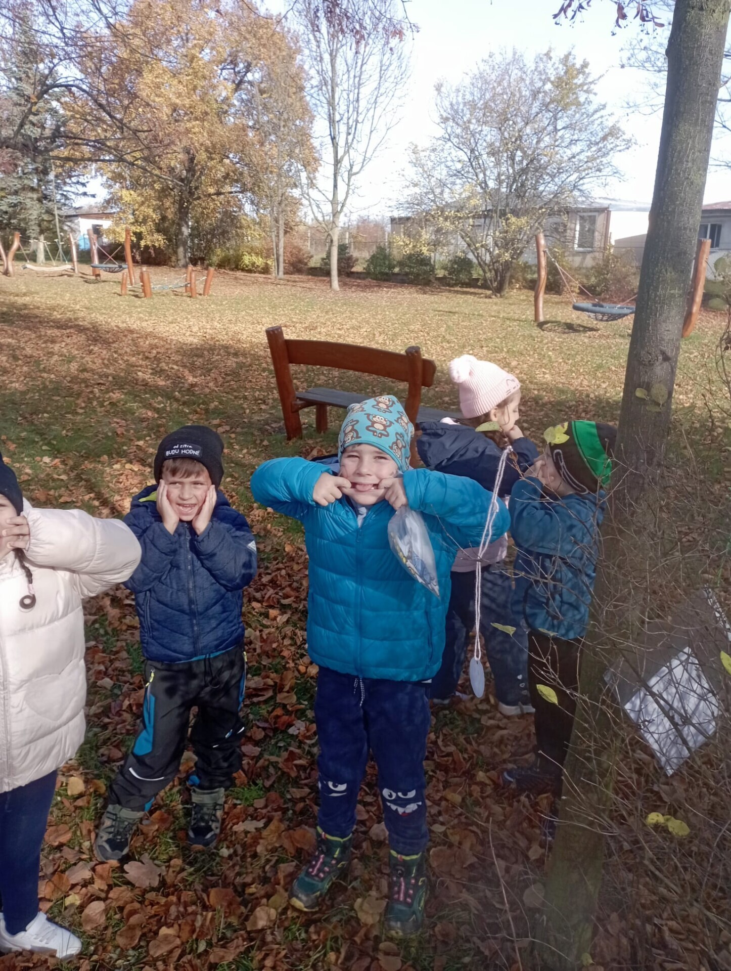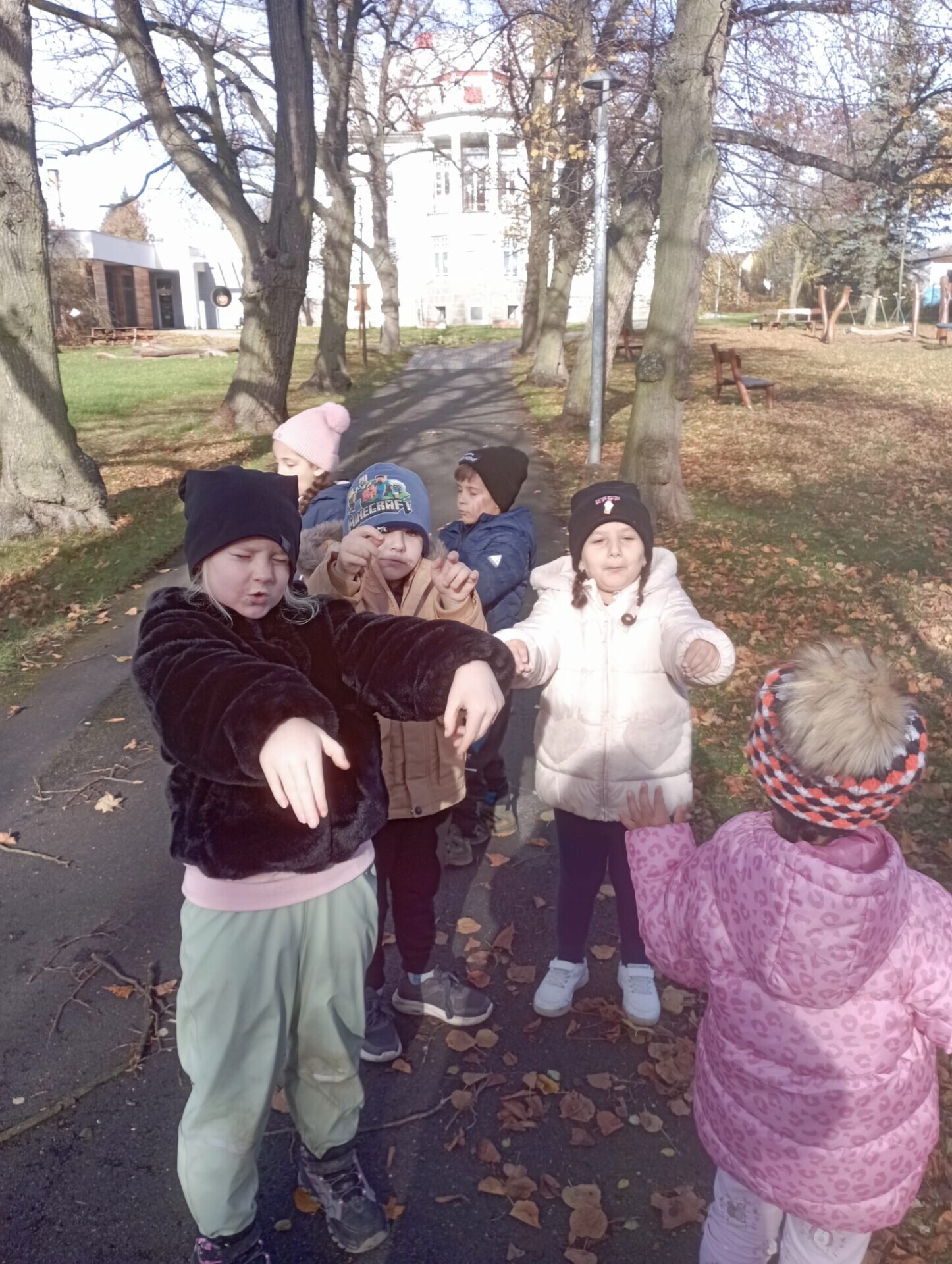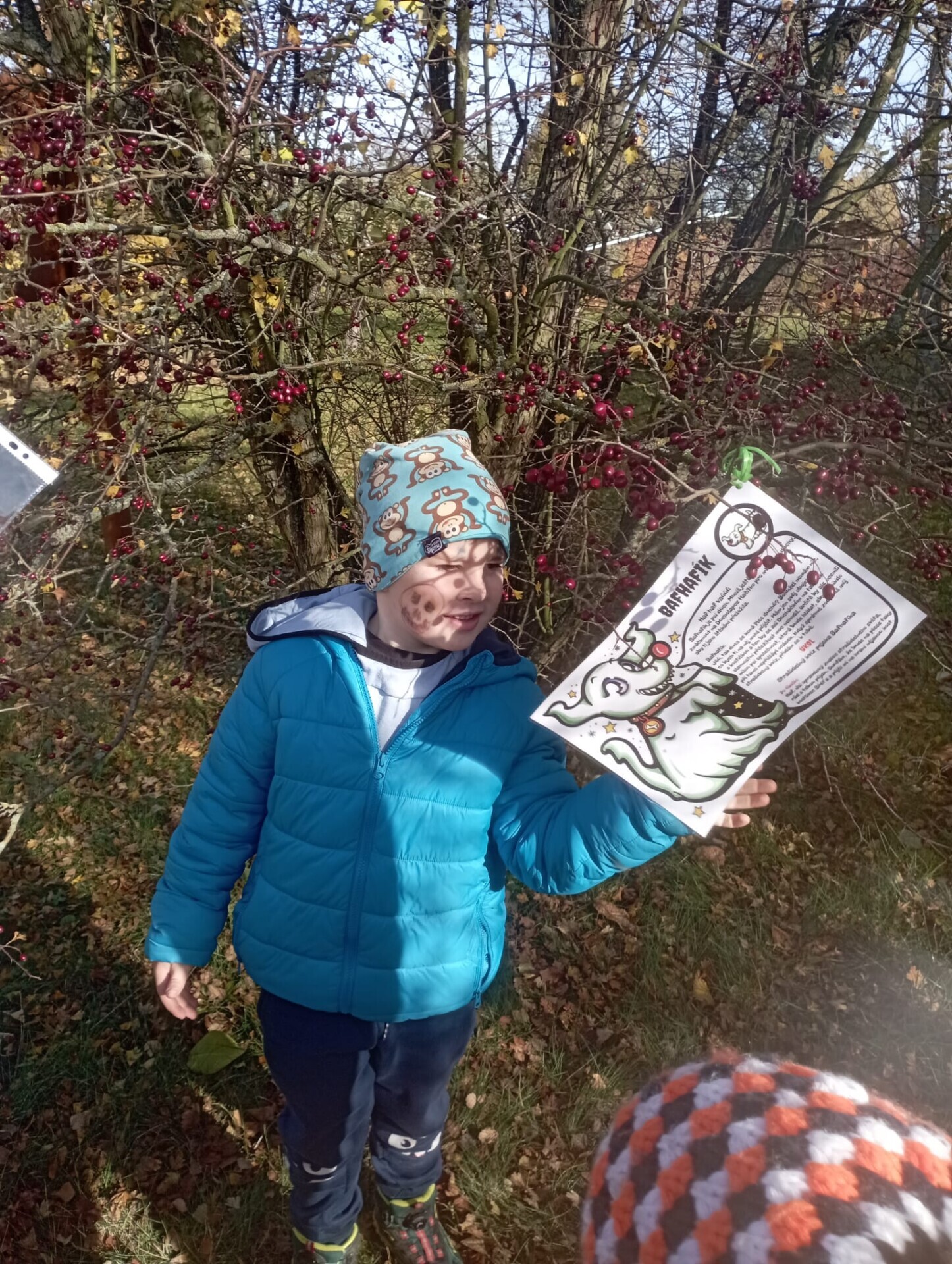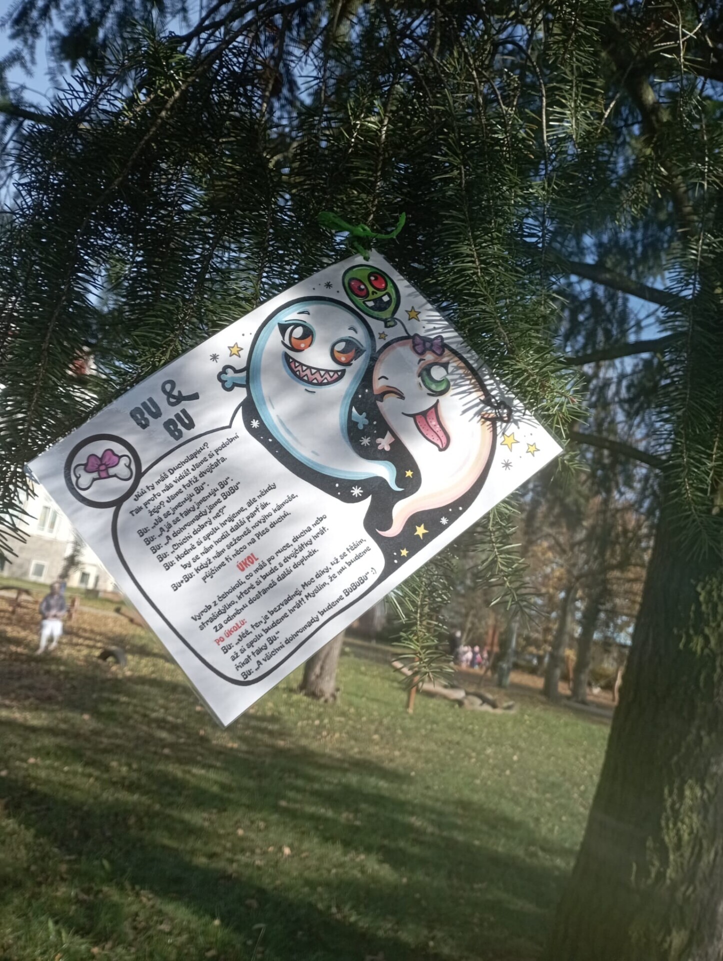 Pak ale přišel čas na pobyt venku na čerstvém vzduchu. I tam si pro nás paní učitelky připravily zábavu. Po celé zahradě jsme měli rozmístěnou "duchařskou" stezku. Duchové naštěstí nebyli zlí a strašidelní, ale hodní a smutní. Paní a pan Ducháčkovi se totiž chystali na ples, ale neměli žádné plesové doplňky a naším úkolem bylo najít po zahradě ostatní duchy, jejich kamarády, splnit jejich úkoly a půjčit si od nich plesové doplňky pro Ducháčkovi. Plnili jsme různé úkoly, např: strašidelné obličeje, navlékání korálků, vyvedení pavoučků z dýně, netopýří let, výroba vlastního lektvaru, uspávání ducha... Za splnění úkolu jsme od každého kamaráda ducha dostali nějké plesové doplňky (netopýří kravatu, pejska Bafhafíka, korále, dýňovou kabelku, ještěrčí klobouk apod.), které jsme pak společně předali paní Ducháčkové a panu Ducháčkovi.