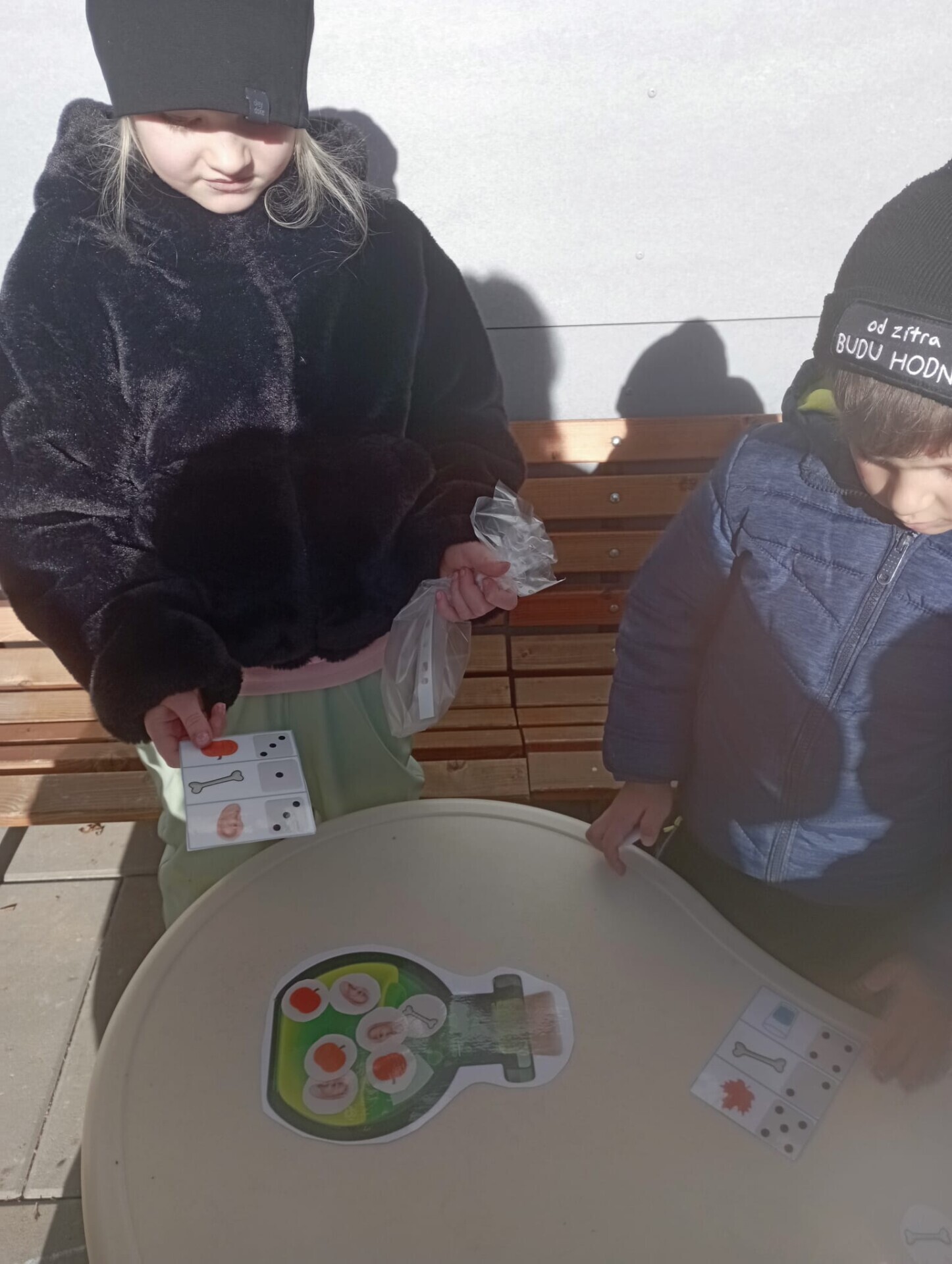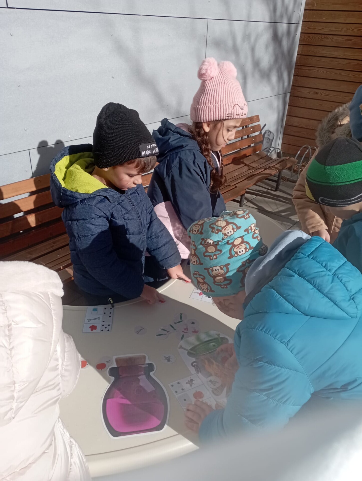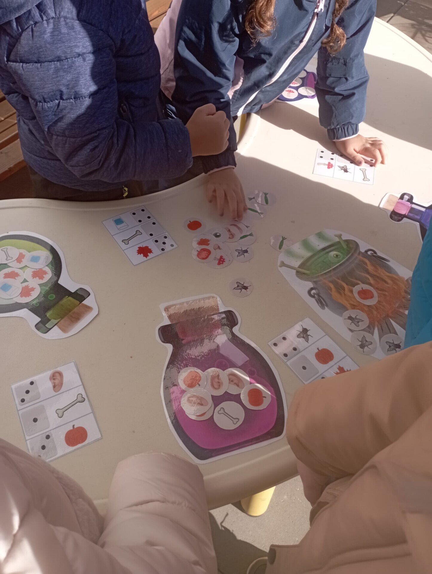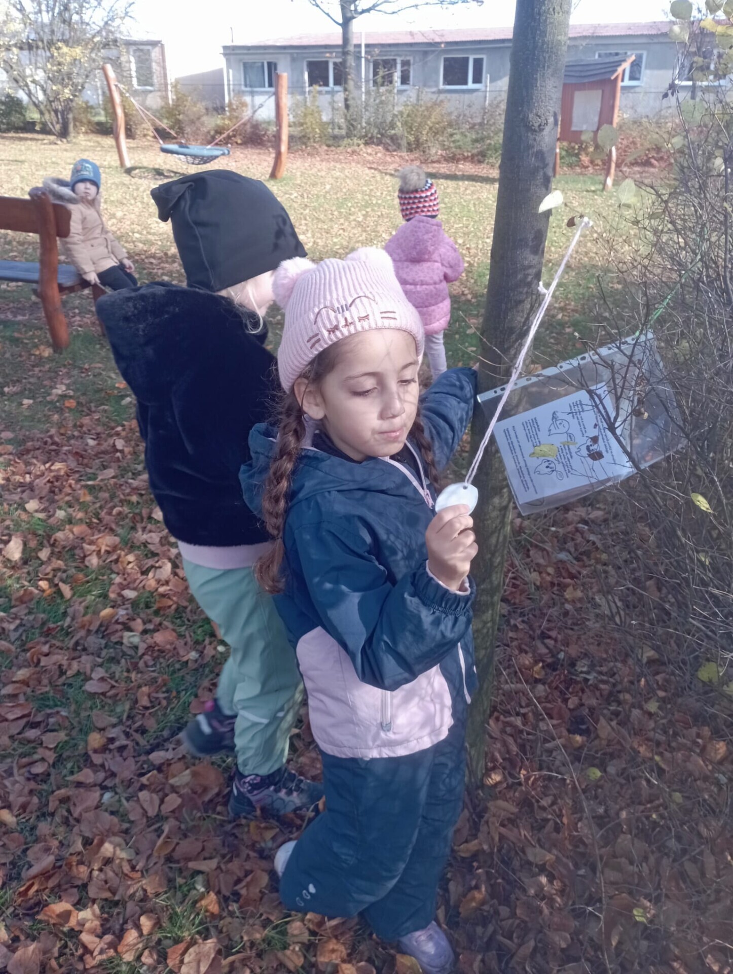 Pak ale přišel čas na pobyt venku na čerstvém vzduchu. I tam si pro nás paní učitelky připravily zábavu. Po celé zahradě jsme měli rozmístěnou "duchařskou" stezku. Duchové naštěstí nebyli zlí a strašidelní, ale hodní a smutní. Paní a pan Ducháčkovi se totiž chystali na ples, ale neměli žádné plesové doplňky a naším úkolem bylo najít po zahradě ostatní duchy, jejich kamarády, splnit jejich úkoly a půjčit si od nich plesové doplňky pro Ducháčkovi. Plnili jsme různé úkoly, např: strašidelné obličeje, navlékání korálků, vyvedení pavoučků z dýně, netopýří let, výroba vlastního lektvaru, uspávání ducha... Za splnění úkolu jsme od každého kamaráda ducha dostali nějké plesové doplňky (netopýří kravatu, pejska Bafhafíka, korále, dýňovou kabelku, ještěrčí klobouk apod.), které jsme pak společně předali paní Ducháčkové a panu Ducháčkovi.