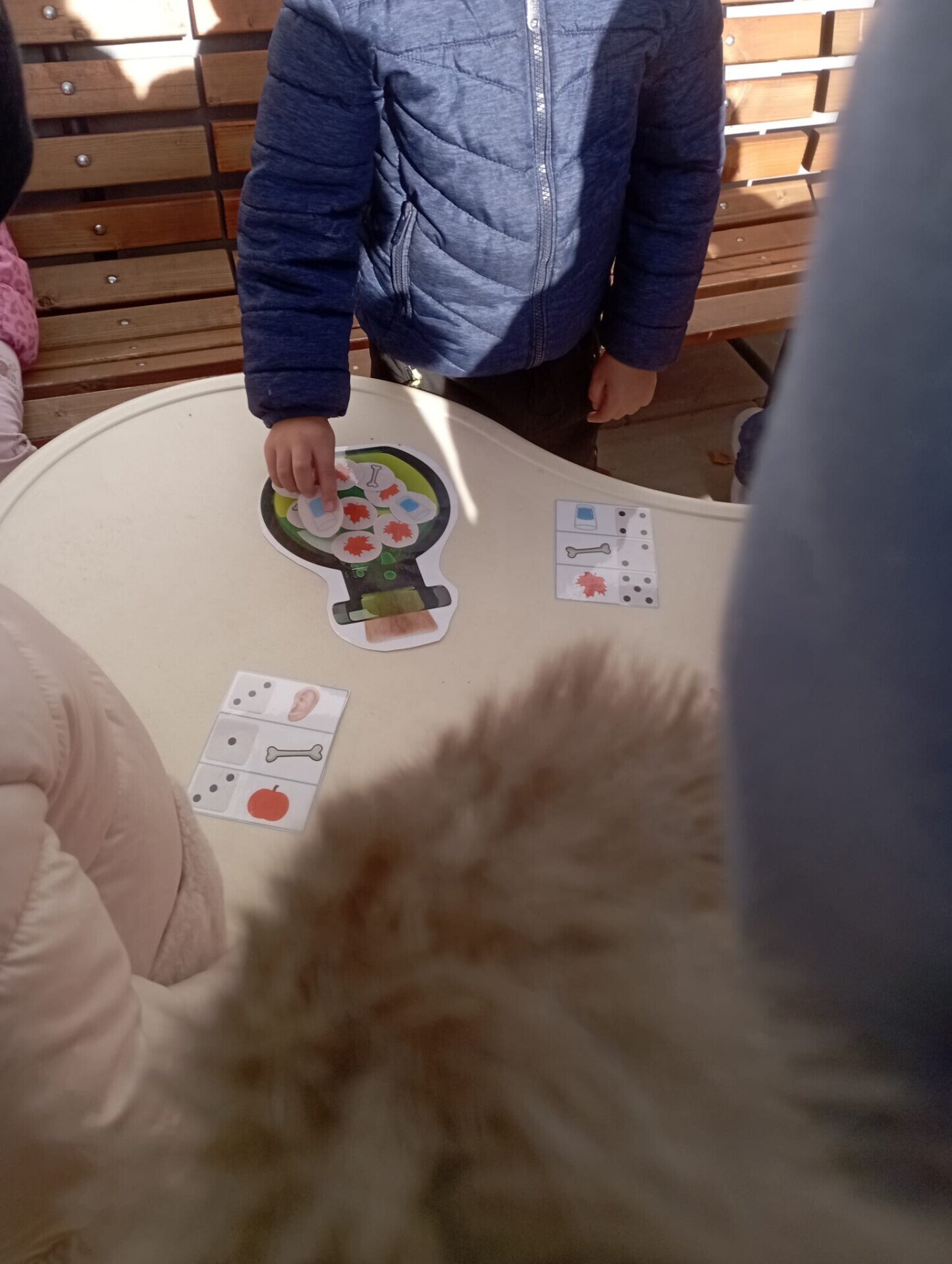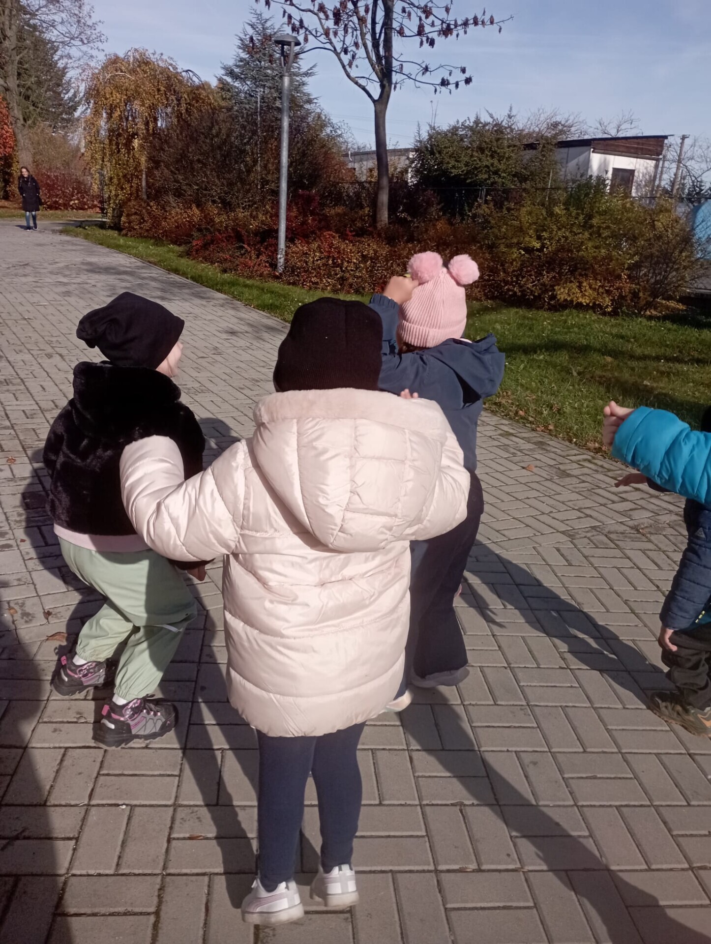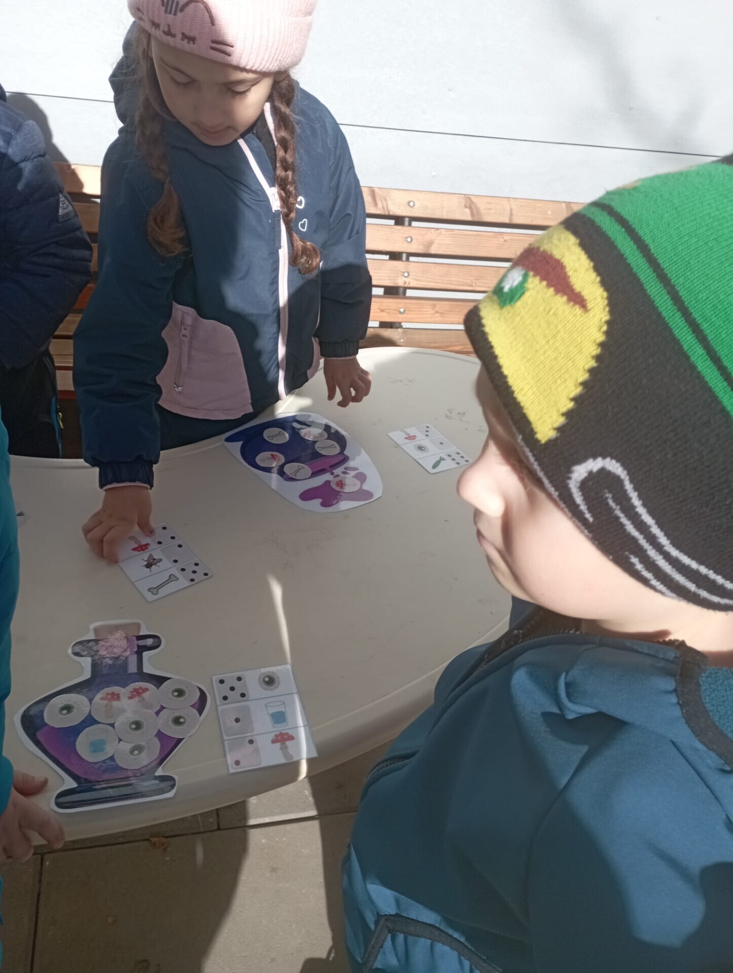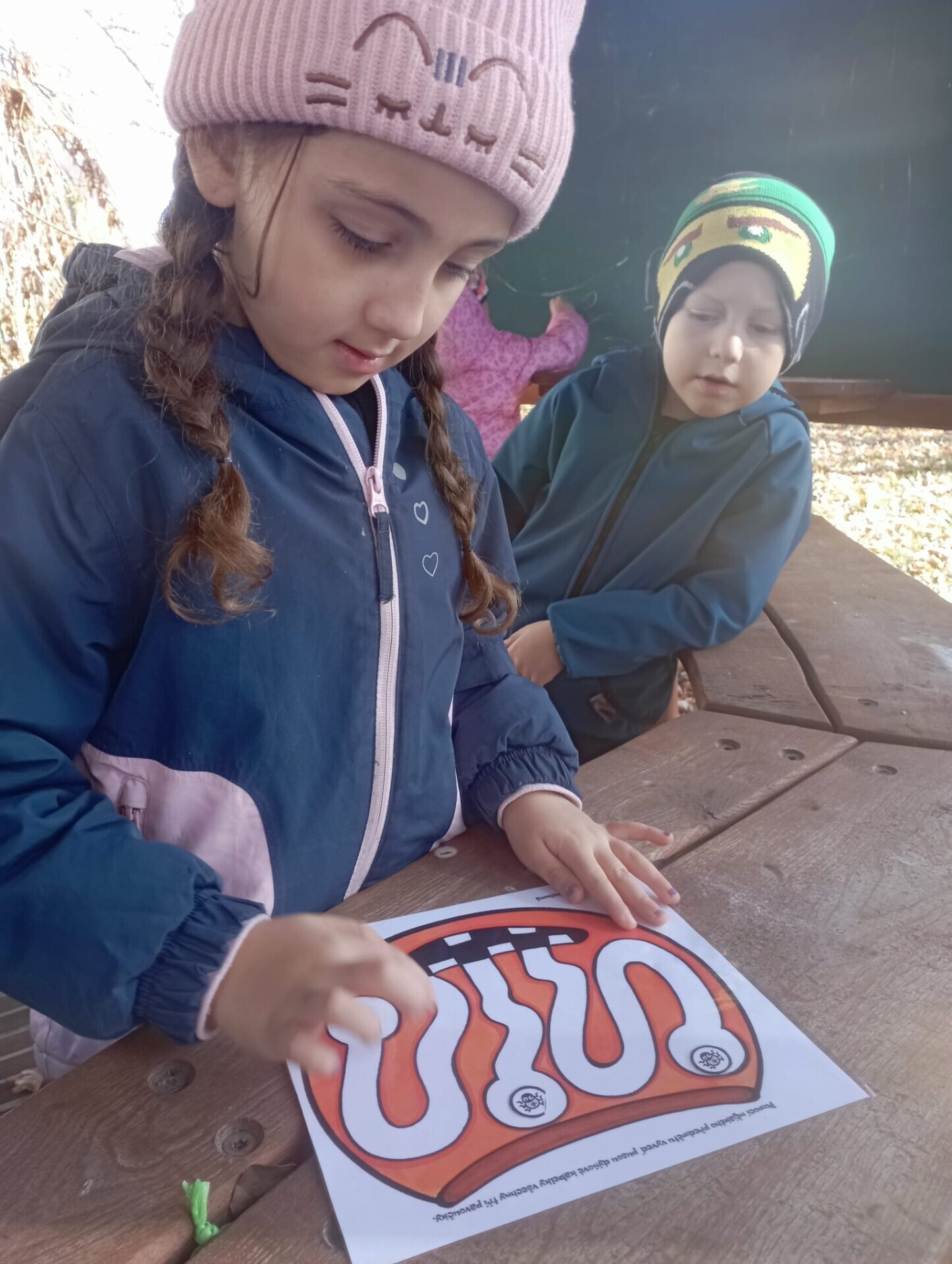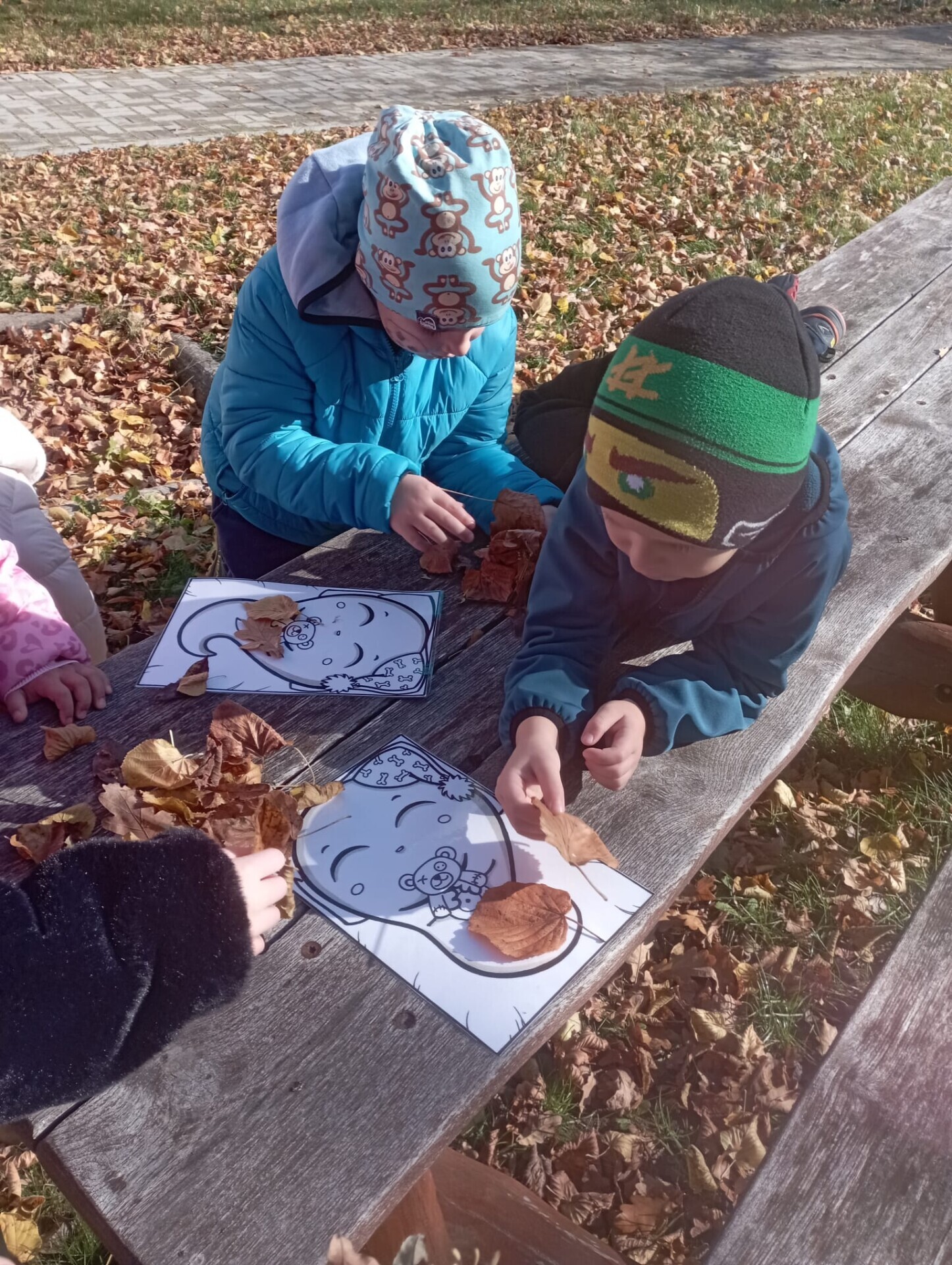 Pak ale přišel čas na pobyt venku na čerstvém vzduchu. I tam si pro nás paní učitelky připravily zábavu. Po celé zahradě jsme měli rozmístěnou "duchařskou" stezku. Duchové naštěstí nebyli zlí a strašidelní, ale hodní a smutní. Paní a pan Ducháčkovi se totiž chystali na ples, ale neměli žádné plesové doplňky a naším úkolem bylo najít po zahradě ostatní duchy, jejich kamarády, splnit jejich úkoly a půjčit si od nich plesové doplňky pro Ducháčkovi. Plnili jsme různé úkoly, např: strašidelné obličeje, navlékání korálků, vyvedení pavoučků z dýně, netopýří let, výroba vlastního lektvaru, uspávání ducha... Za splnění úkolu jsme od každého kamaráda ducha dostali nějké plesové doplňky (netopýří kravatu, pejska Bafhafíka, korále, dýňovou kabelku, ještěrčí klobouk apod.), které jsme pak společně předali paní Ducháčkové a panu Ducháčkovi.
