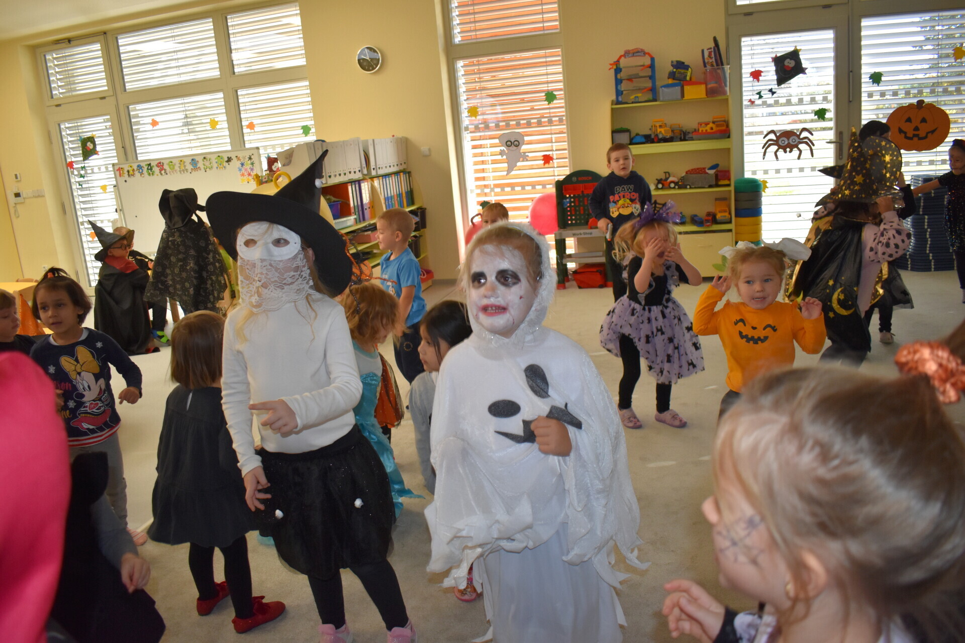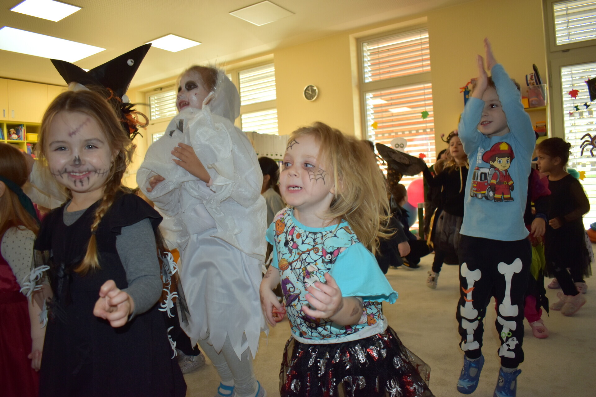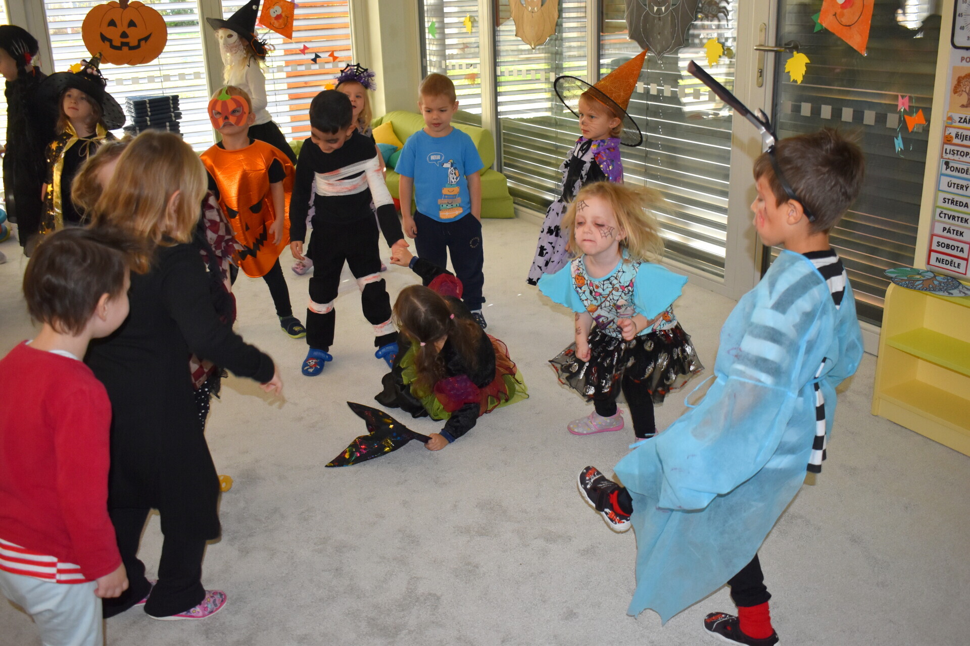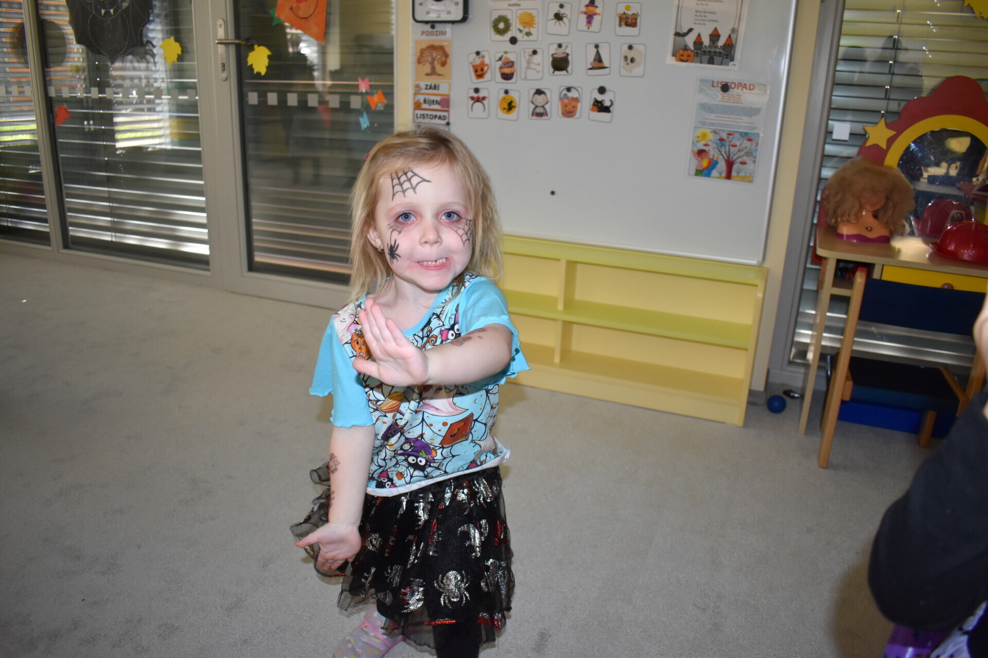 V úterý 4. 11. 2025 přišly děti do Halloweenské školky. Celý den jsme se totiž věnovali halloweenu a jeho oslavě. Spousta dětí přišlo v maskách (ve strašidelných nebo superhrdinských), a tak jsme se nejdříve ostatním dětem představili, aby všichni věděli, co jsme za masky. Poté jsme se vydali na halloweenskou svačinku a z té pak rovnou na diskotéku do třídy Ježečků. U Ježečků jsme se při tanci pořádně vyřádili, tančili jsme jak na dětské písničky, tak i na písničky strašidelné, halloweenské.