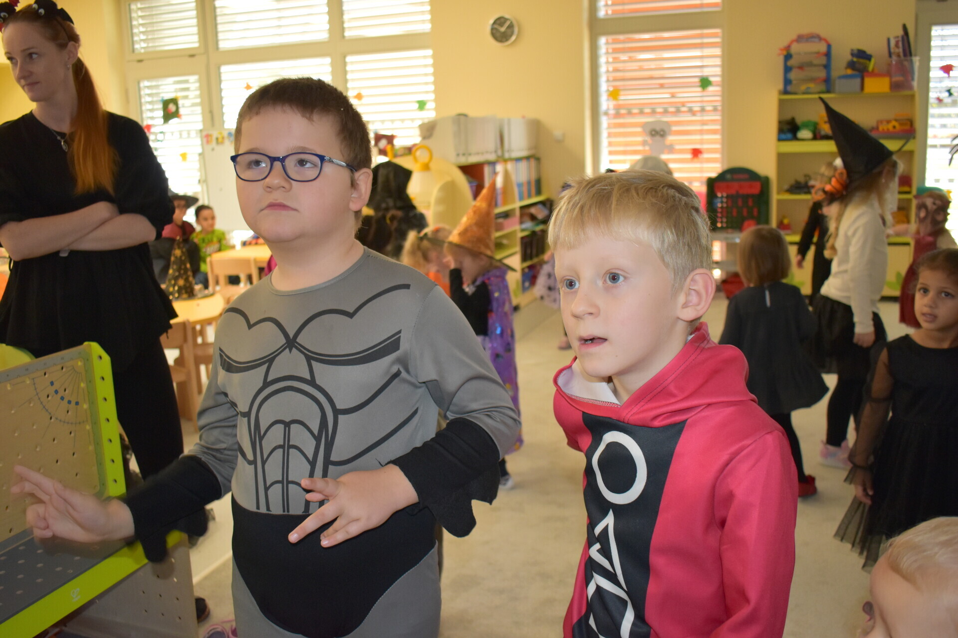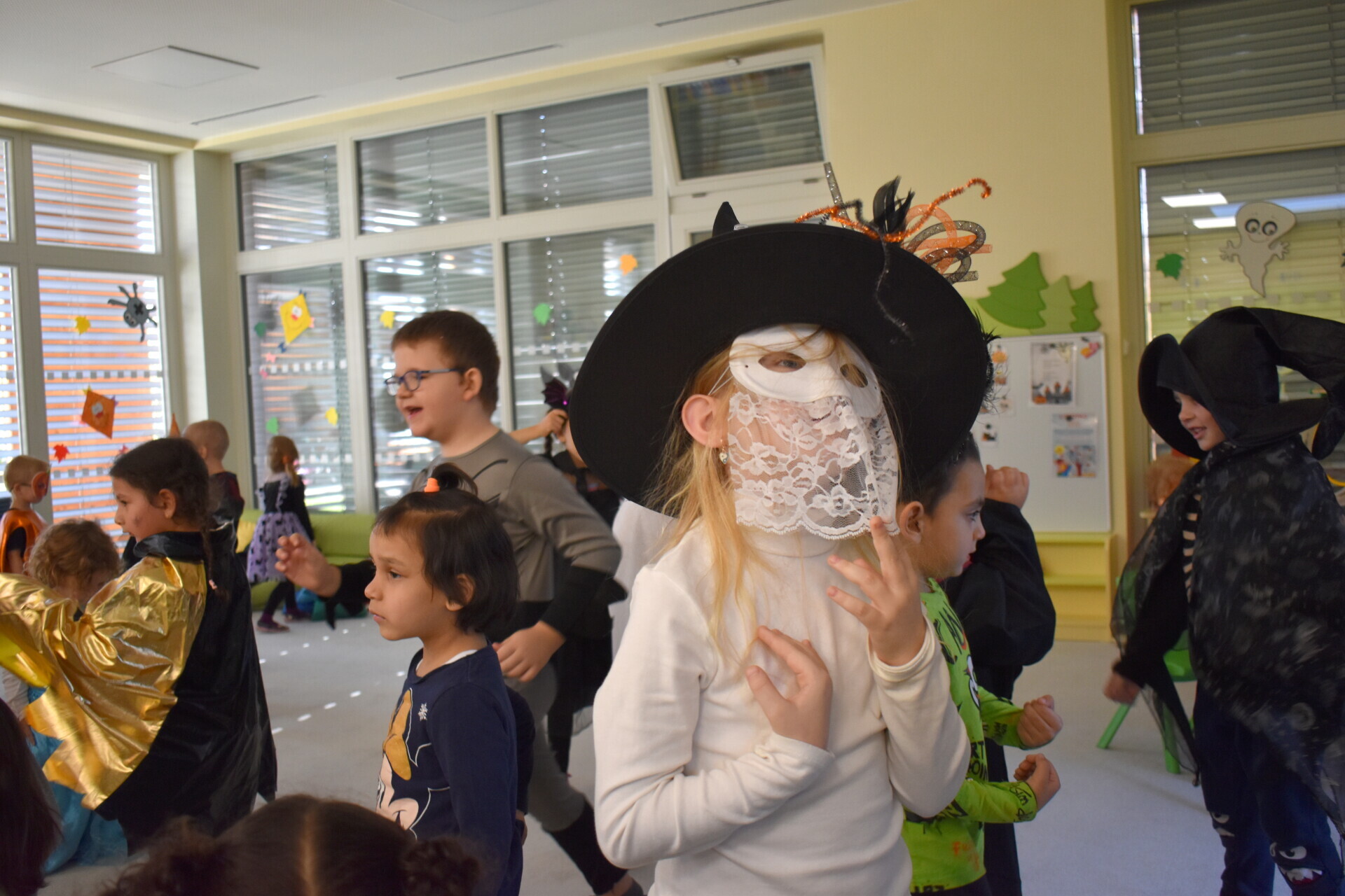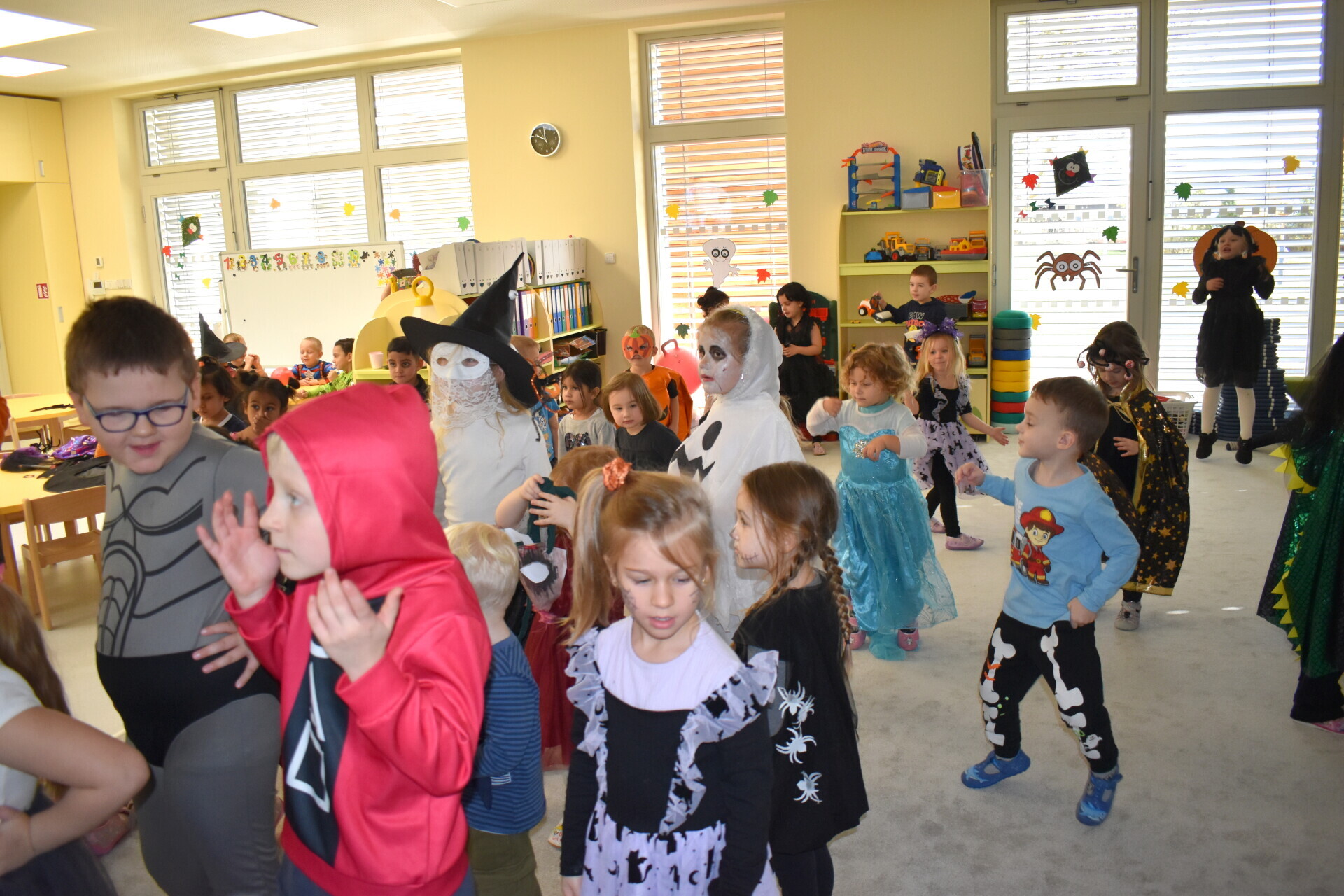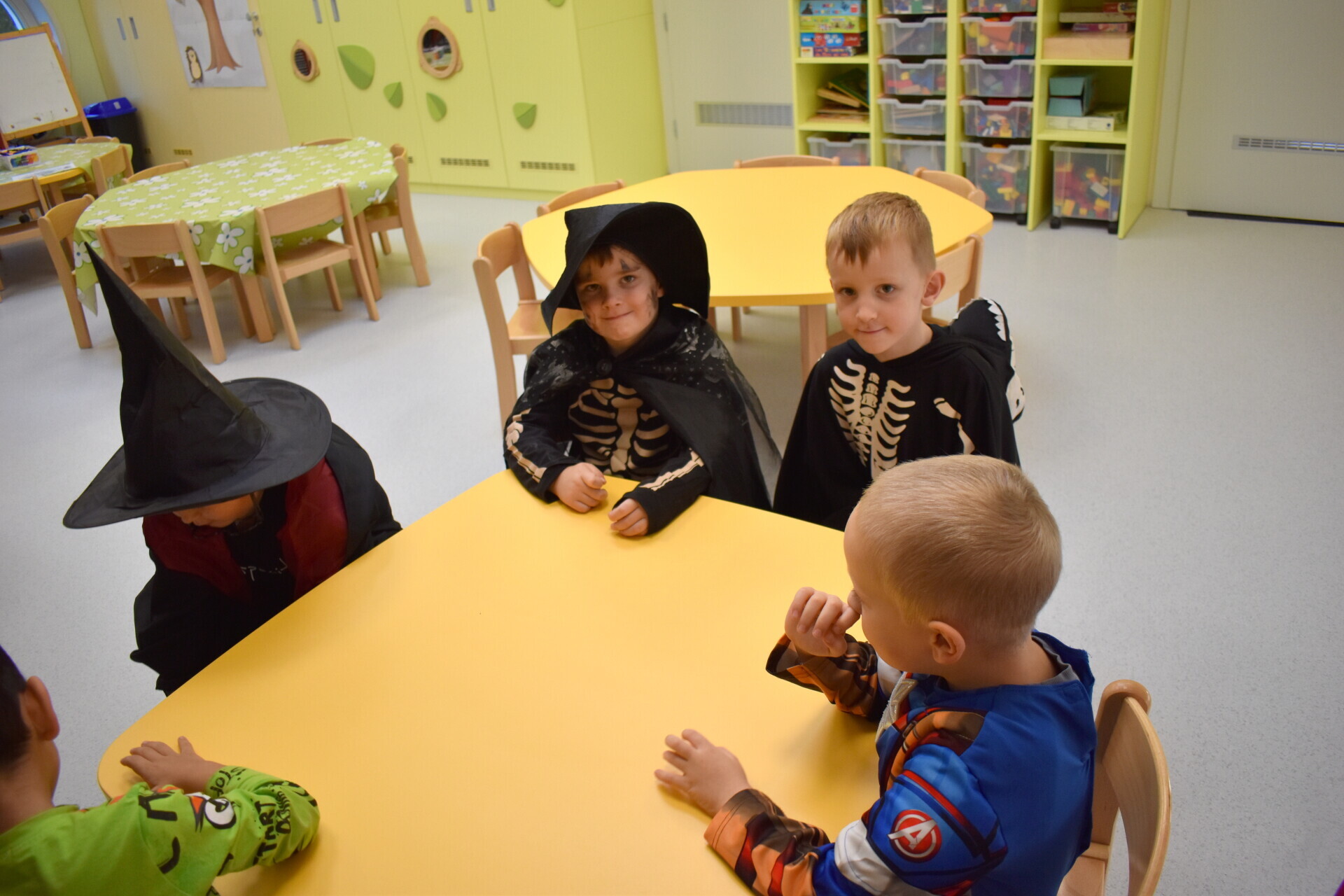 V úterý 4. 11. 2025 přišly děti do Halloweenské školky. Celý den jsme se totiž věnovali halloweenu a jeho oslavě. Spousta dětí přišlo v maskách (ve strašidelných nebo superhrdinských), a tak jsme se nejdříve ostatním dětem představili, aby všichni věděli, co jsme za masky. Poté jsme se vydali na halloweenskou svačinku a z té pak rovnou na diskotéku do třídy Ježečků. U Ježečků jsme se při tanci pořádně vyřádili, tančili jsme jak na dětské písničky, tak i na písničky strašidelné, halloweenské.
