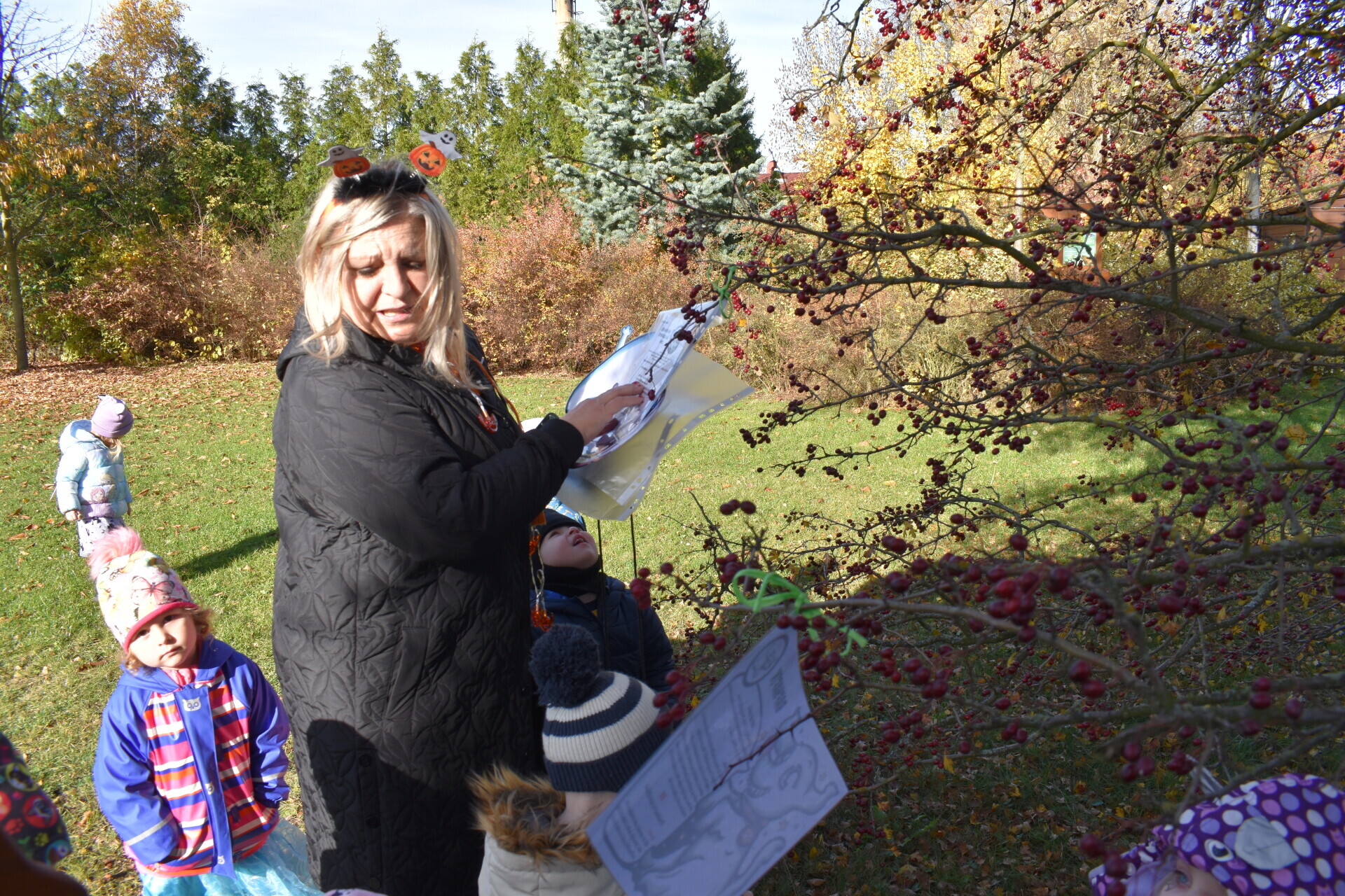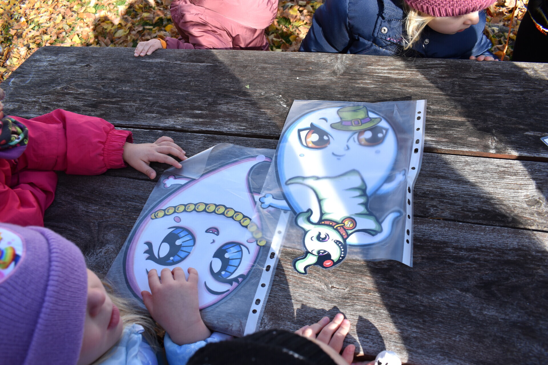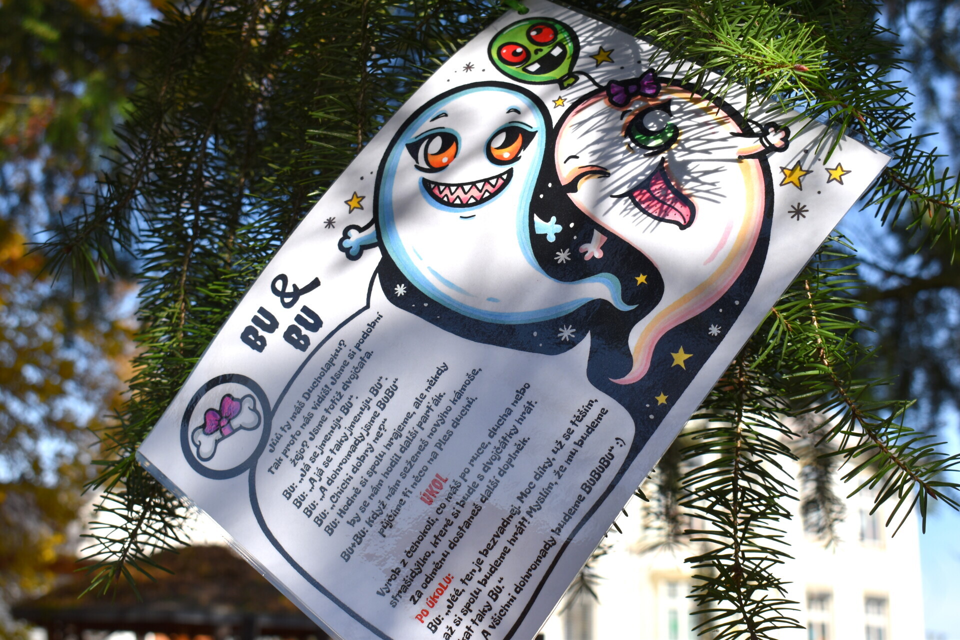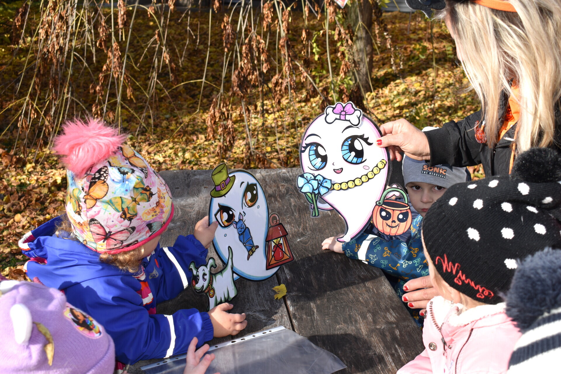 Pak ale přišel čas na pobyt venku na čerstvém vzduchu. I tam si pro nás paní učitelky připravily zábavu. Po celé zahradě jsme měli rozmístěnou "duchařskou" stezku. Duchové naštěstí nebyli zlí a strašidelní, ale hodní a smutní. Paní a pan Ducháčkovi se totiž chystali na ples, ale neměli žádné plesové doplňky a naším úkolem bylo najít po zahradě ostatní duchy, jejich kamarády, splnit jejich úkoly a půjčit si od nich plesové doplňky pro Ducháčkovi. Plnili jsme různé úkoly, např: strašidelné obličeje, navlékání korálků, vyvedení pavoučků z dýně, netopýří let, výroba vlastního lektvaru, uspávání ducha... Za splnění úkolu jsme od každého kamaráda ducha dostali nějké plesové doplňky (netopýří kravatu, pejska Bafhafíka, korále, dýňovou kabelku, ještěrčí klobouk apod.), které jsme pak společně předali paní Ducháčkové a panu Ducháčkovi.