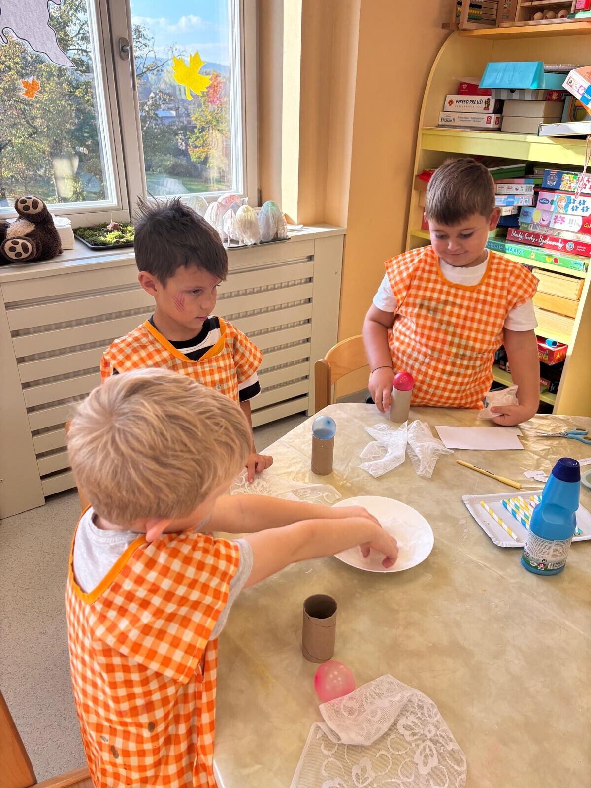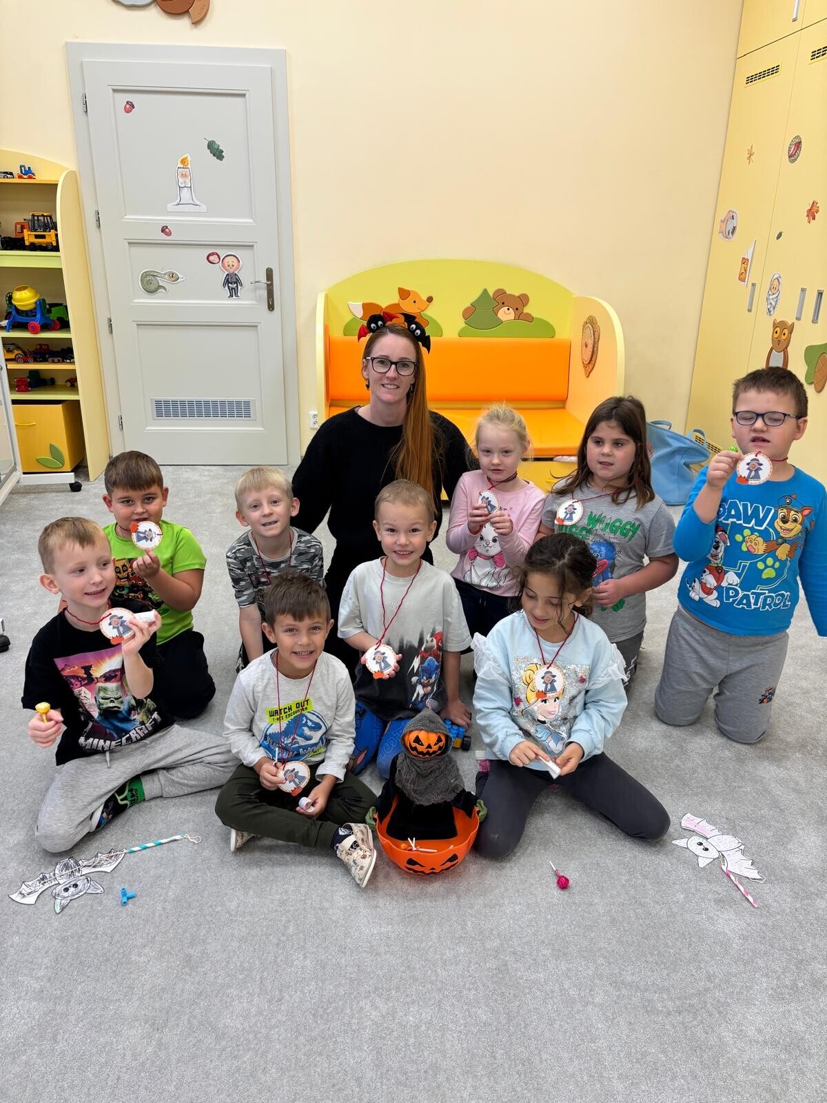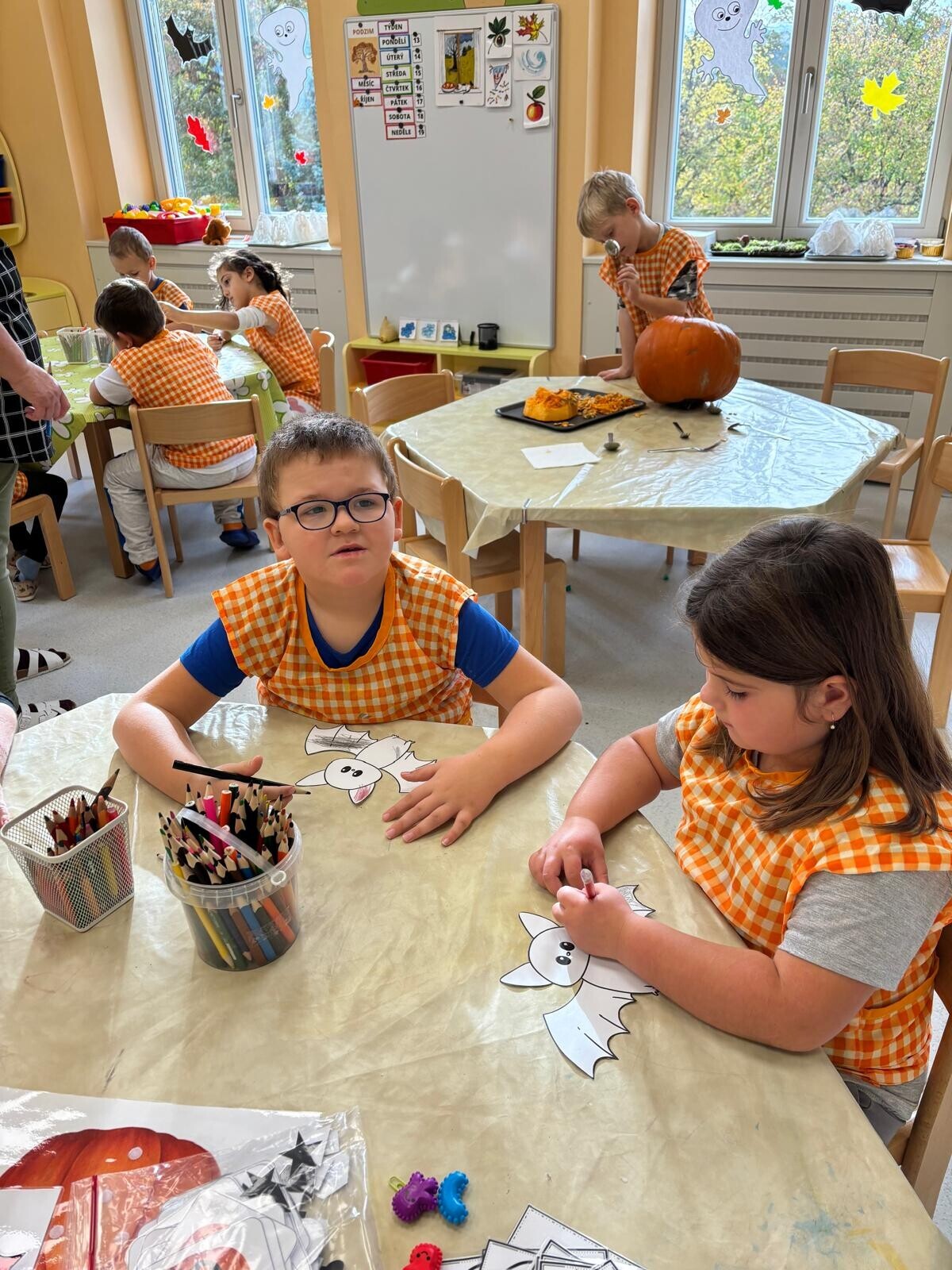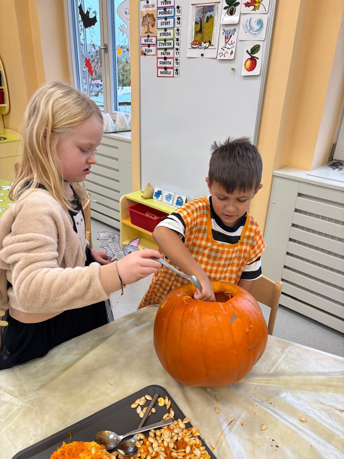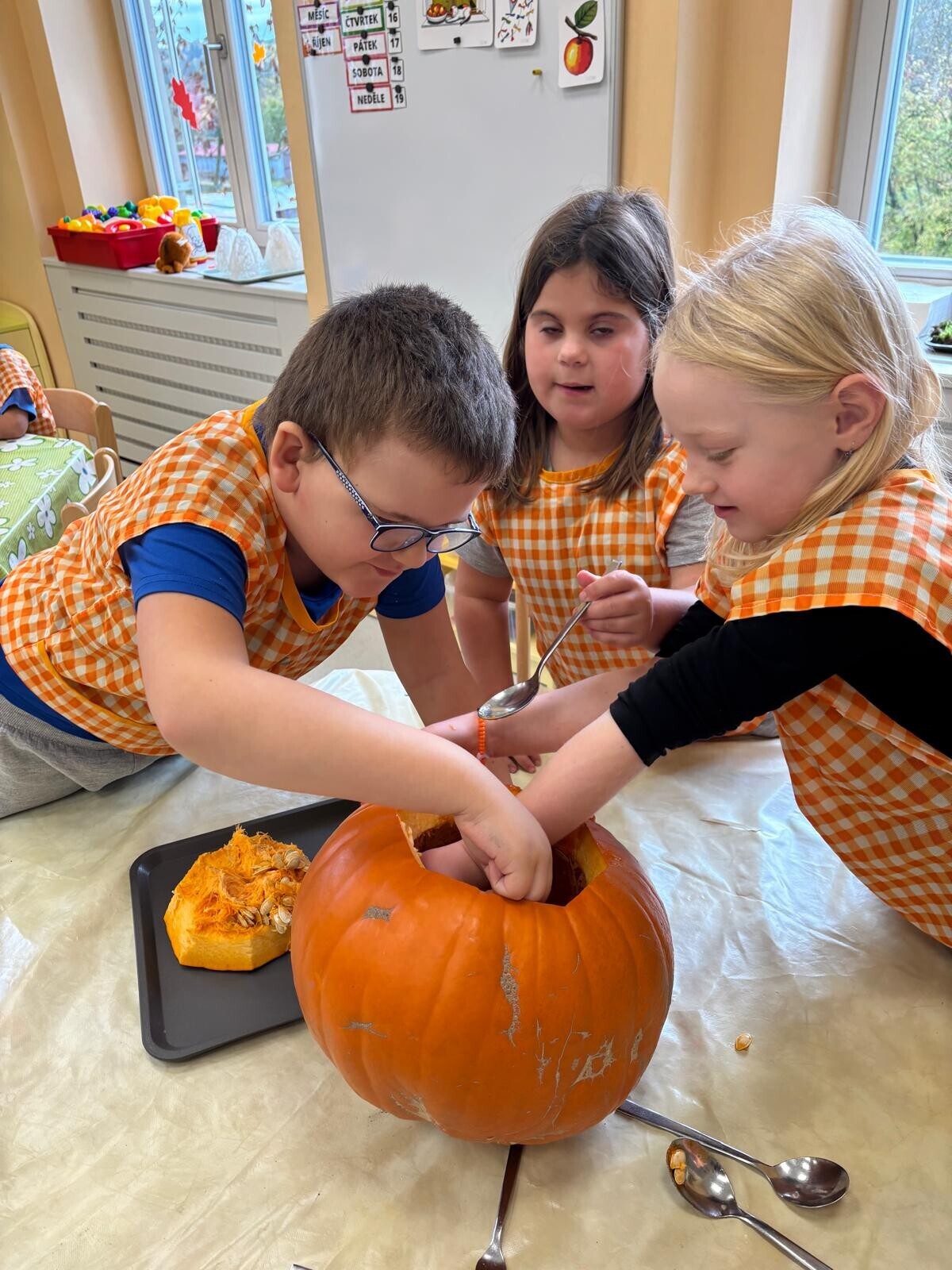 V tomto týdnu jsme se věnovaly tématu Strašidel se nebojíme. Povídali jsme si o Dušičkách i o Halloweenu. Děti si vytvořily dýně z dřevěných odřezků, létajícího papírového netopýra, ducha ze staré záclony, oční bulvu. Pomocí staré okenní stěrky namalovaly děti rodinku duchů, nezapomněli jsme ani na dlabání dýně a celý týden hrály děti hru Dýňový detektiv. Každý den hledaly děti 30 ztracených dýní, každý nálezce dýně si mohl vzít odměnu ze strašidelné misky a na konci týdne dostali všichni medaile Dýňový detektiv. Naučili jsme se také písničku Strašidla nebo básničku Dýně.