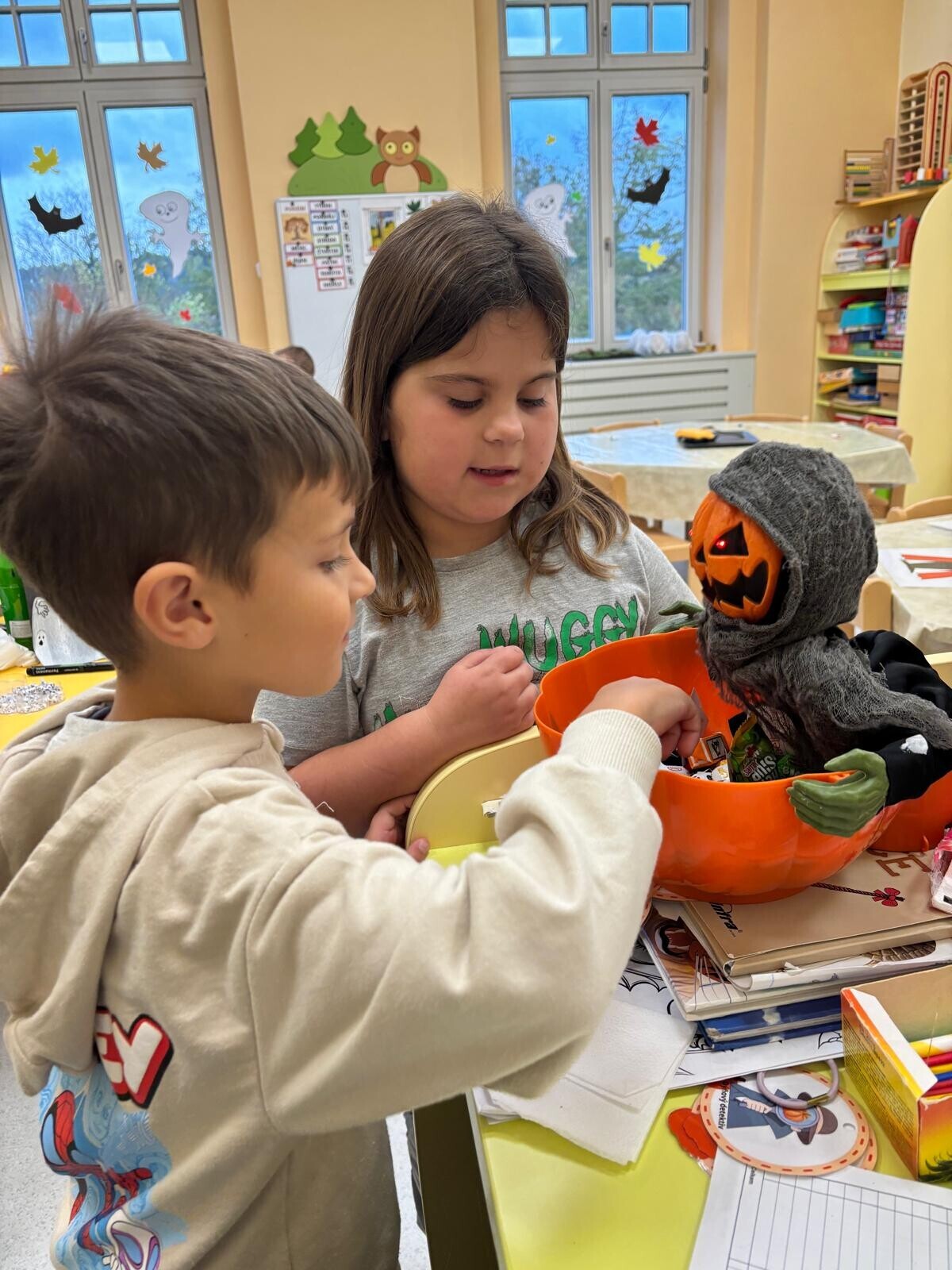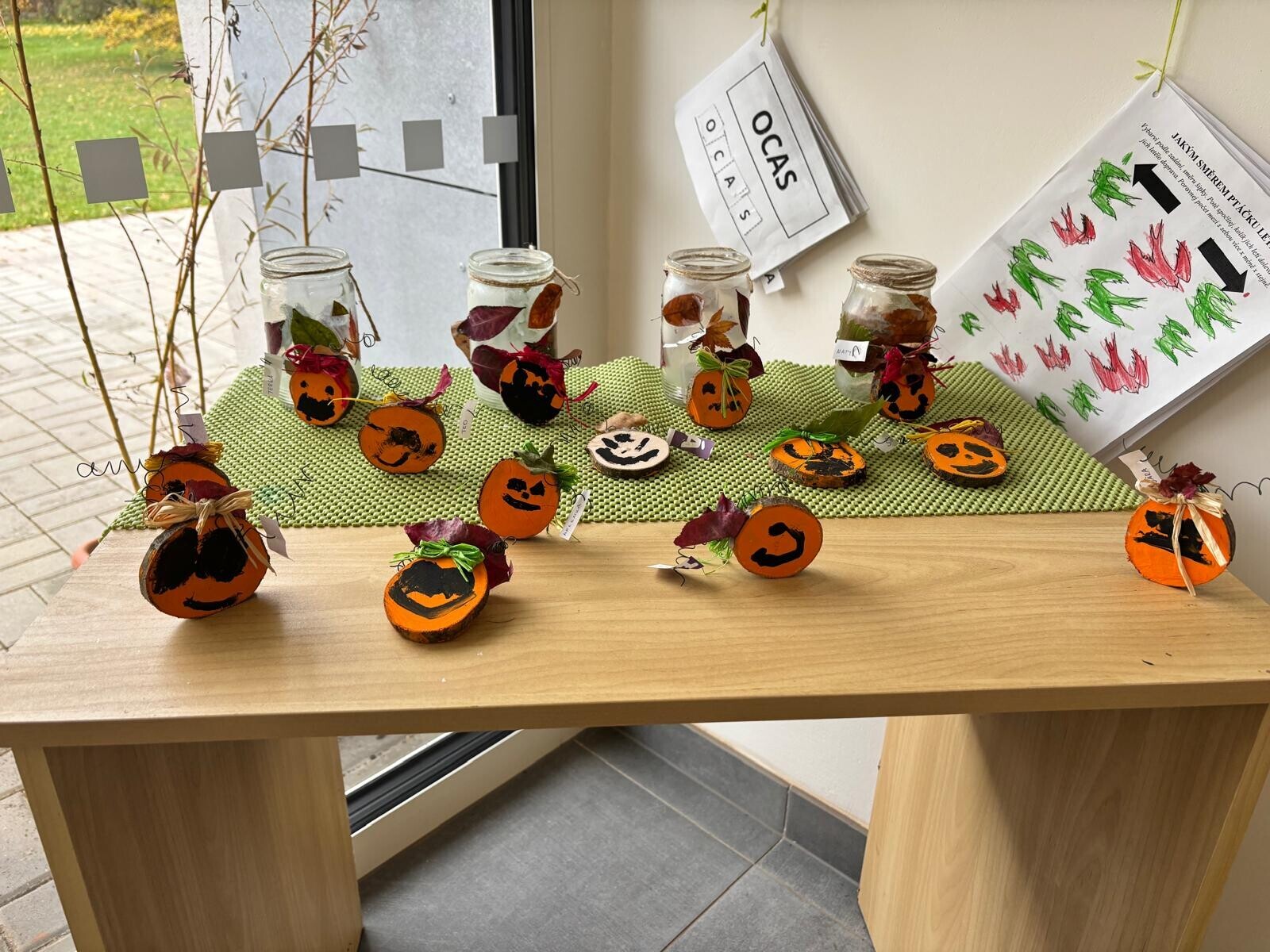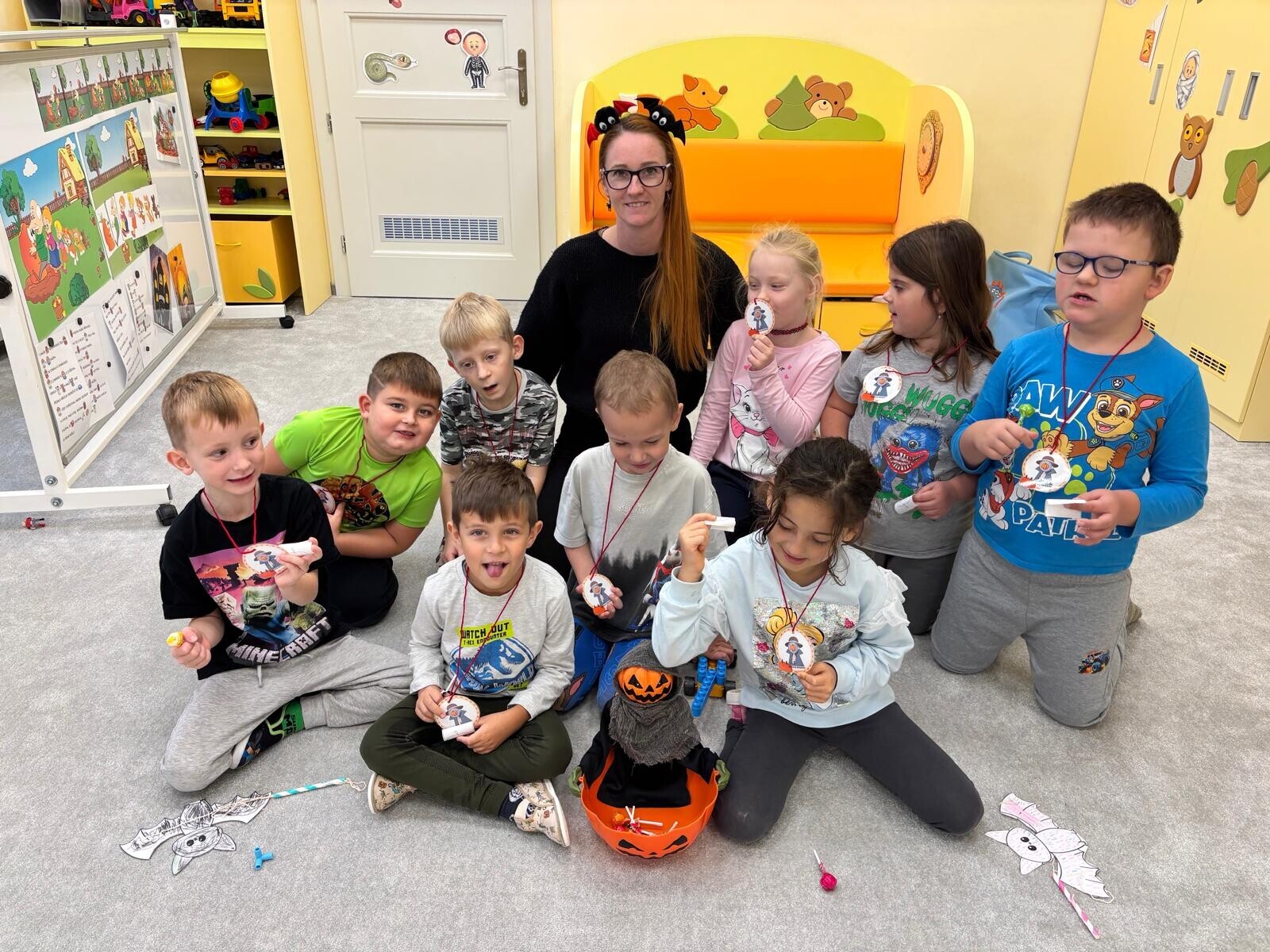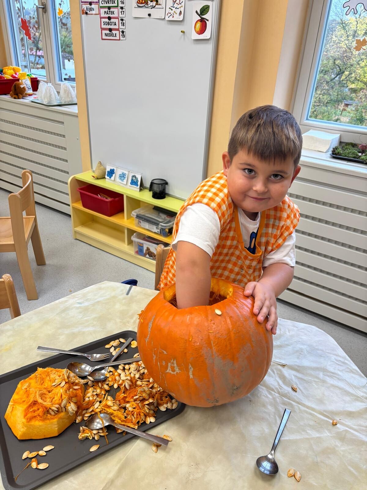 V tomto týdnu jsme se věnovaly tématu Strašidel se nebojíme. Povídali jsme si o Dušičkách i o Halloweenu. Děti si vytvořily dýně z dřevěných odřezků, létajícího papírového netopýra, ducha ze staré záclony, oční bulvu. Pomocí staré okenní stěrky namalovaly děti rodinku duchů, nezapomněli jsme ani na dlabání dýně a celý týden hrály děti hru Dýňový detektiv. Každý den hledaly děti 30 ztracených dýní, každý nálezce dýně si mohl vzít odměnu ze strašidelné misky a na konci týdne dostali všichni medaile Dýňový detektiv. Naučili jsme se také písničku Strašidla nebo básničku Dýně.