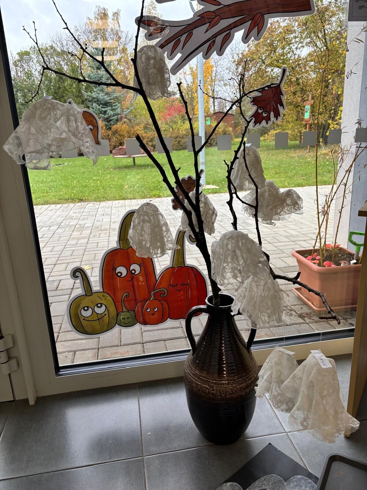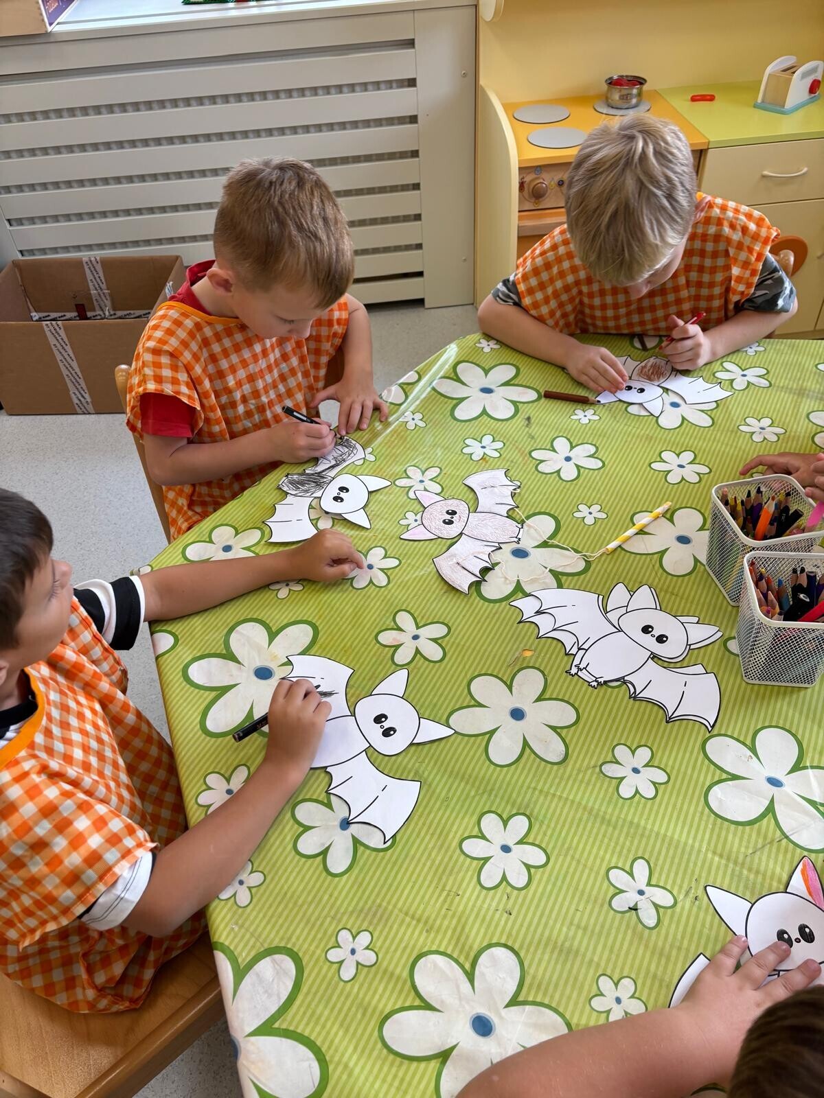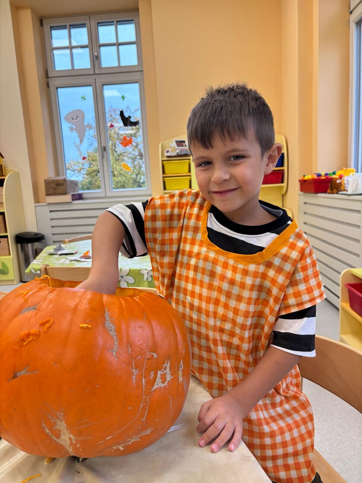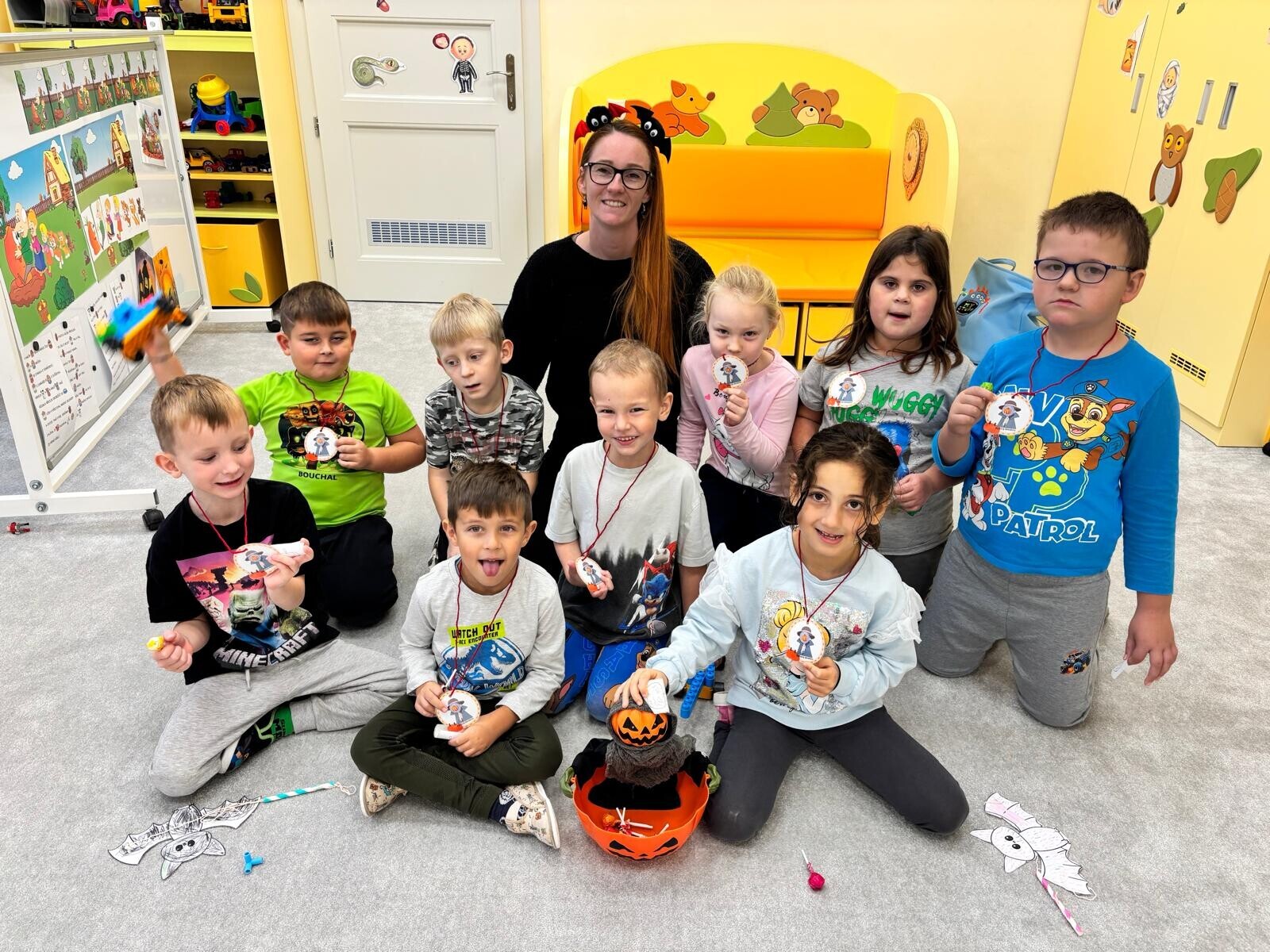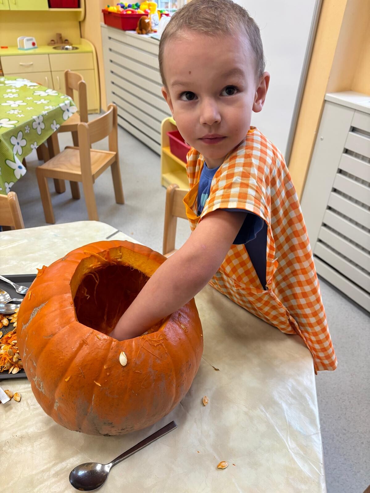 V tomto týdnu jsme se věnovaly tématu Strašidel se nebojíme. Povídali jsme si o Dušičkách i o Halloweenu. Děti si vytvořily dýně z dřevěných odřezků, létajícího papírového netopýra, ducha ze staré záclony, oční bulvu. Pomocí staré okenní stěrky namalovaly děti rodinku duchů, nezapomněli jsme ani na dlabání dýně a celý týden hrály děti hru Dýňový detektiv. Každý den hledaly děti 30 ztracených dýní, každý nálezce dýně si mohl vzít odměnu ze strašidelné misky a na konci týdne dostali všichni medaile Dýňový detektiv. Naučili jsme se také písničku Strašidla nebo básničku Dýně.