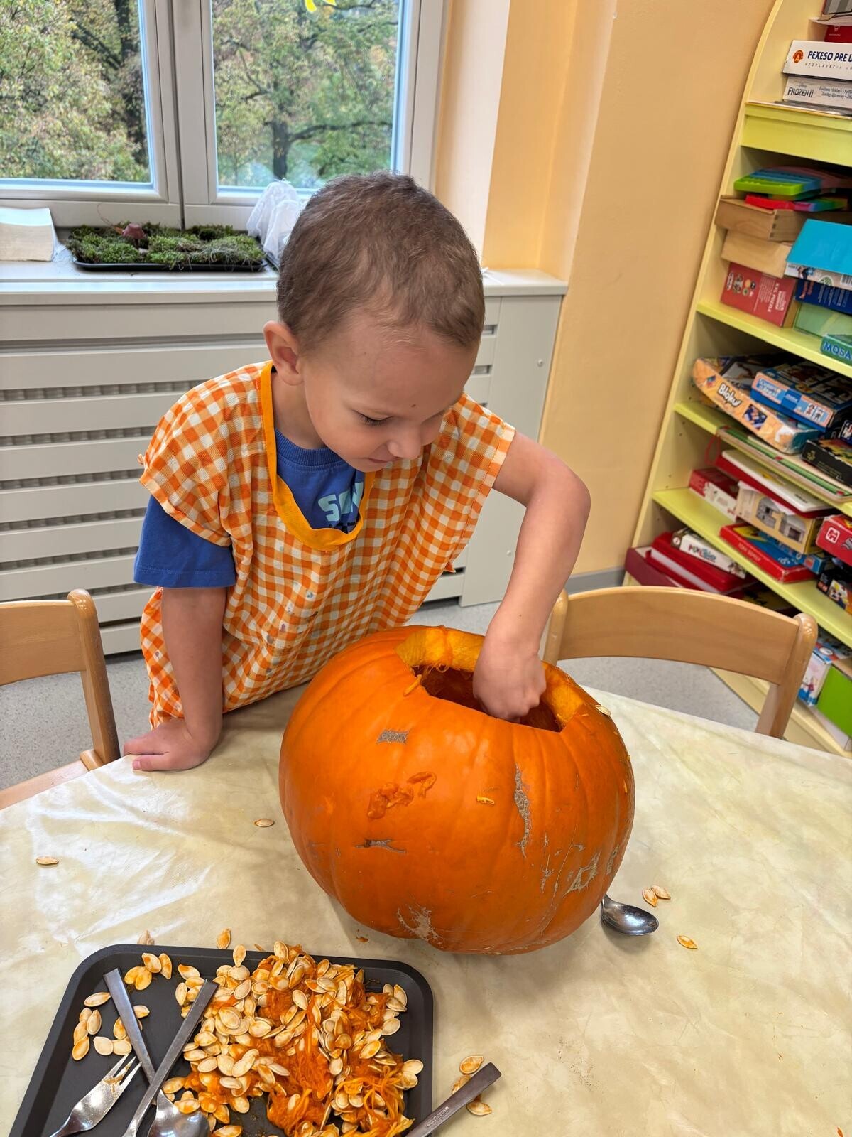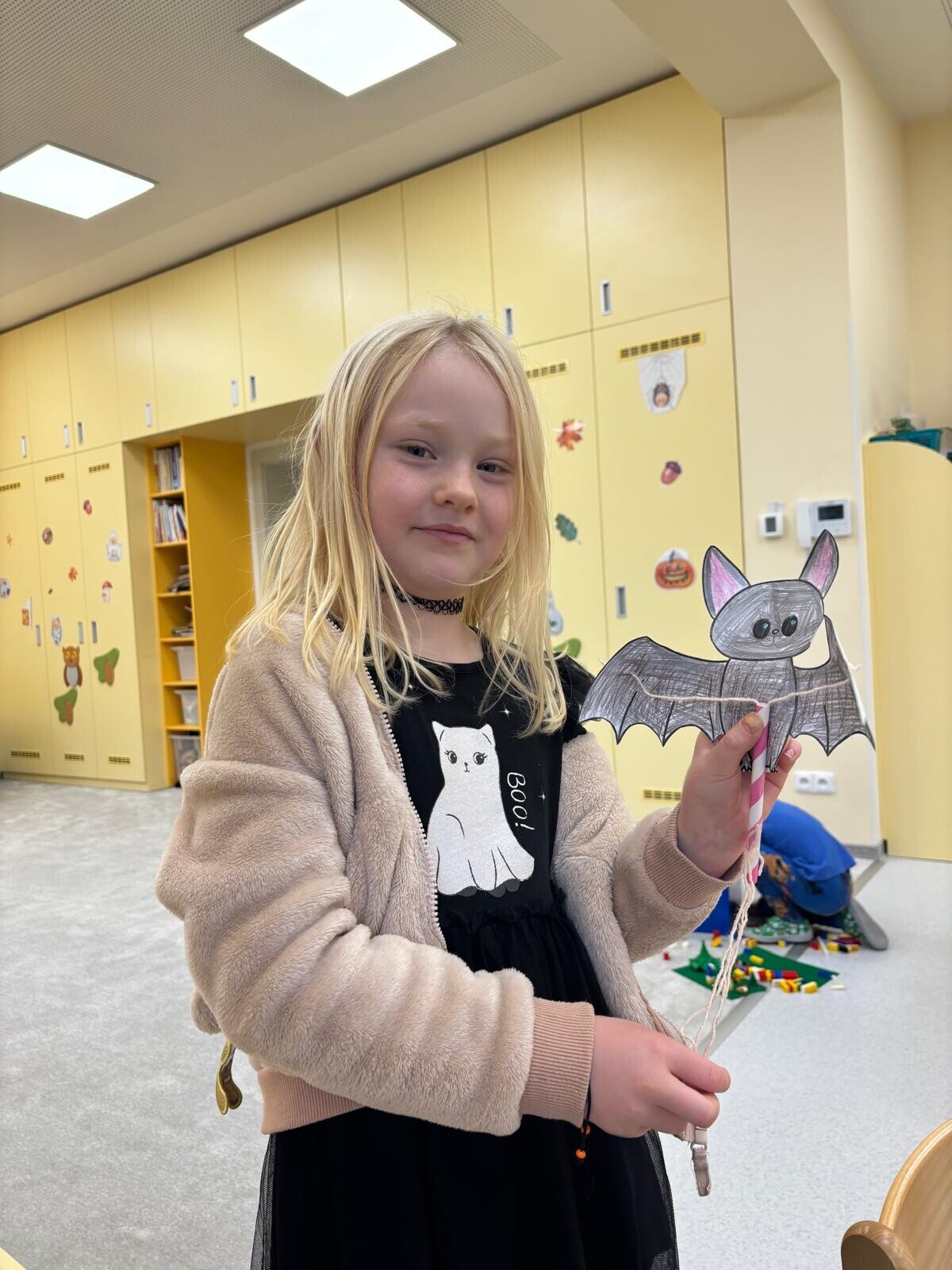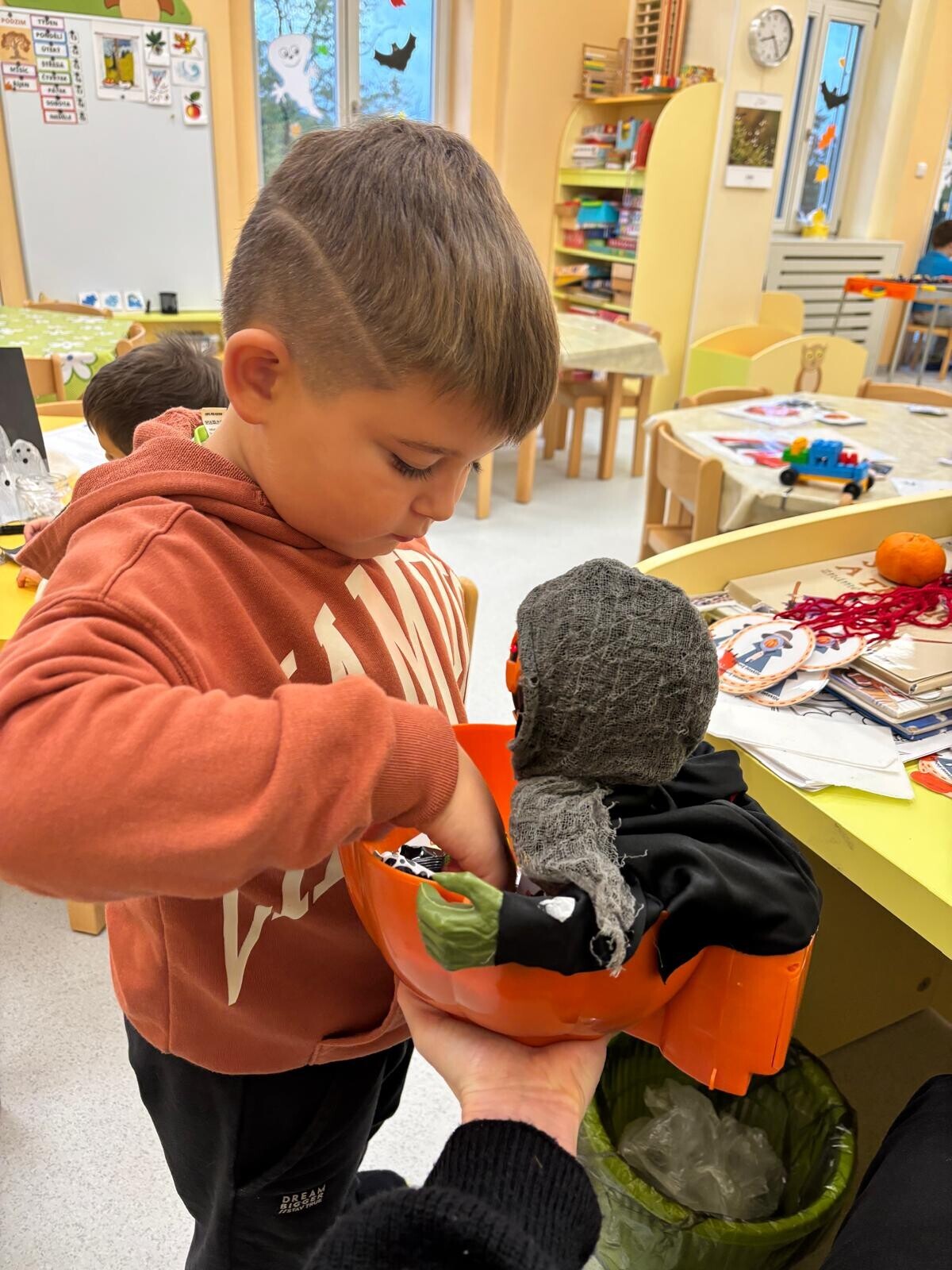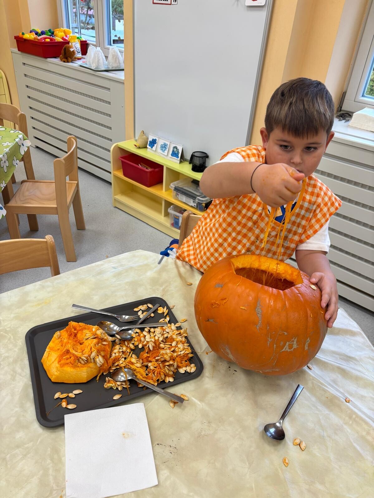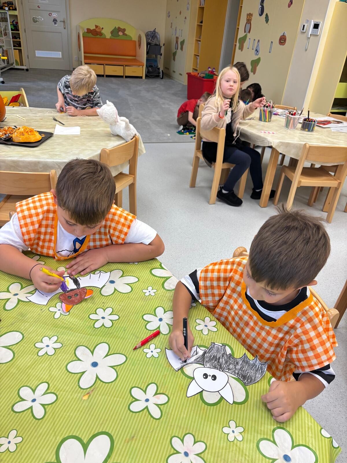 V tomto týdnu jsme se věnovaly tématu Strašidel se nebojíme. Povídali jsme si o Dušičkách i o Halloweenu. Děti si vytvořily dýně z dřevěných odřezků, létajícího papírového netopýra, ducha ze staré záclony, oční bulvu. Pomocí staré okenní stěrky namalovaly děti rodinku duchů, nezapomněli jsme ani na dlabání dýně a celý týden hrály děti hru Dýňový detektiv. Každý den hledaly děti 30 ztracených dýní, každý nálezce dýně si mohl vzít odměnu ze strašidelné misky a na konci týdne dostali všichni medaile Dýňový detektiv. Naučili jsme se také písničku Strašidla nebo básničku Dýně.