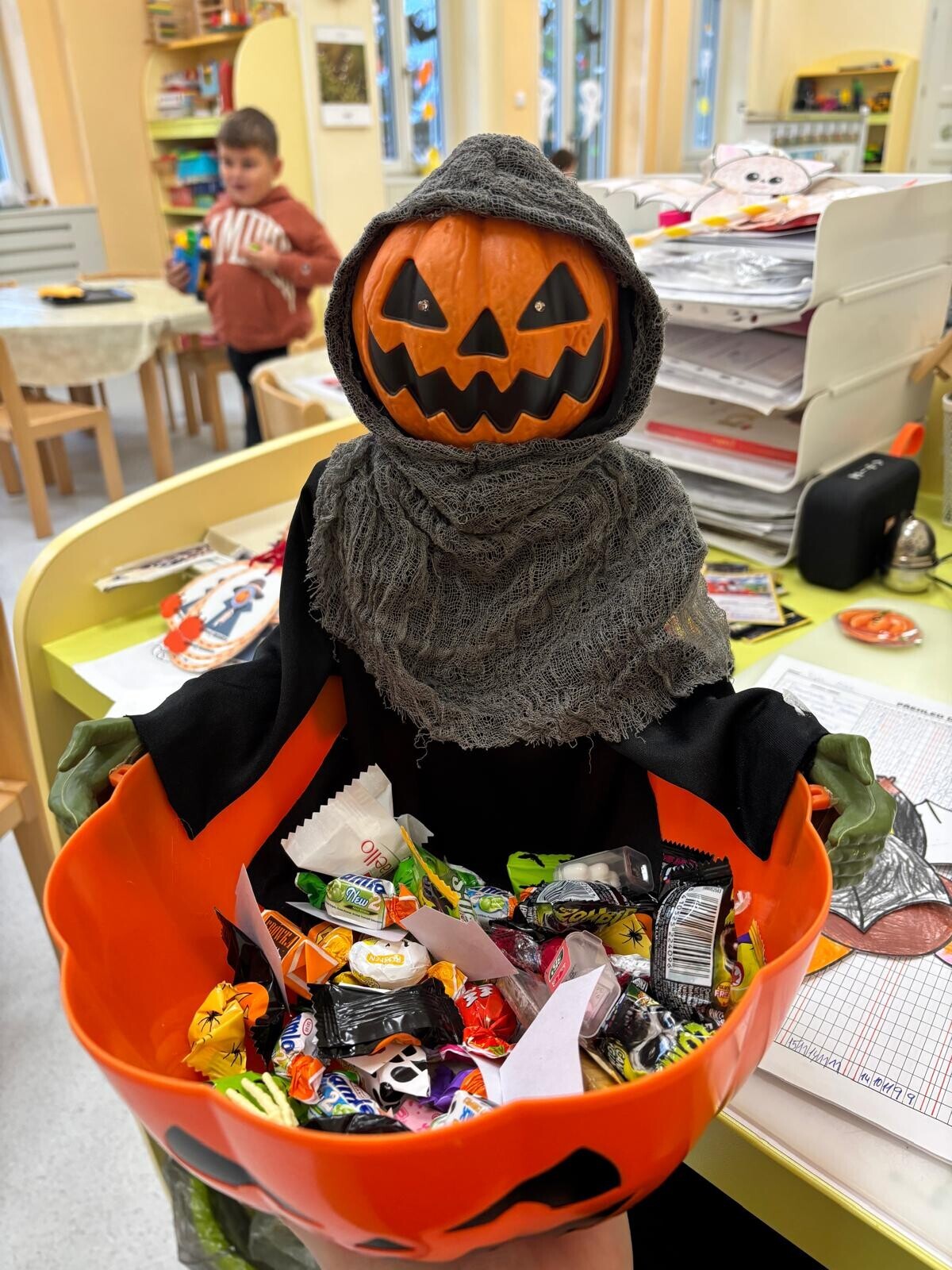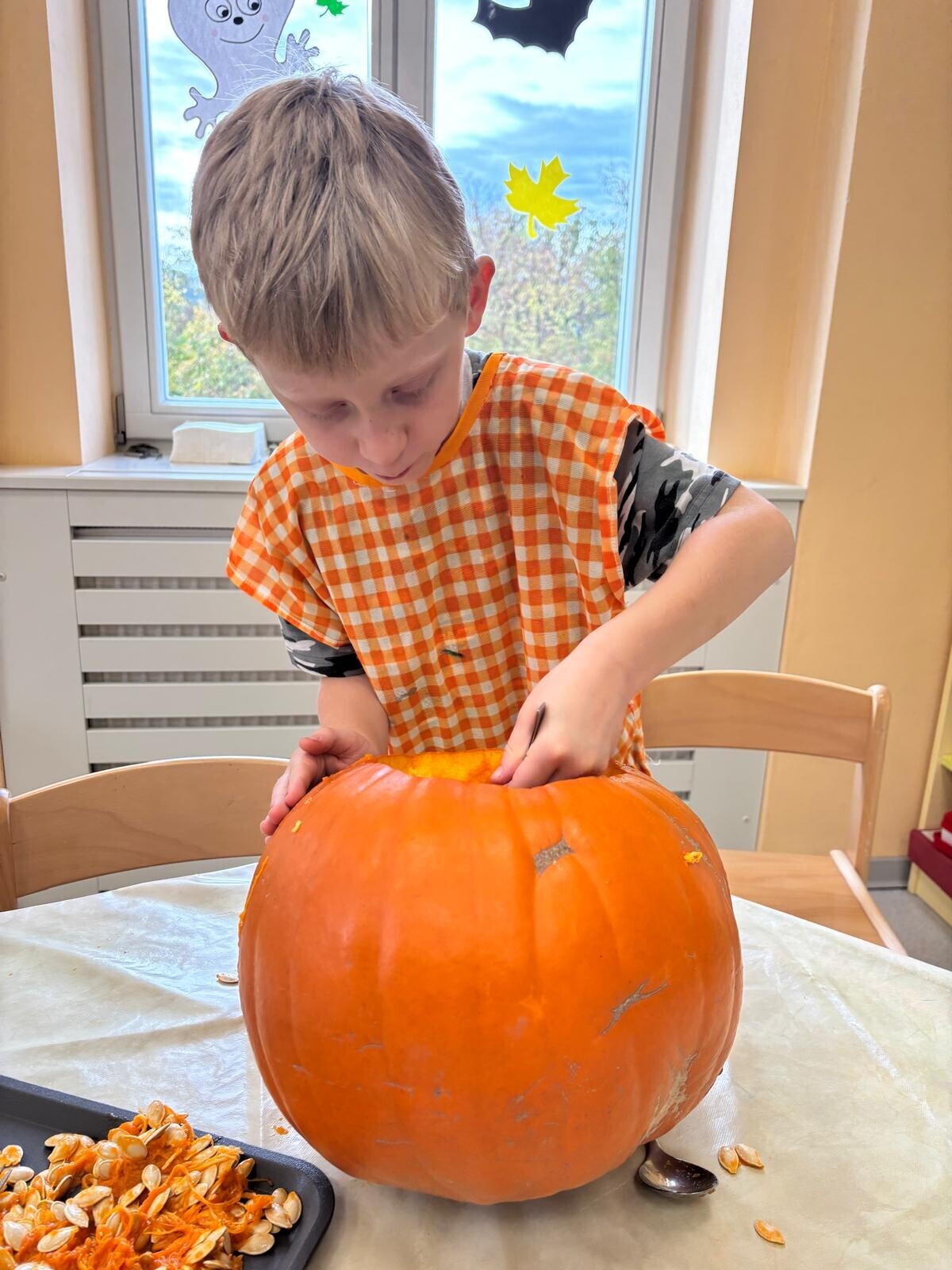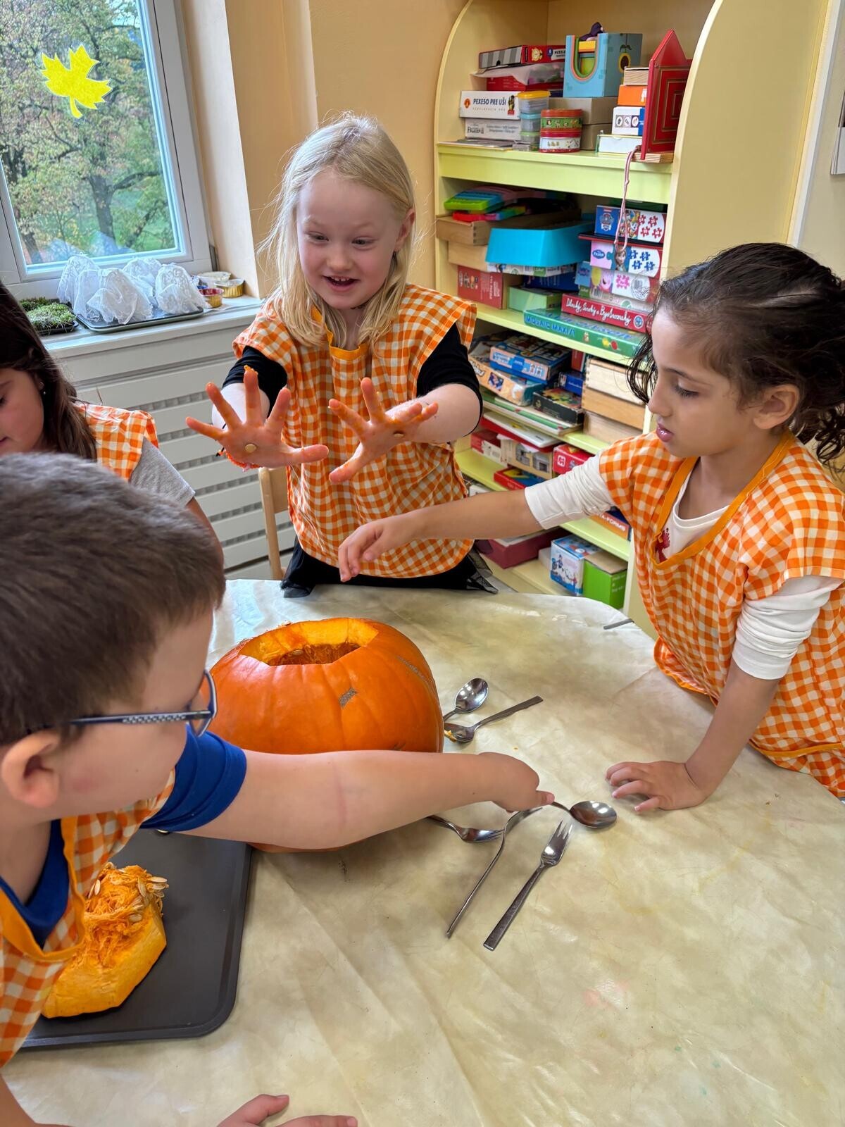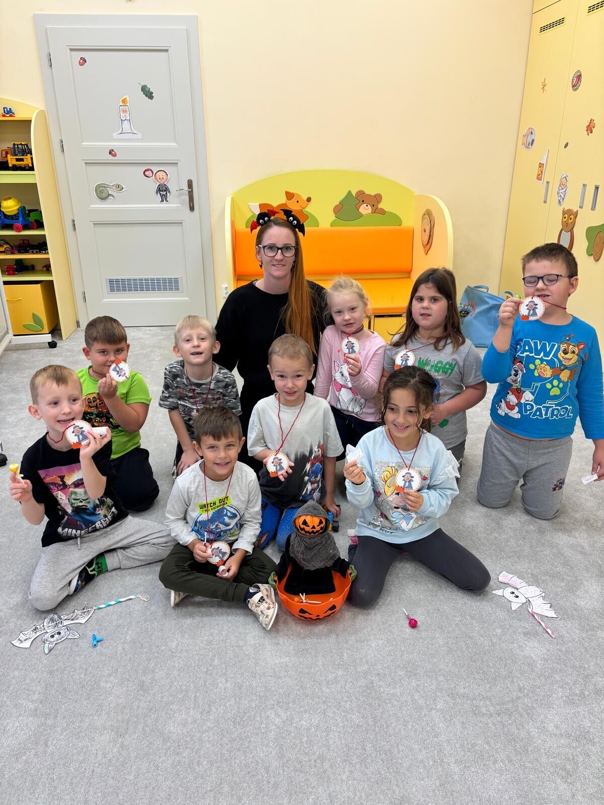 V tomto týdnu jsme se věnovaly tématu Strašidel se nebojíme. Povídali jsme si o Dušičkách i o Halloweenu. Děti si vytvořily dýně z dřevěných odřezků, létajícího papírového netopýra, ducha ze staré záclony, oční bulvu. Pomocí staré okenní stěrky namalovaly děti rodinku duchů, nezapomněli jsme ani na dlabání dýně a celý týden hrály děti hru Dýňový detektiv. Každý den hledaly děti 30 ztracených dýní, každý nálezce dýně si mohl vzít odměnu ze strašidelné misky a na konci týdne dostali všichni medaile Dýňový detektiv. Naučili jsme se také písničku Strašidla nebo básničku Dýně.