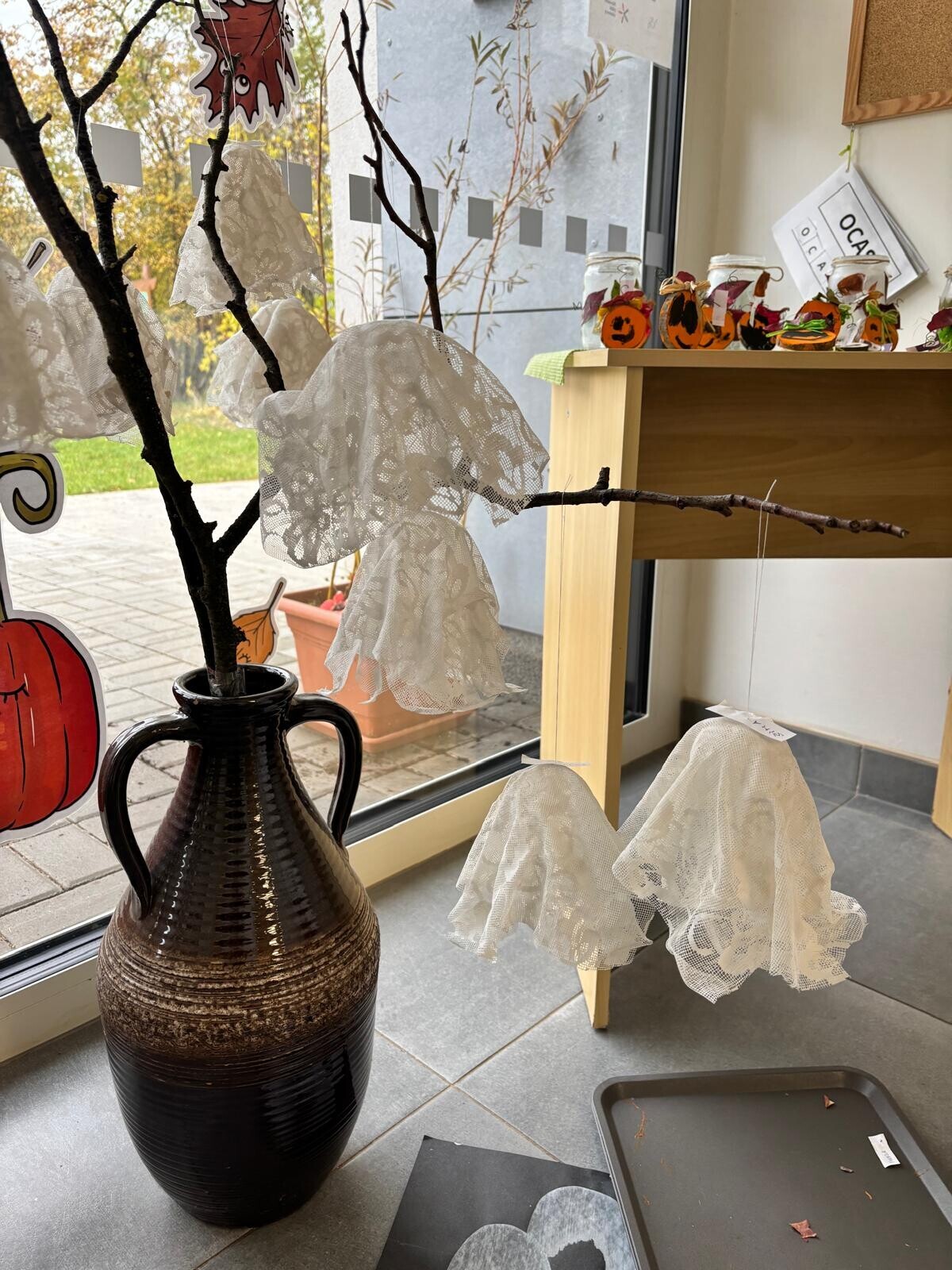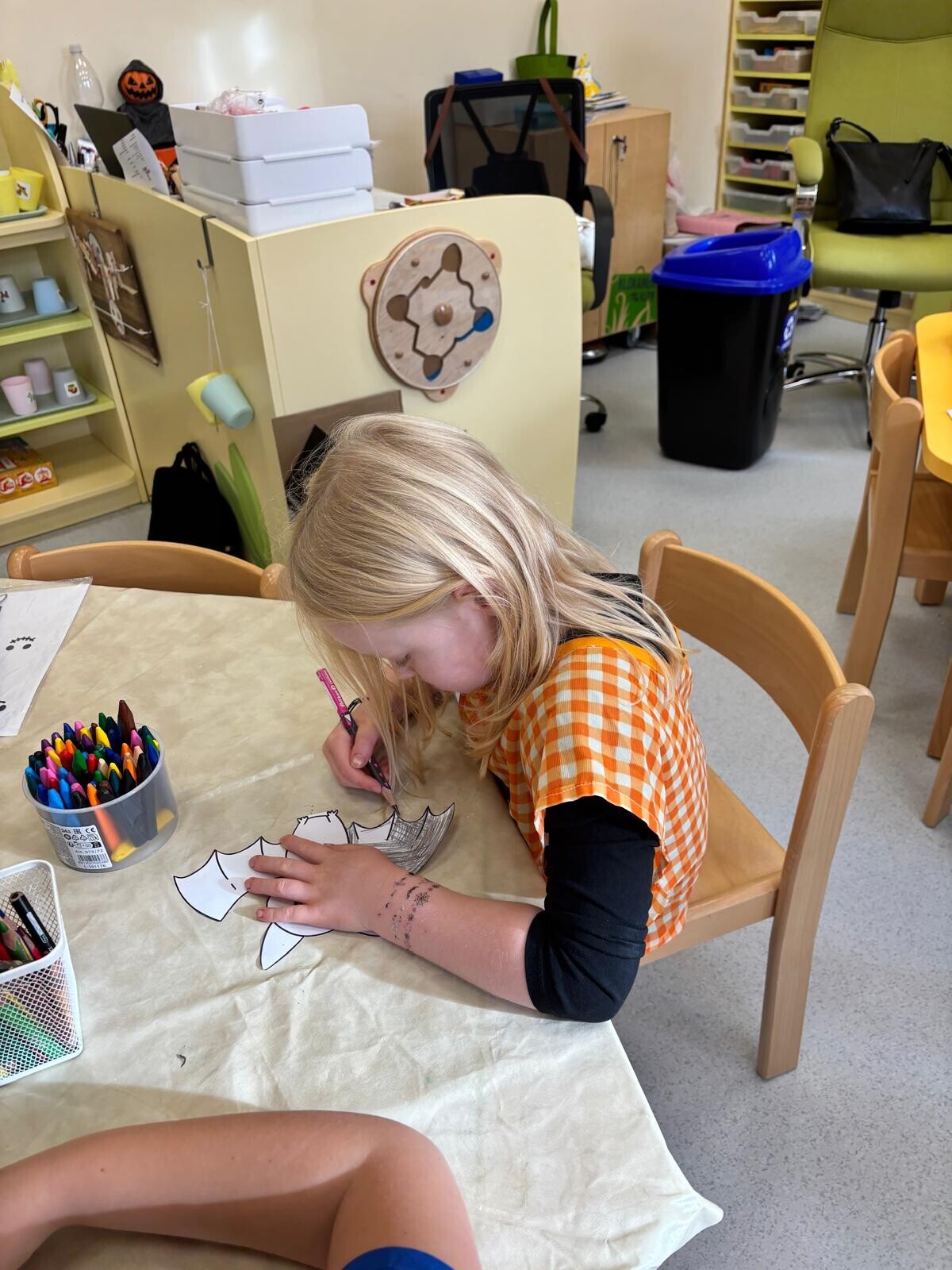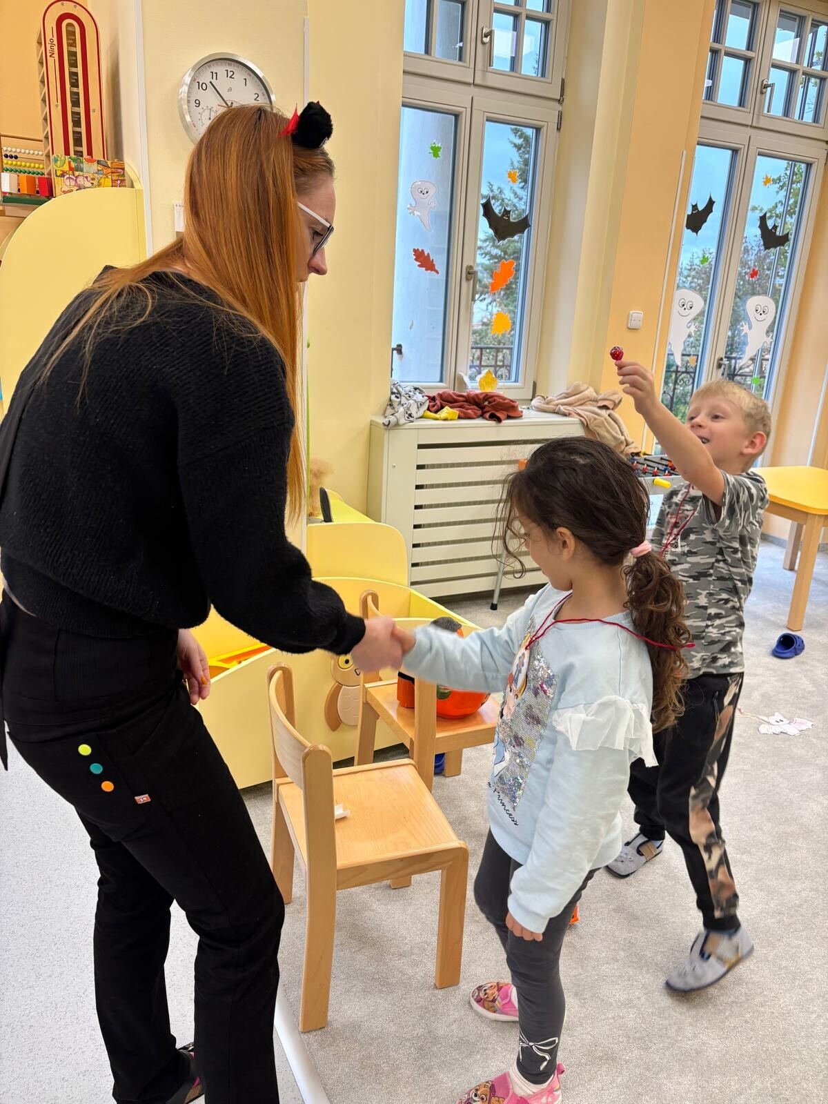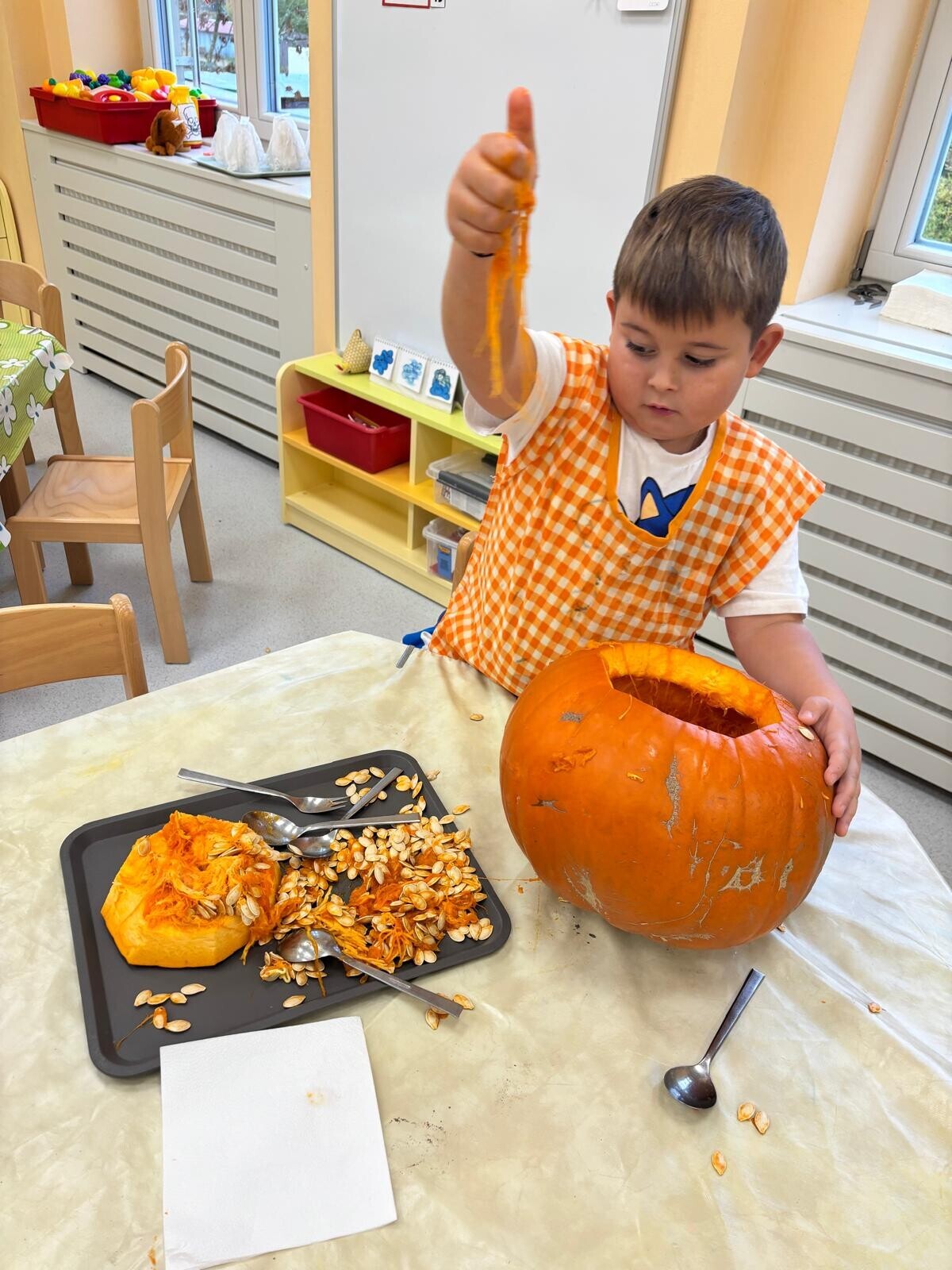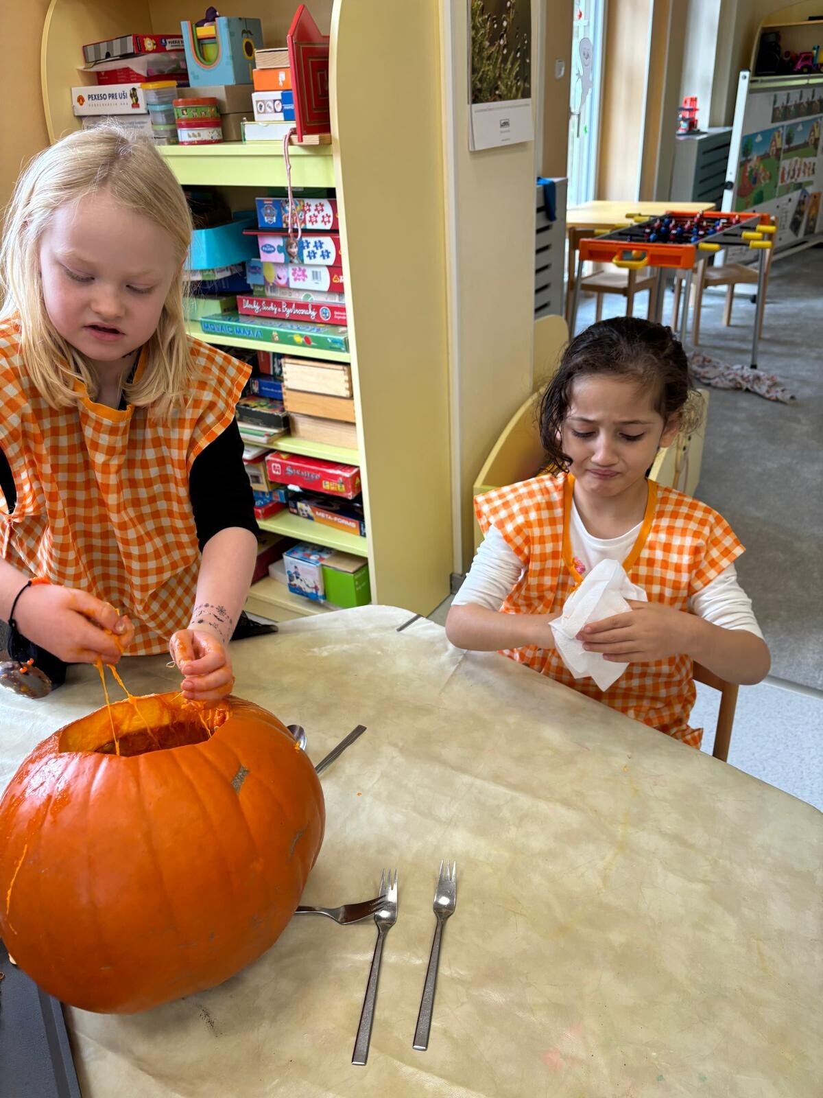 V tomto týdnu jsme se věnovaly tématu Strašidel se nebojíme. Povídali jsme si o Dušičkách i o Halloweenu. Děti si vytvořily dýně z dřevěných odřezků, létajícího papírového netopýra, ducha ze staré záclony, oční bulvu. Pomocí staré okenní stěrky namalovaly děti rodinku duchů, nezapomněli jsme ani na dlabání dýně a celý týden hrály děti hru Dýňový detektiv. Každý den hledaly děti 30 ztracených dýní, každý nálezce dýně si mohl vzít odměnu ze strašidelné misky a na konci týdne dostali všichni medaile Dýňový detektiv. Naučili jsme se také písničku Strašidla nebo básničku Dýně.