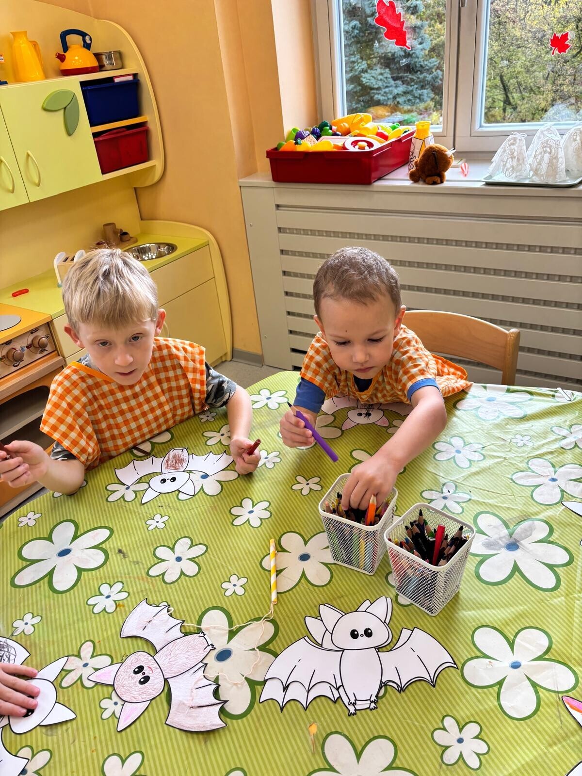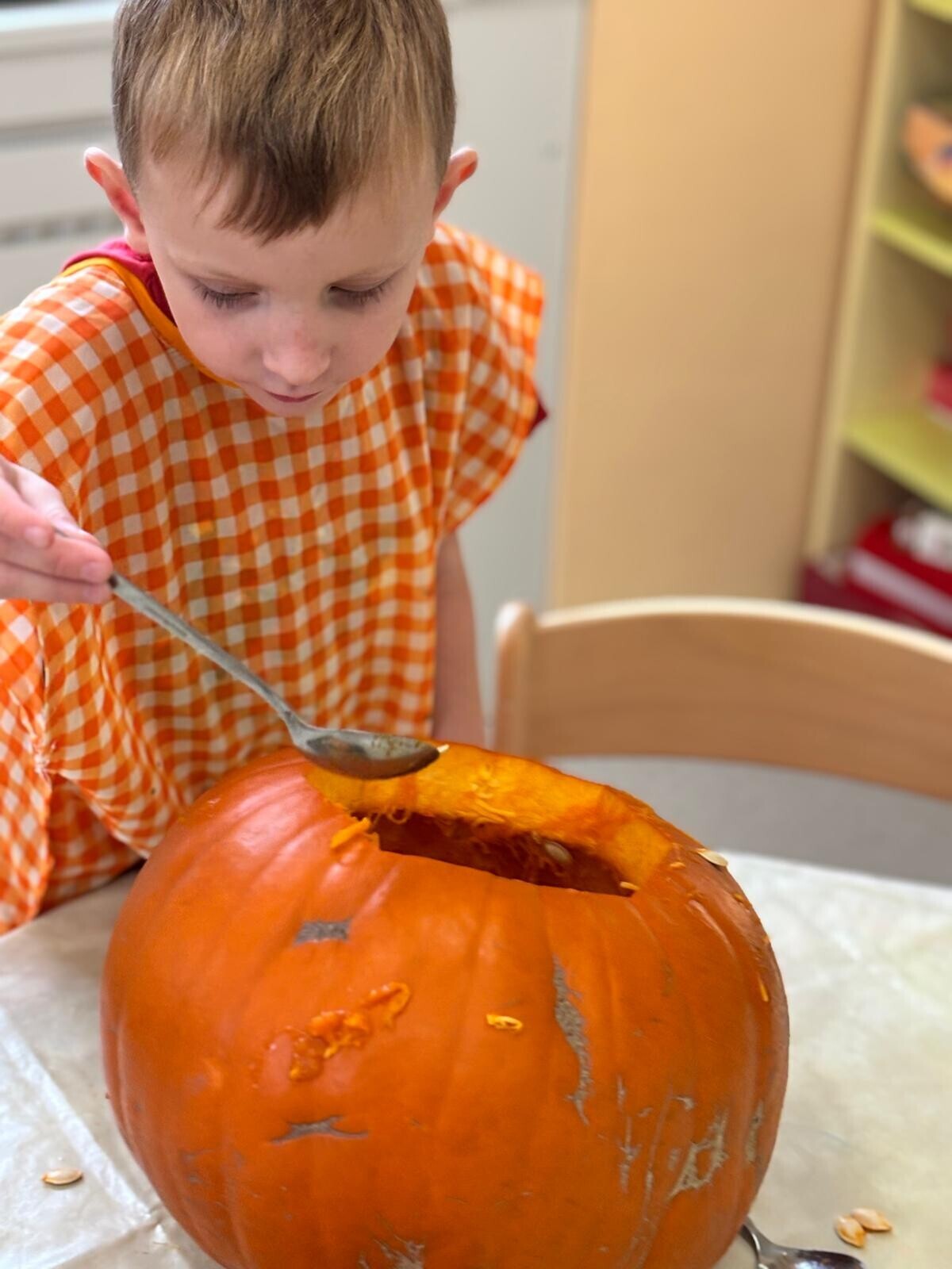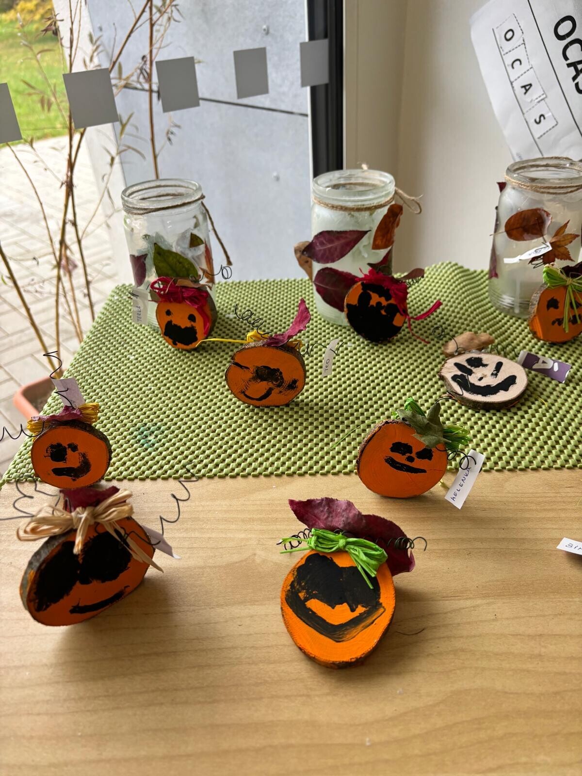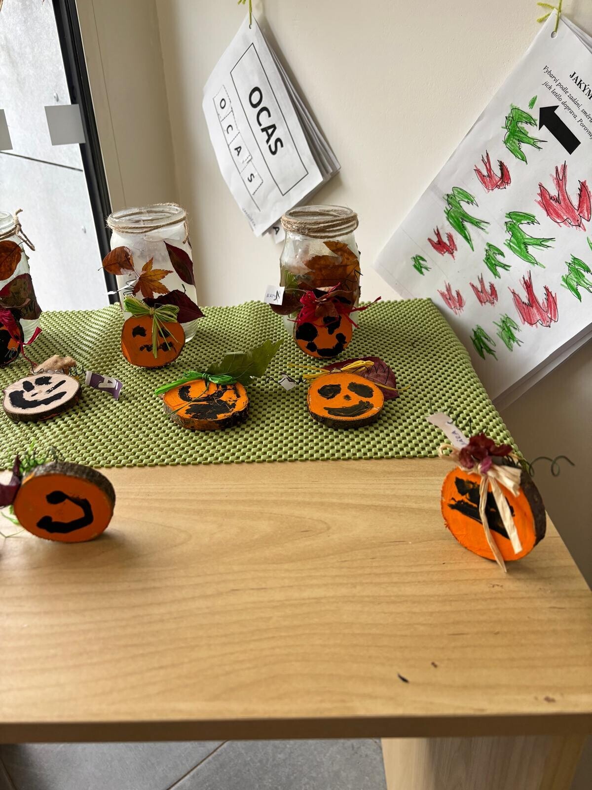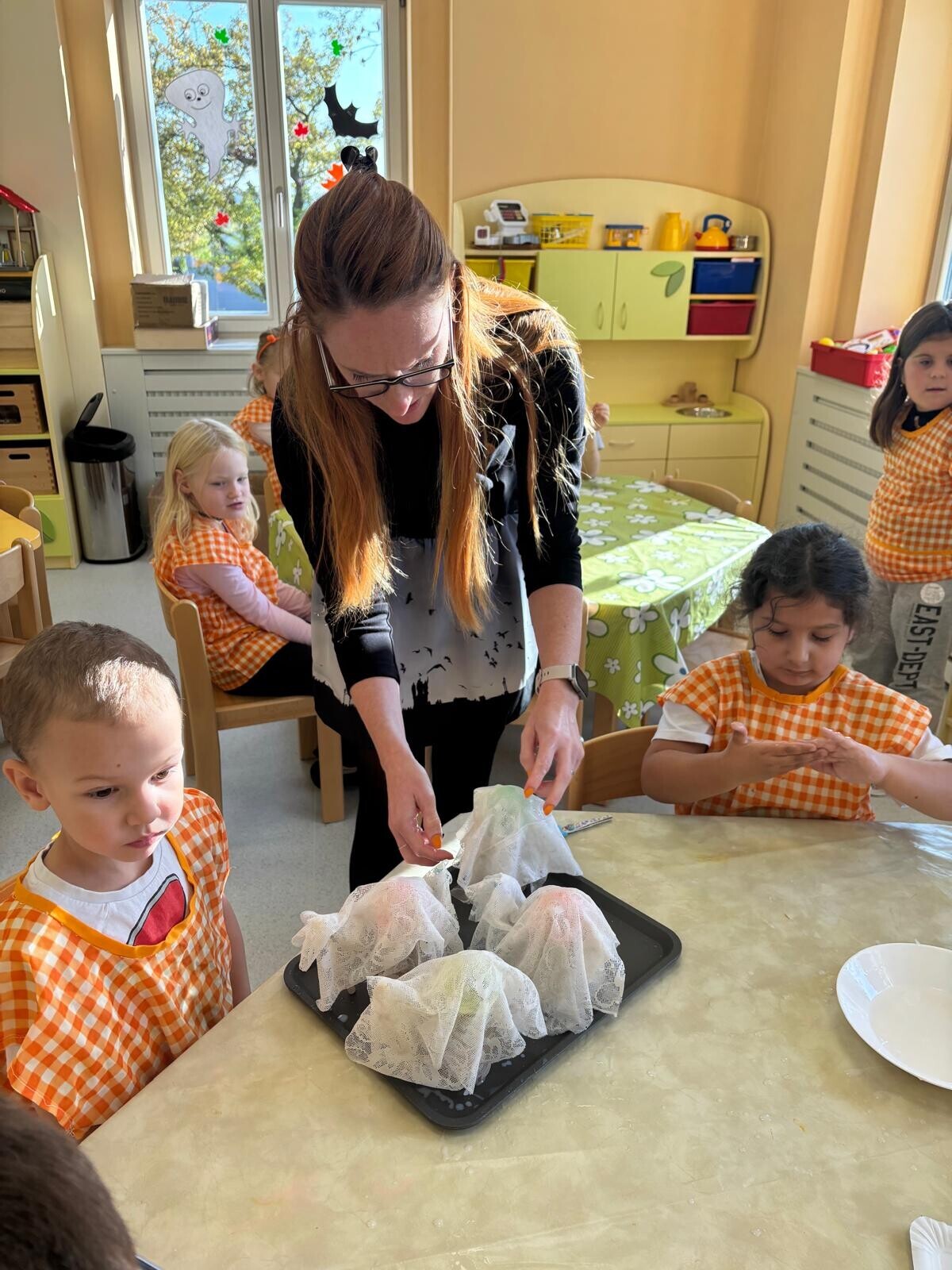 V tomto týdnu jsme se věnovaly tématu Strašidel se nebojíme. Povídali jsme si o Dušičkách i o Halloweenu. Děti si vytvořily dýně z dřevěných odřezků, létajícího papírového netopýra, ducha ze staré záclony, oční bulvu. Pomocí staré okenní stěrky namalovaly děti rodinku duchů, nezapomněli jsme ani na dlabání dýně a celý týden hrály děti hru Dýňový detektiv. Každý den hledaly děti 30 ztracených dýní, každý nálezce dýně si mohl vzít odměnu ze strašidelné misky a na konci týdne dostali všichni medaile Dýňový detektiv. Naučili jsme se také písničku Strašidla nebo básničku Dýně.