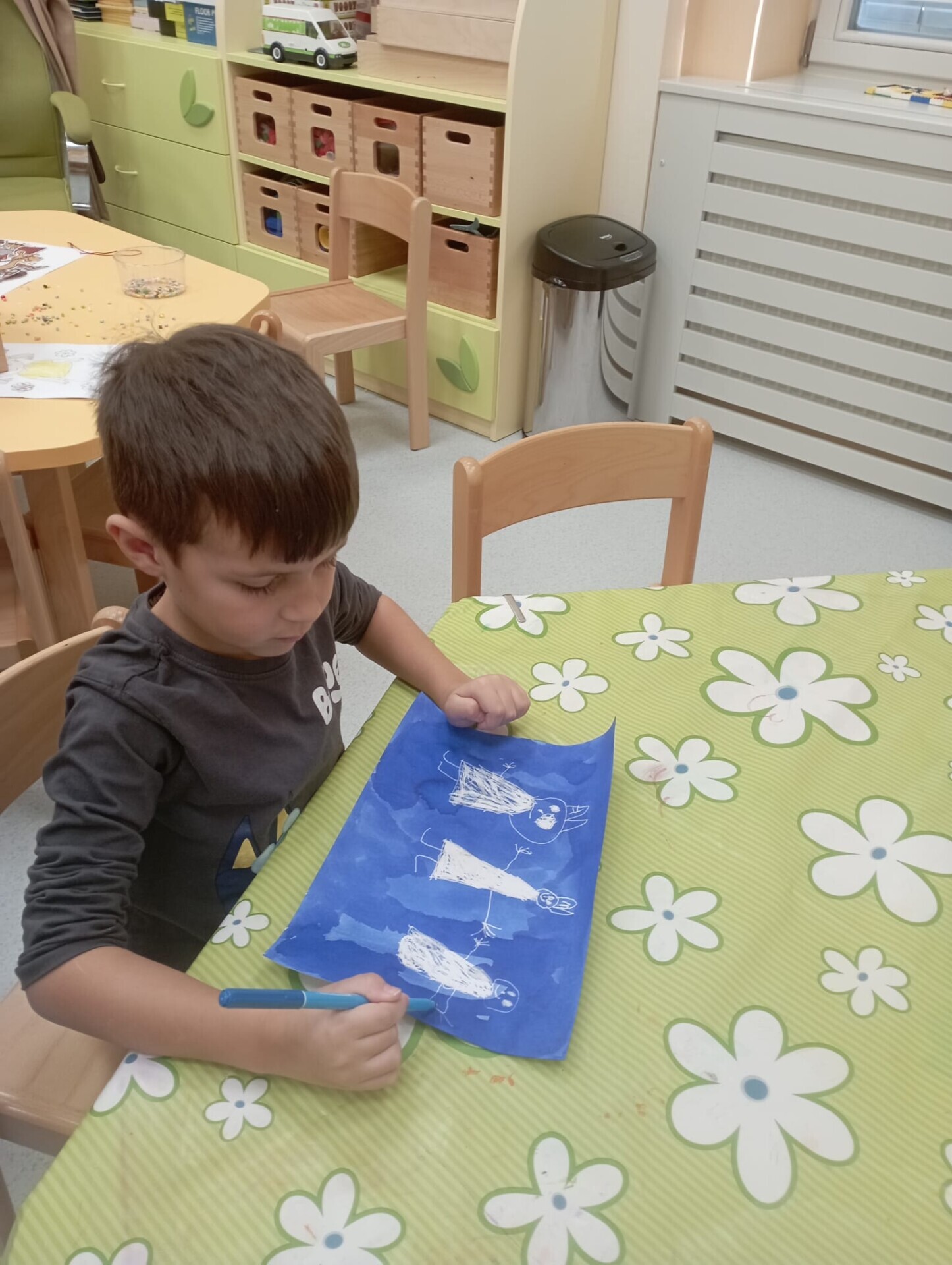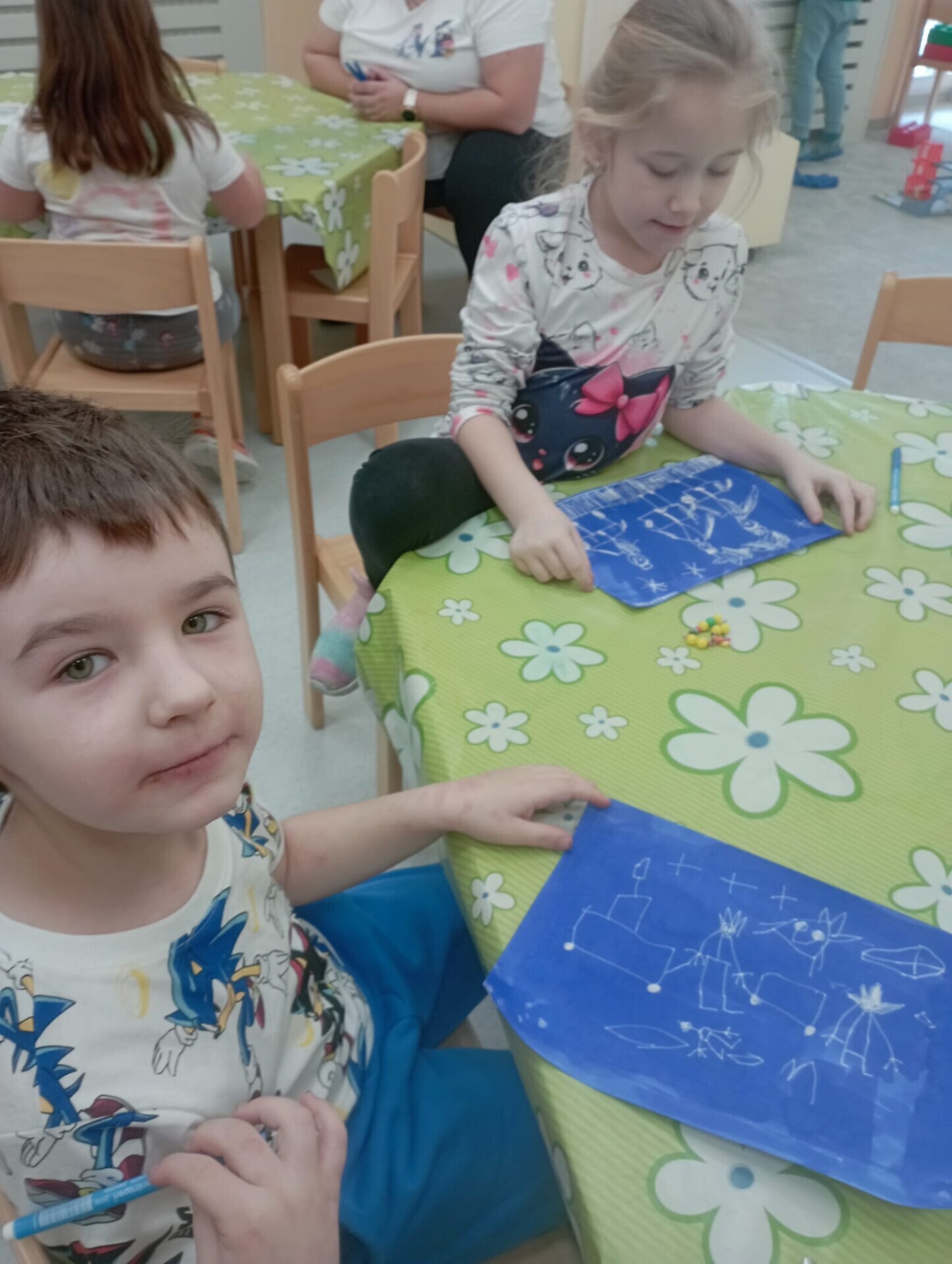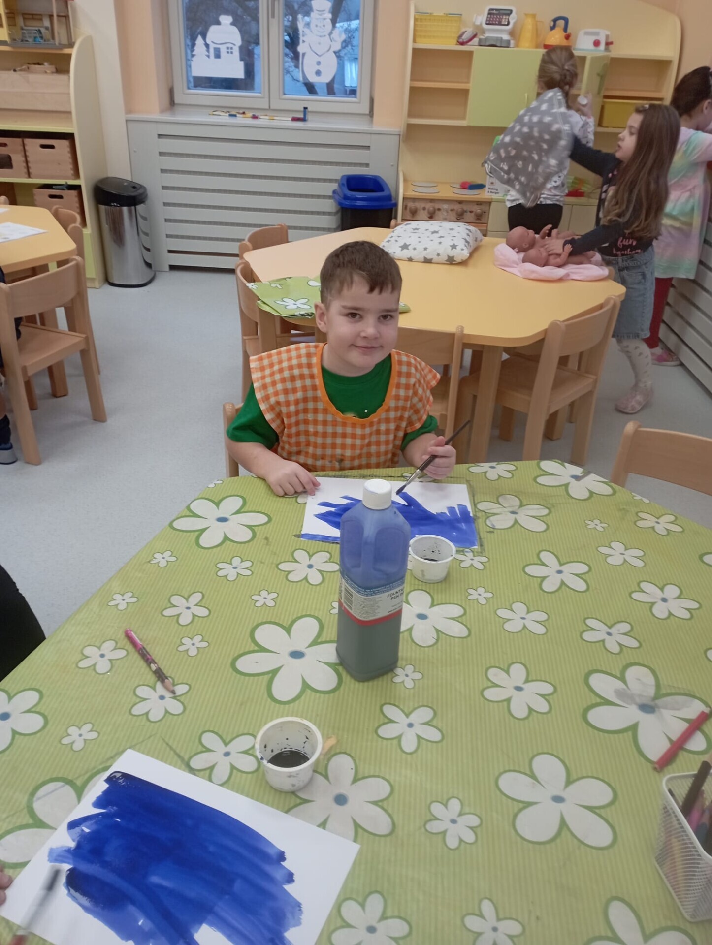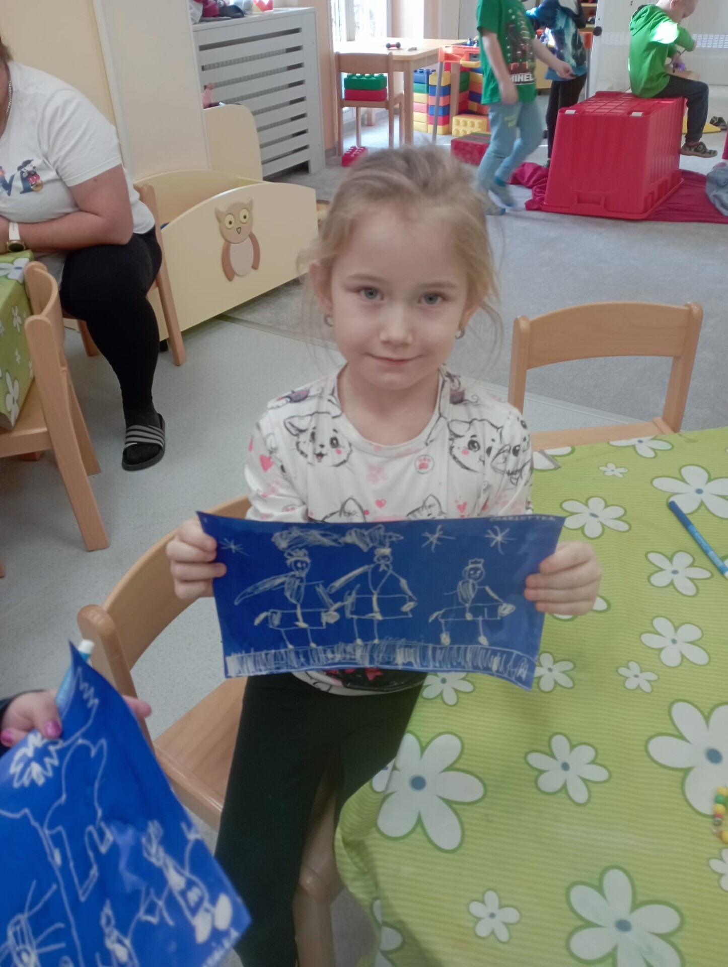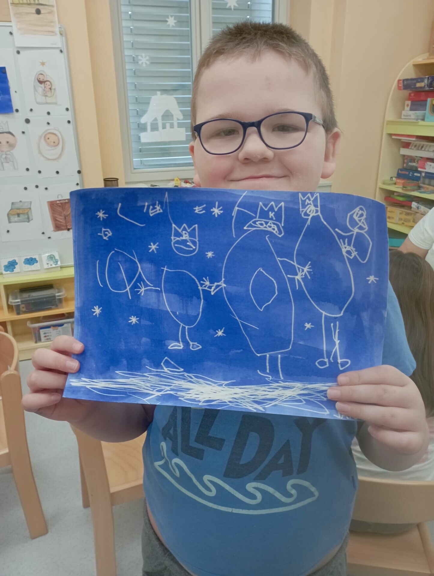 Po vánočních prázdninách se děti ve třídě Soviček dozvěděly něco o Třech králích. V tento týden si procvičovaly jemnou motoriku, orientaci v prostoru, nápodobu písma, tvořivost a fantazii. Získaly nové informace a znalosti o daném tématu. Při komunikativním kruhu měl každý možnost ostatní dětem vyprávět o prožití vánočních svátků a tím se naučit mluvit před ostatními, zbavit se ostychu mluvit na "veřejnosti". Pomocí okenní stěrky vyrobily tři krále z temper a vyzkoušely si i kouzelnou fixu (zmizík).