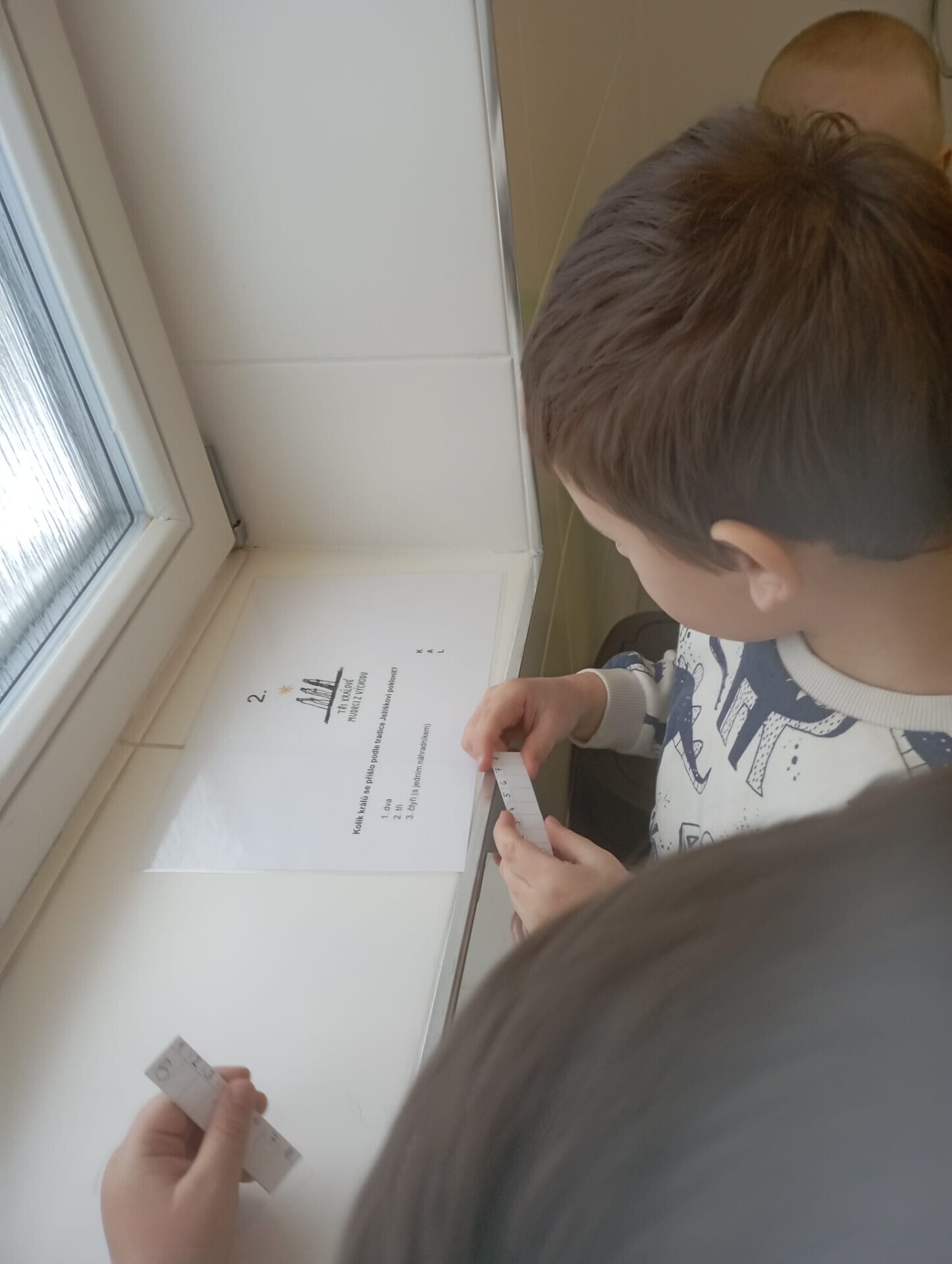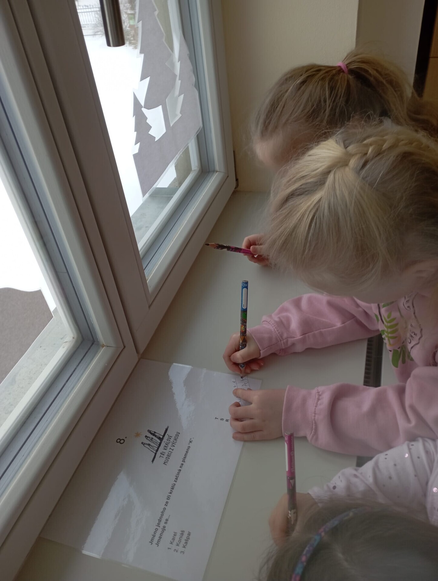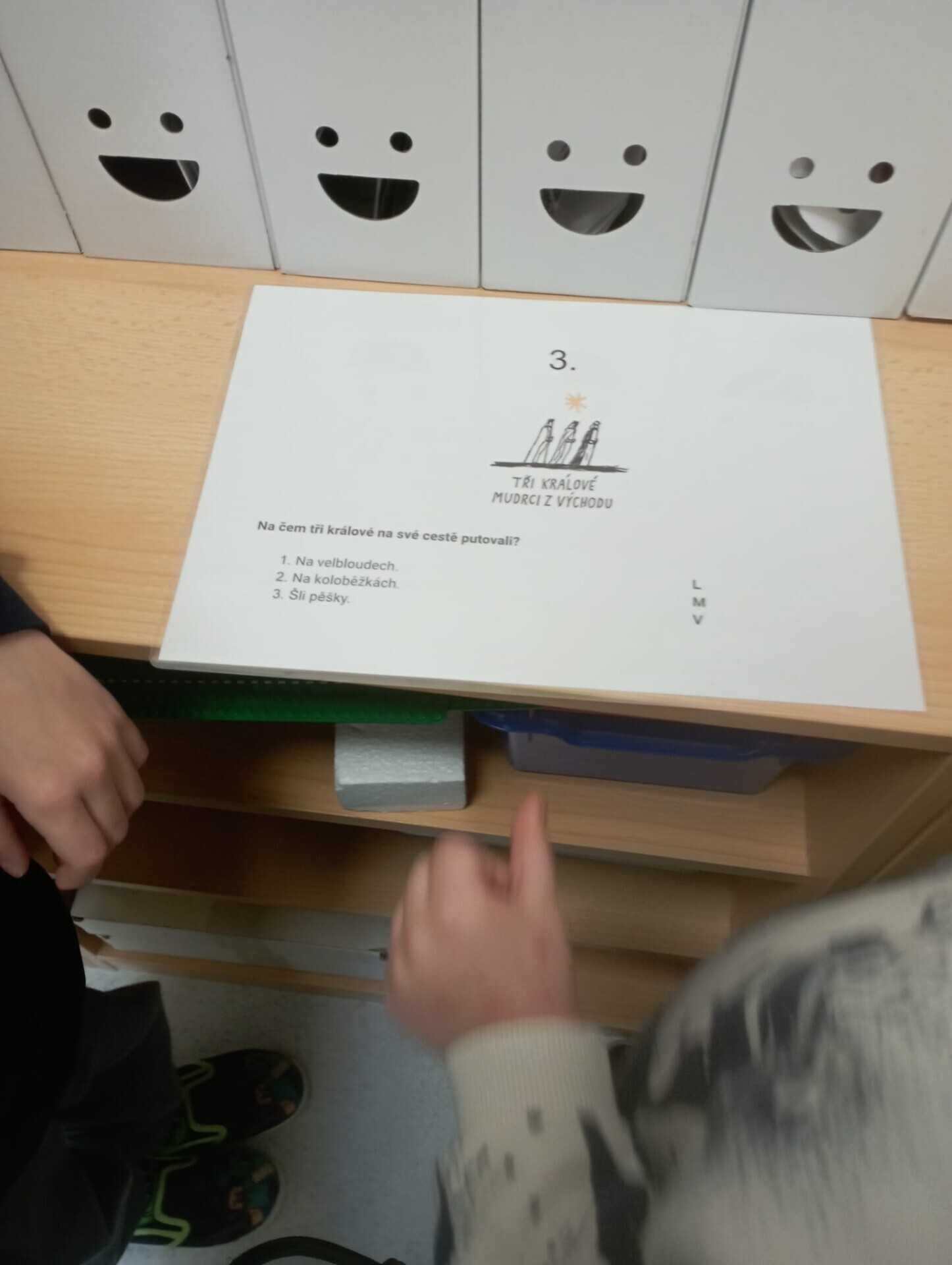 Ve čtvrtek 8. ledna 2026 jsme si pro děti ve třídě Soviček vymyslely Tříkrálovou stezku, kde děti uplatnily získané infomrace daného tématu. Na každém stanovisšti měly děti otázku a k ní 3 odpovědi. U každé z odpovědí bylo i písmenko, které se děti pokusily napodobit a pokud vše vyluštily správně, vyšlo jim v tajence jméno Baltazar.