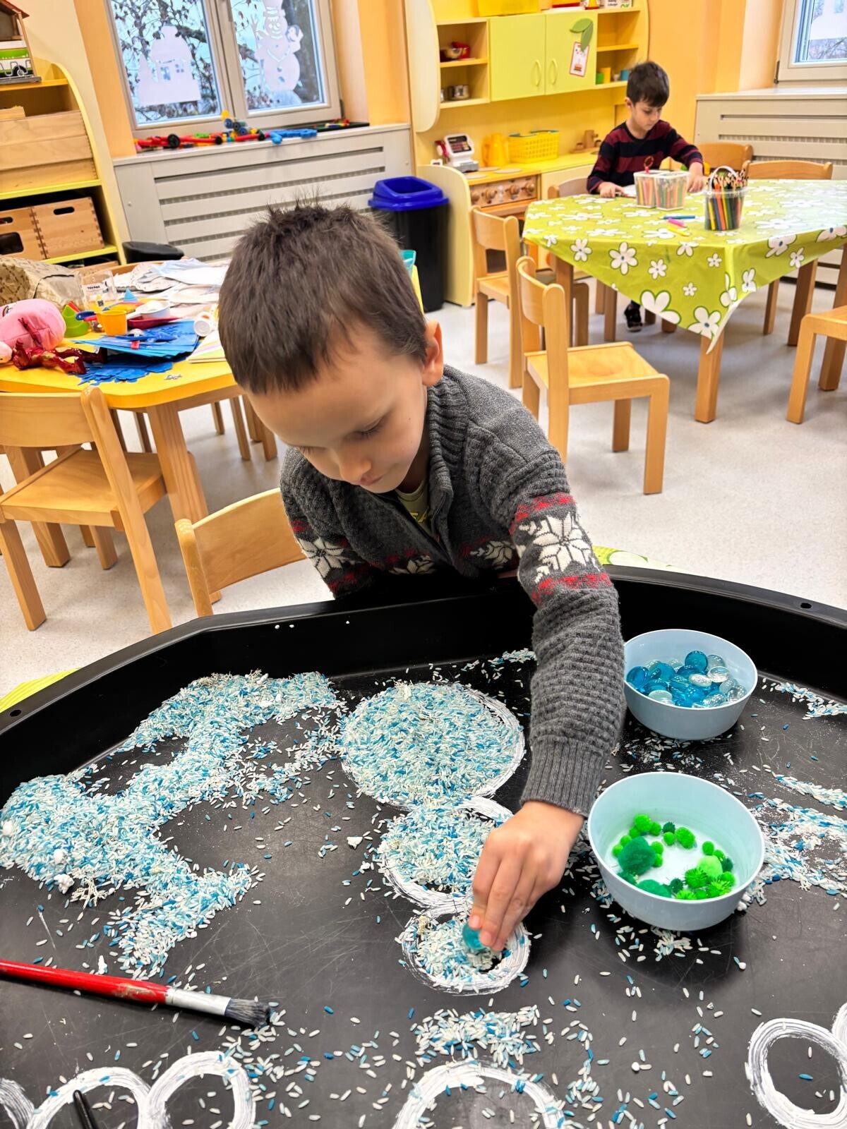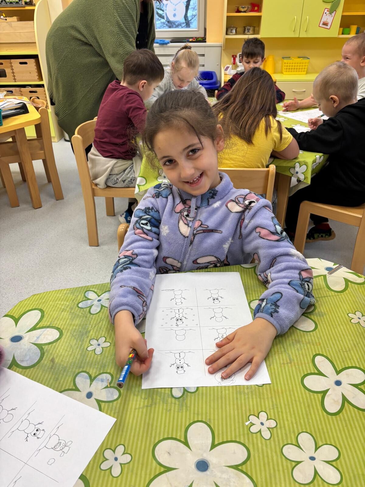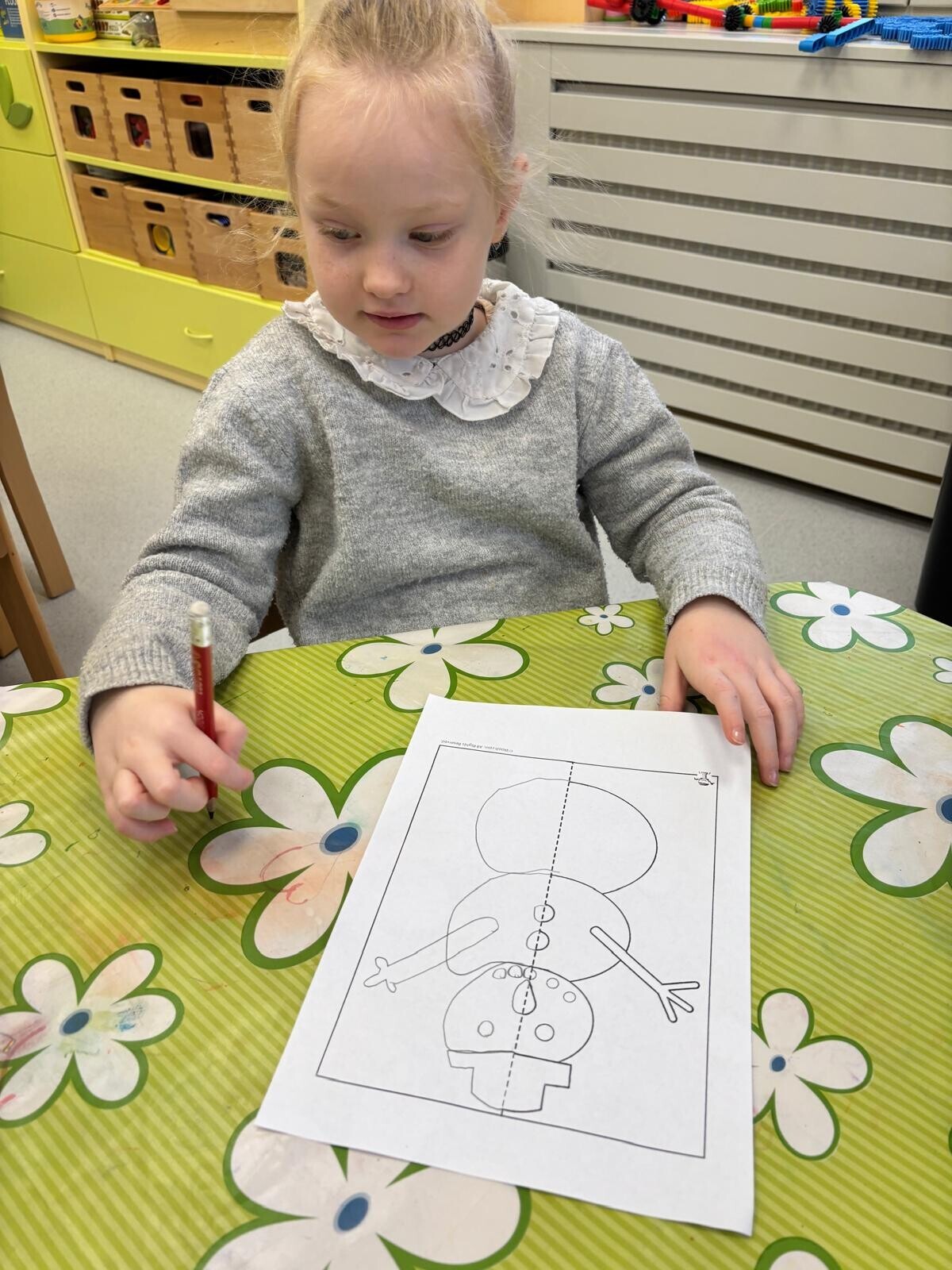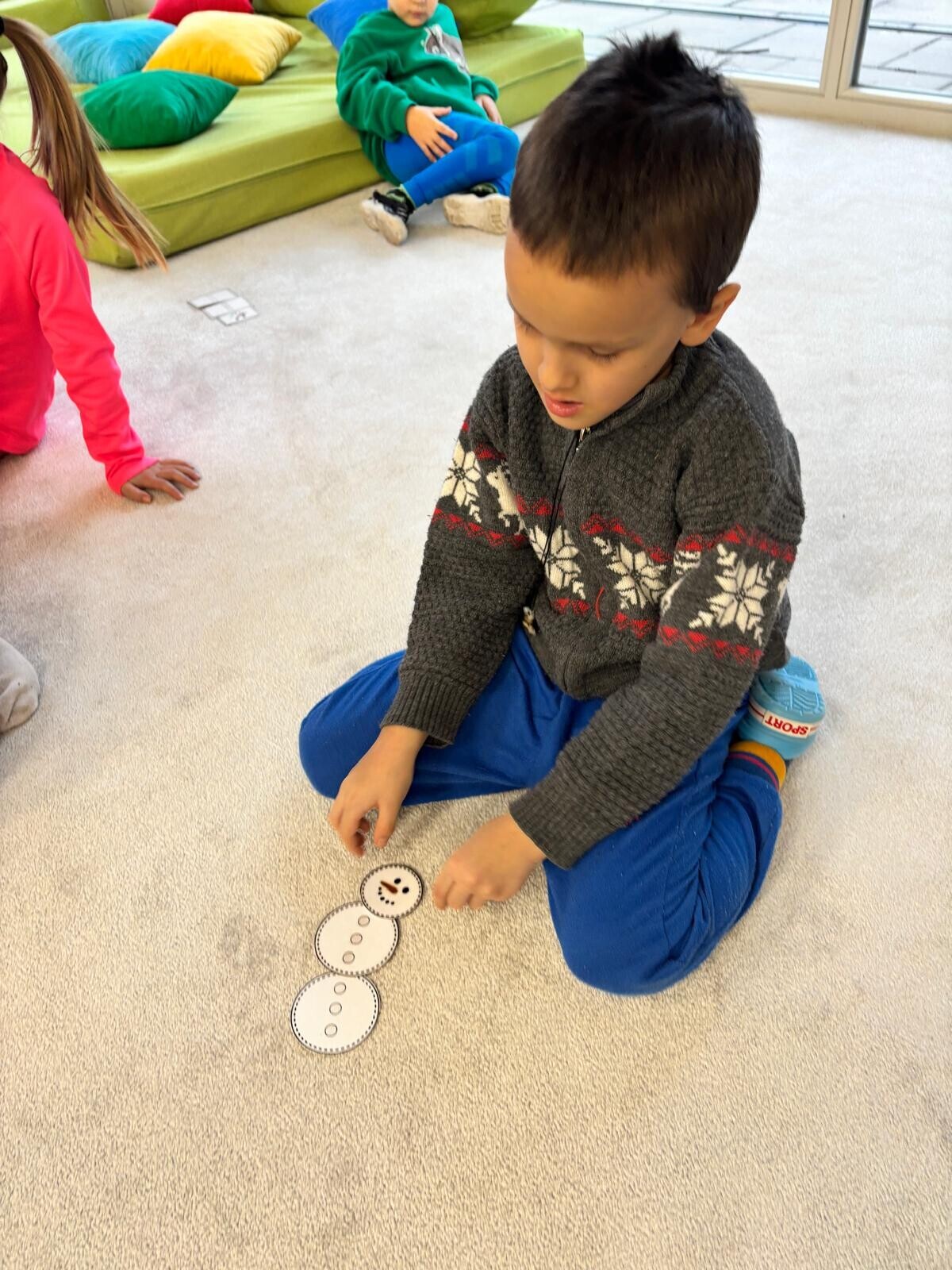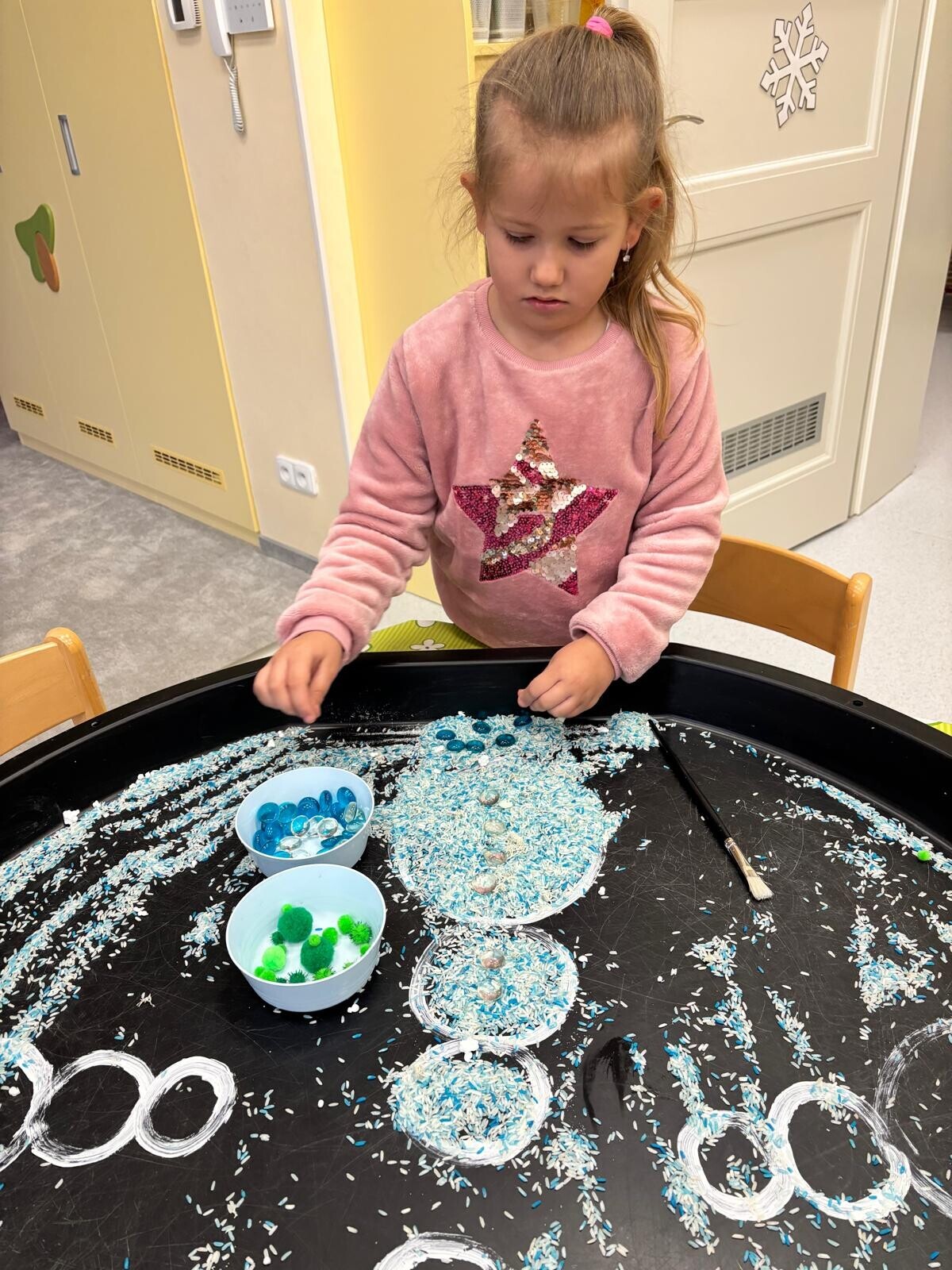 Tento týden si děti povídaly o tom, jaká máme roční období a proč se vlastně střídají. Dozvěděly se něco málo o rotaci Zeměkoule kolem Slunce a na planetu Zemi si i zahrály. Procvičily si osovou souměrnost, dech nebo i geometrické tvary, při navlékání korálků pak třeba jemnou motoriku. Pomocí obtisku pak namalovaly krásné sněhuláky. Naučily se i básničku a písničku k danému tématu.