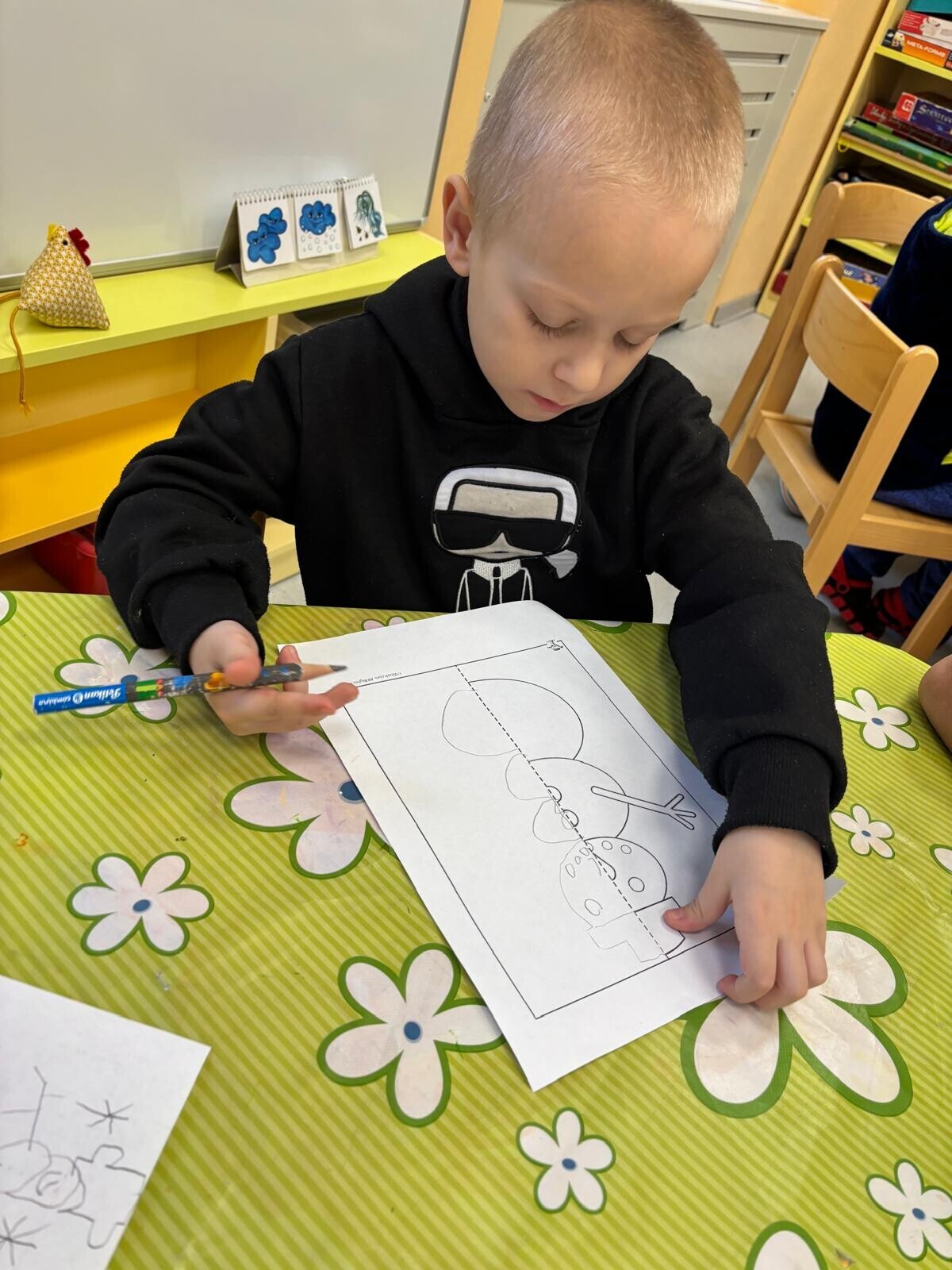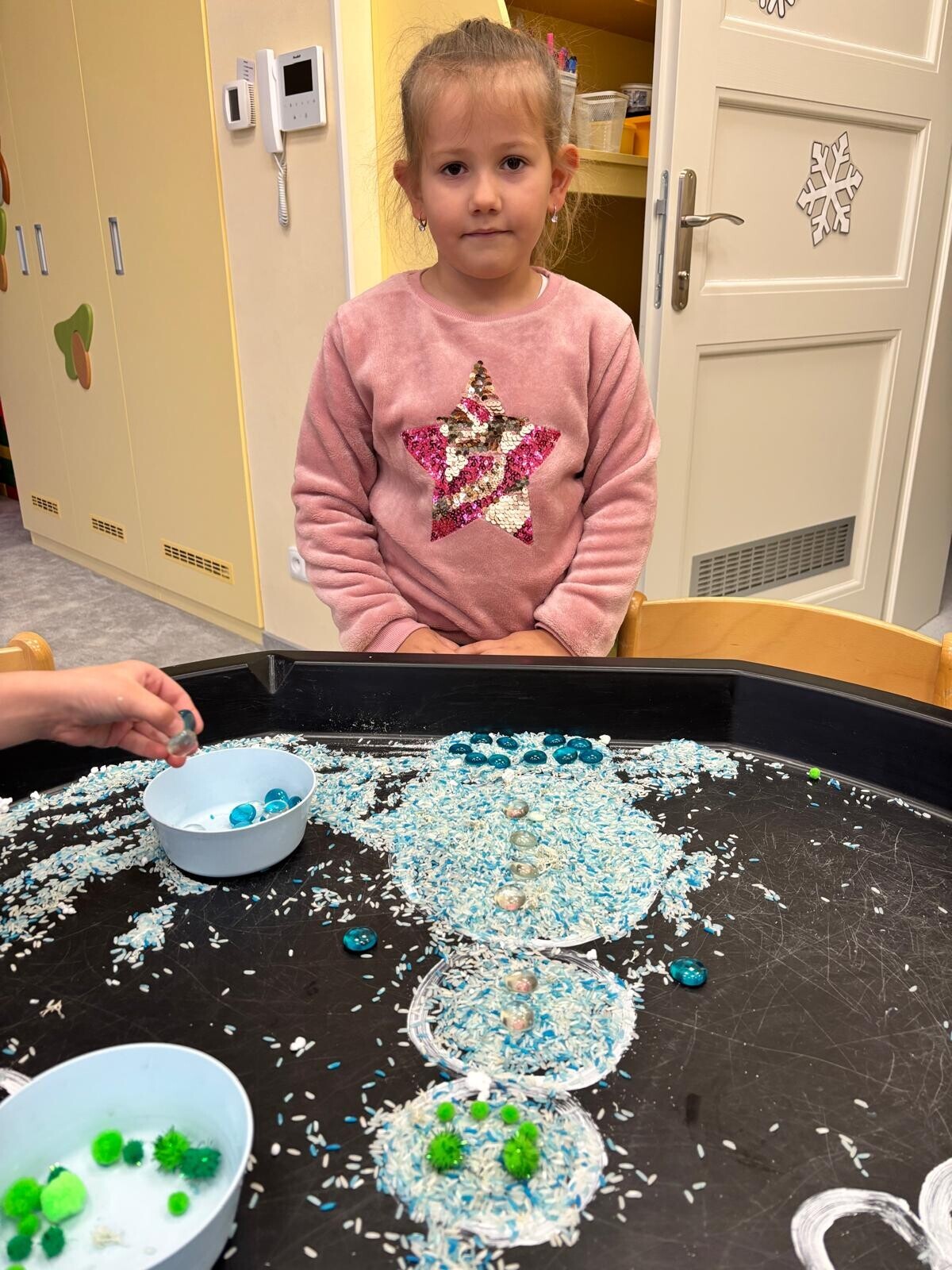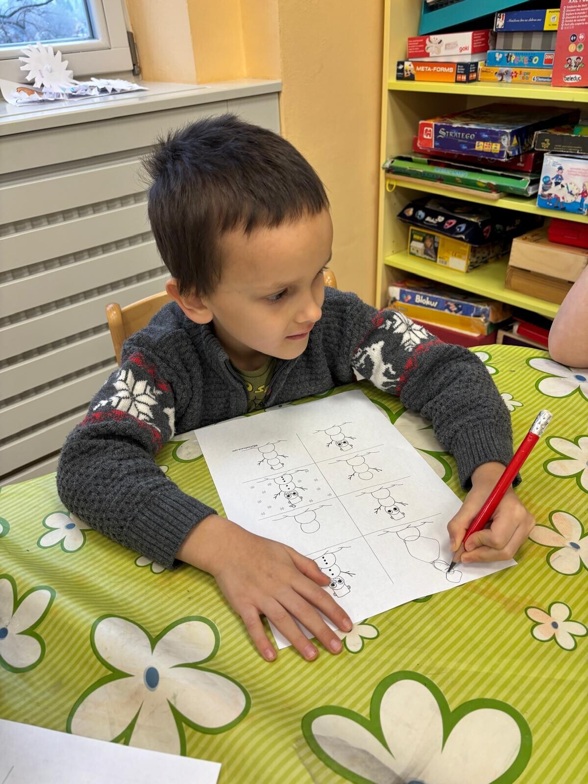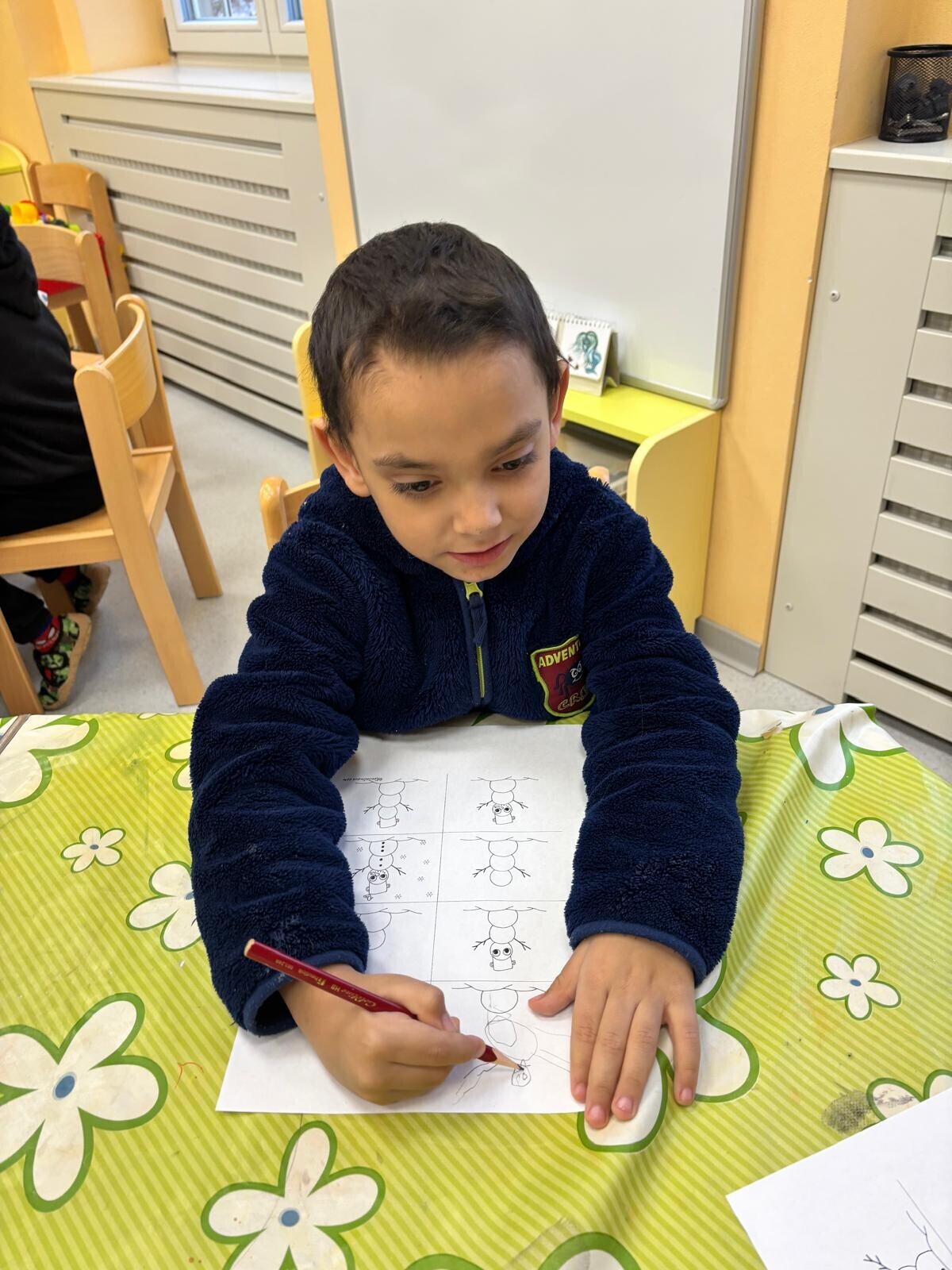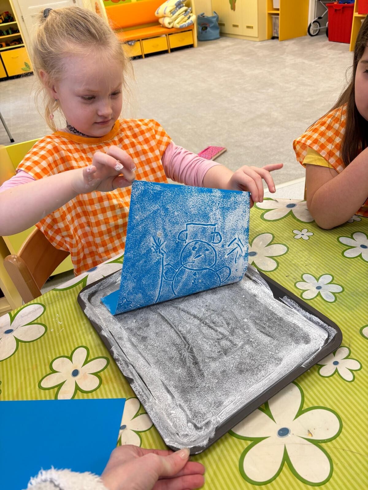 Tento týden si děti povídaly o tom, jaká máme roční období a proč se vlastně střídají. Dozvěděly se něco málo o rotaci Zeměkoule kolem Slunce a na planetu Zemi si i zahrály. Procvičily si osovou souměrnost, dech nebo i geometrické tvary, při navlékání korálků pak třeba jemnou motoriku. Pomocí obtisku pak namalovaly krásné sněhuláky. Naučily se i básničku a písničku k danému tématu.