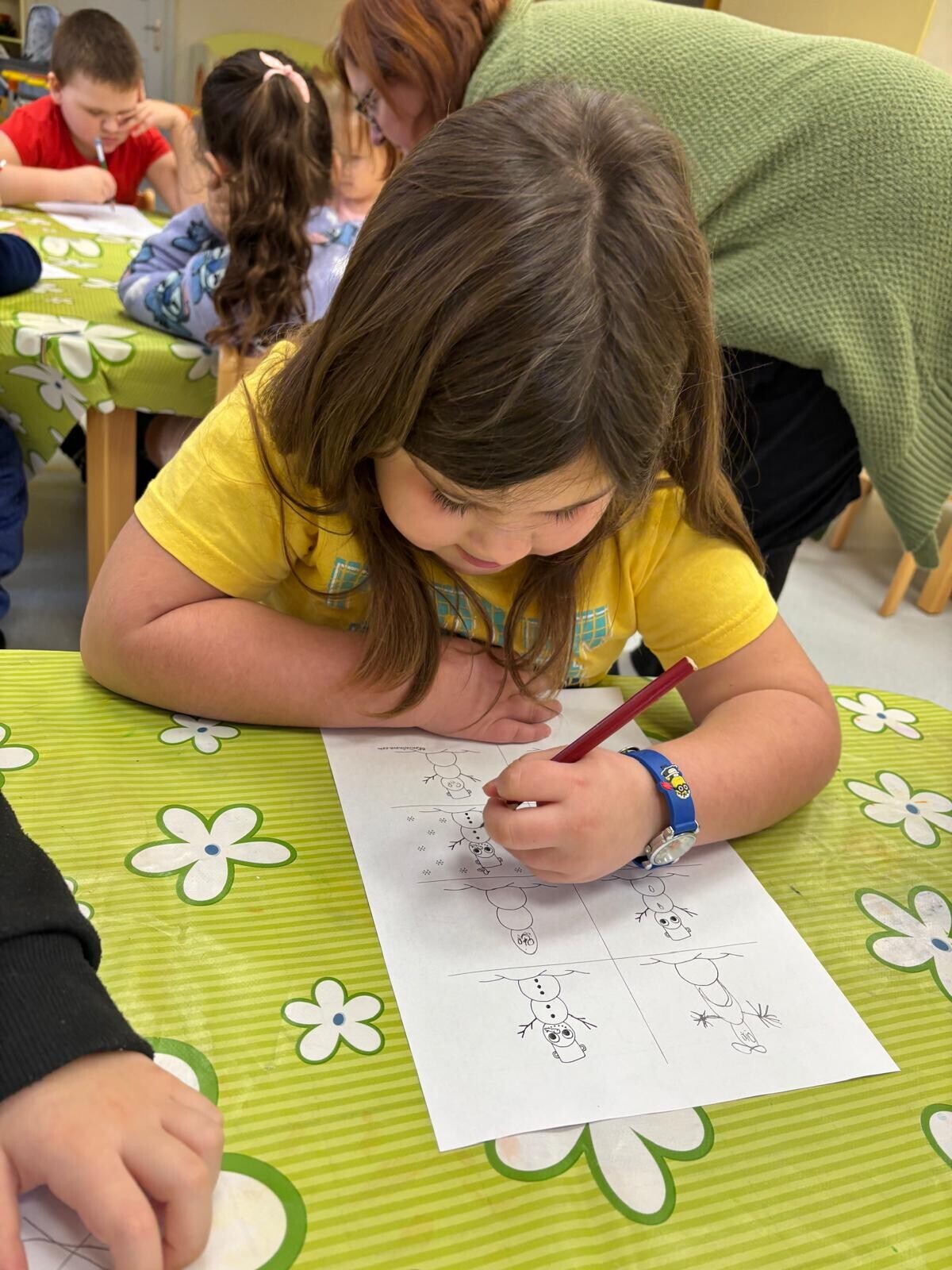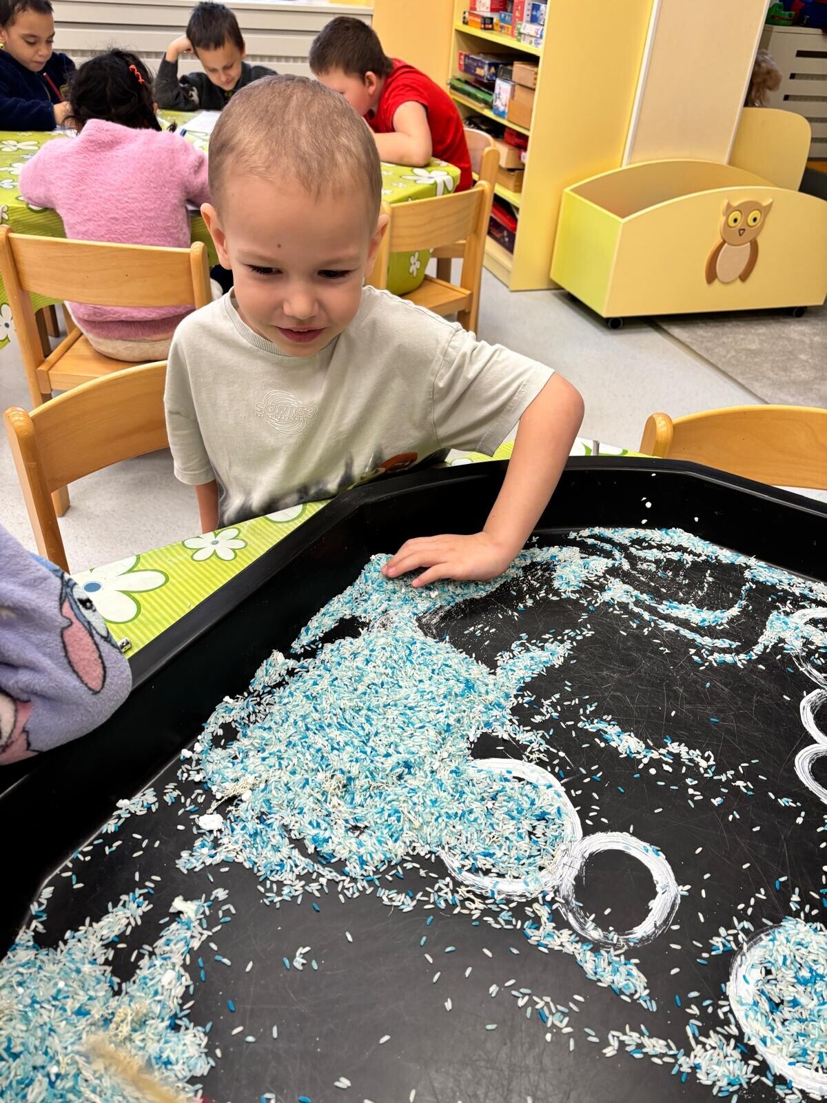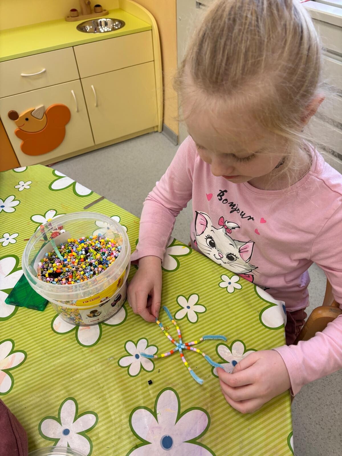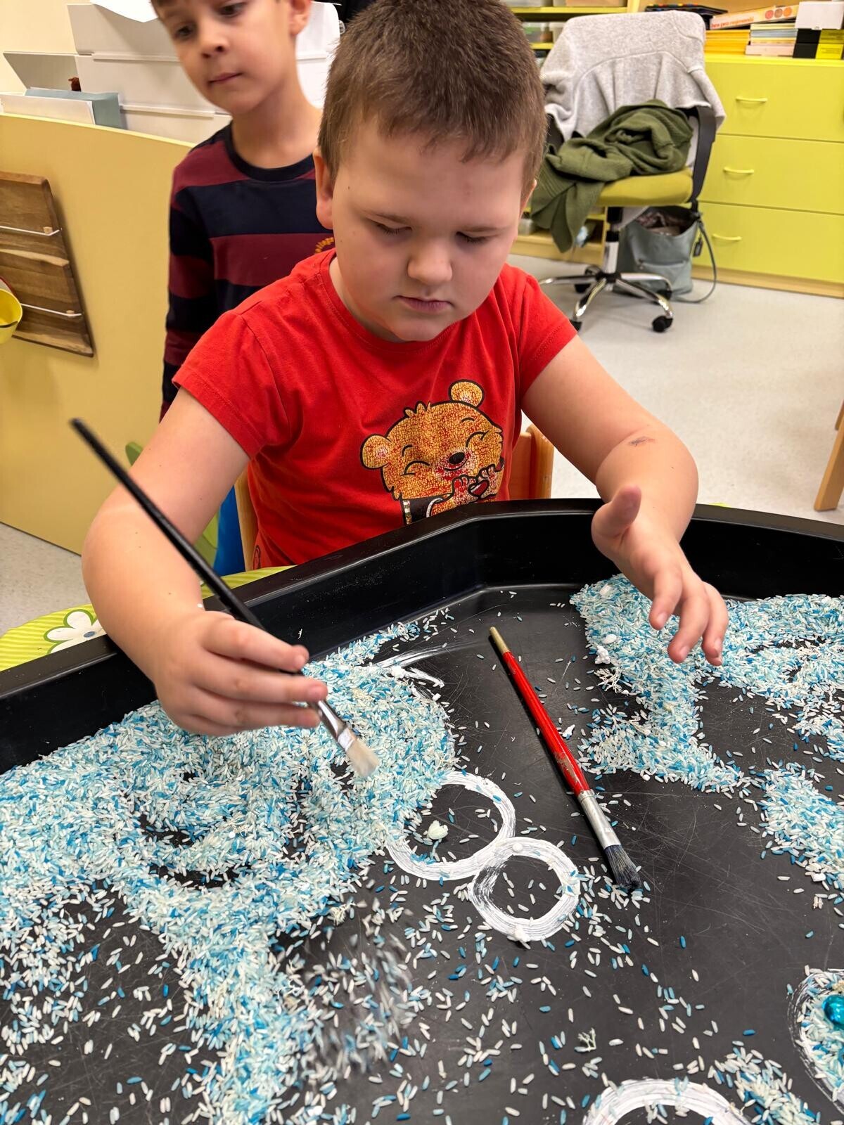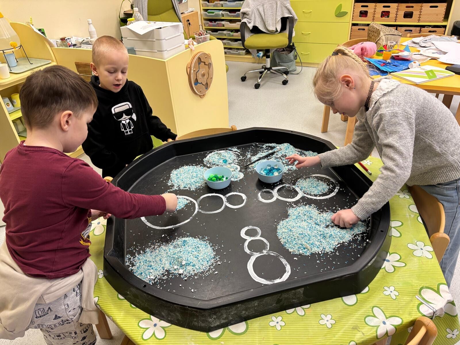 Tento týden si děti povídaly o tom, jaká máme roční období a proč se vlastně střídají. Dozvěděly se něco málo o rotaci Zeměkoule kolem Slunce a na planetu Zemi si i zahrály. Procvičily si osovou souměrnost, dech nebo i geometrické tvary, při navlékání korálků pak třeba jemnou motoriku. Pomocí obtisku pak namalovaly krásné sněhuláky. Naučily se i básničku a písničku k danému tématu.