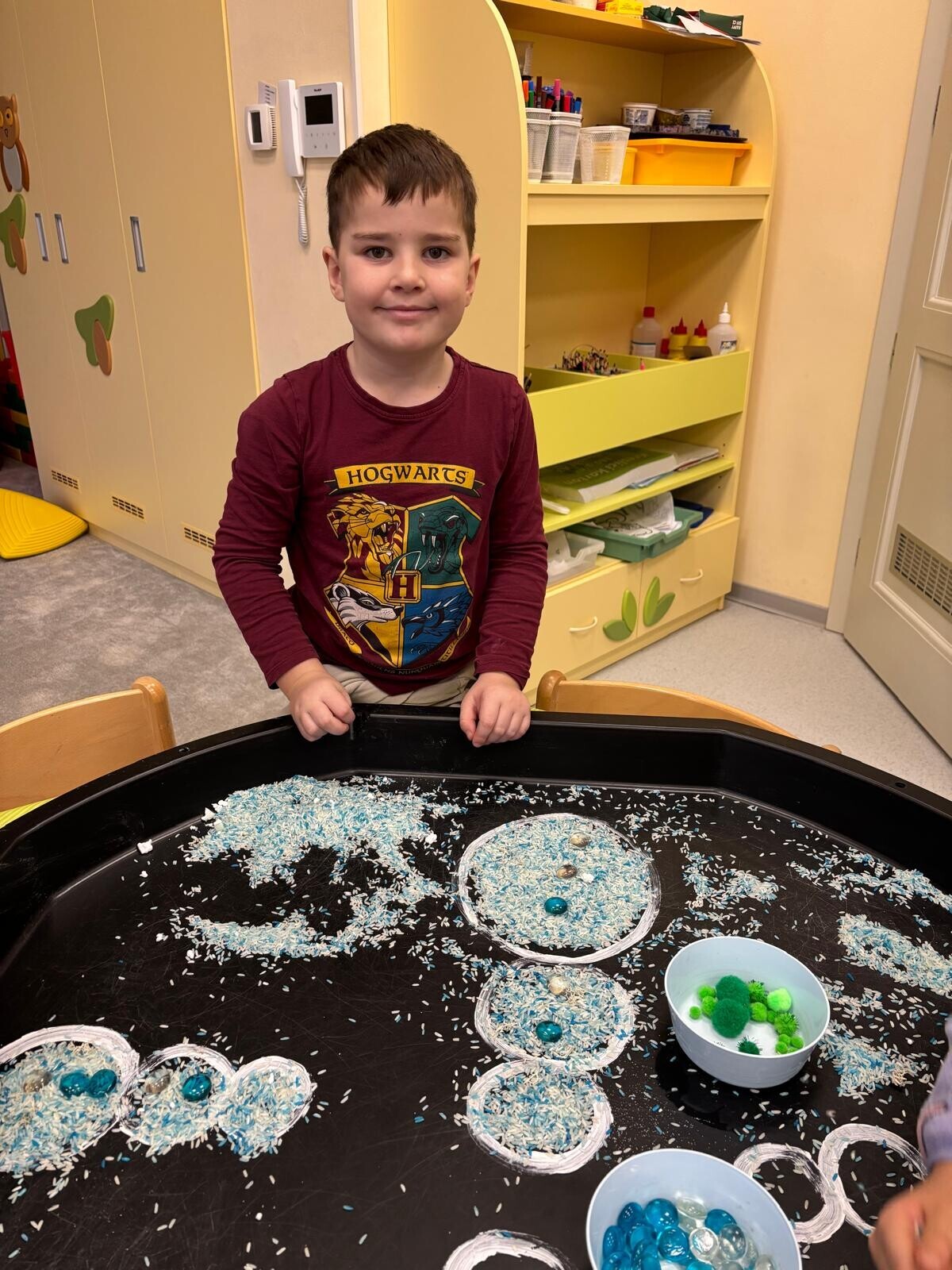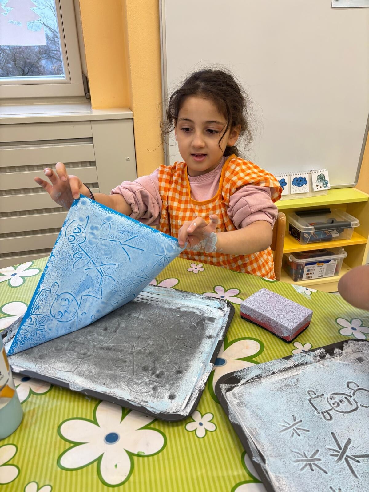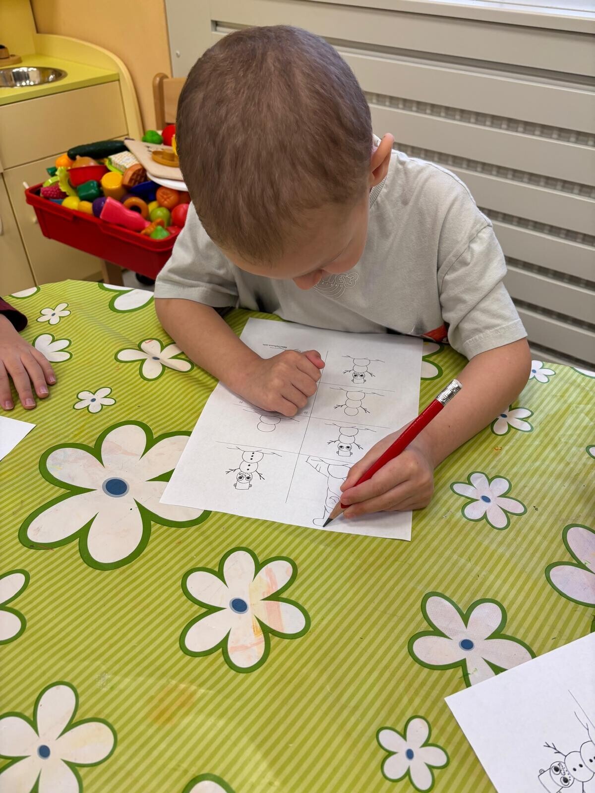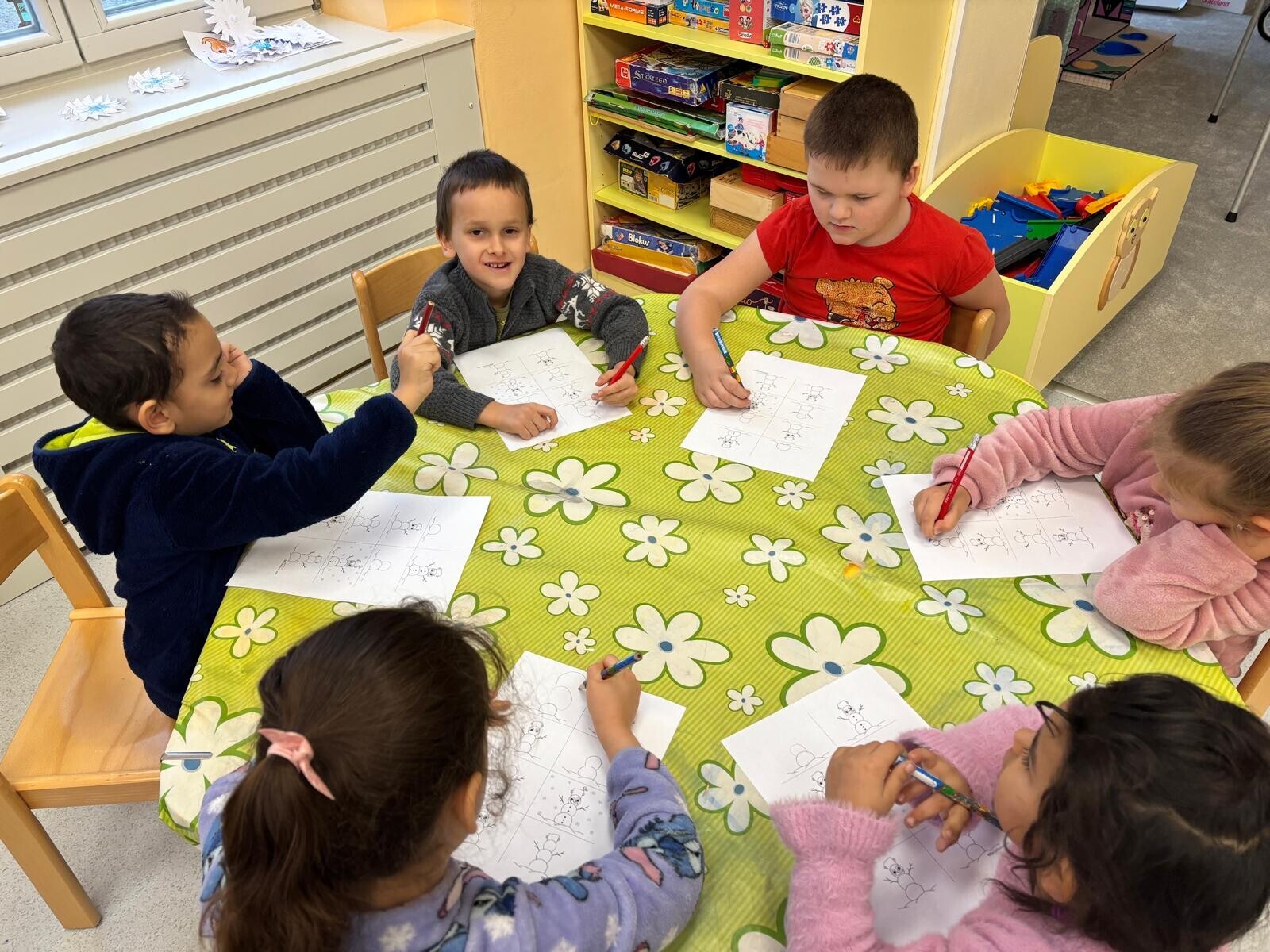 Tento týden si děti povídaly o tom, jaká máme roční období a proč se vlastně střídají. Dozvěděly se něco málo o rotaci Zeměkoule kolem Slunce a na planetu Zemi si i zahrály. Procvičily si osovou souměrnost, dech nebo i geometrické tvary, při navlékání korálků pak třeba jemnou motoriku. Pomocí obtisku pak namalovaly krásné sněhuláky. Naučily se i básničku a písničku k danému tématu.