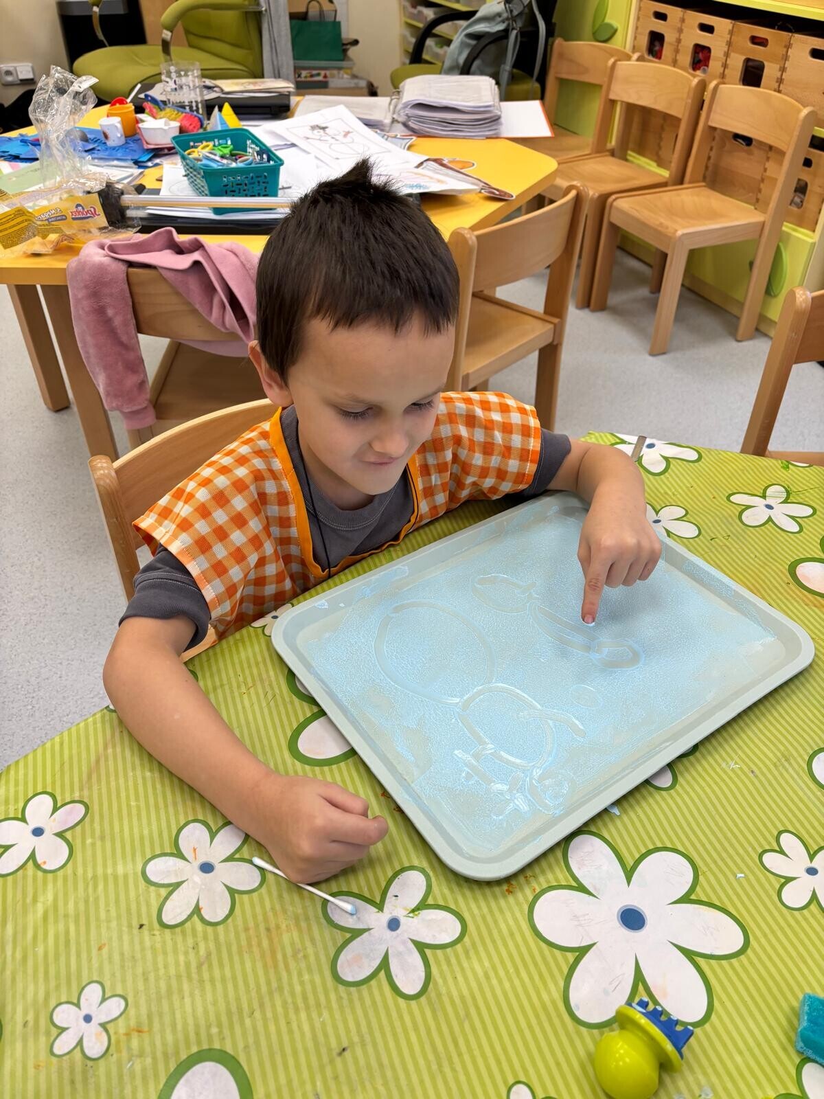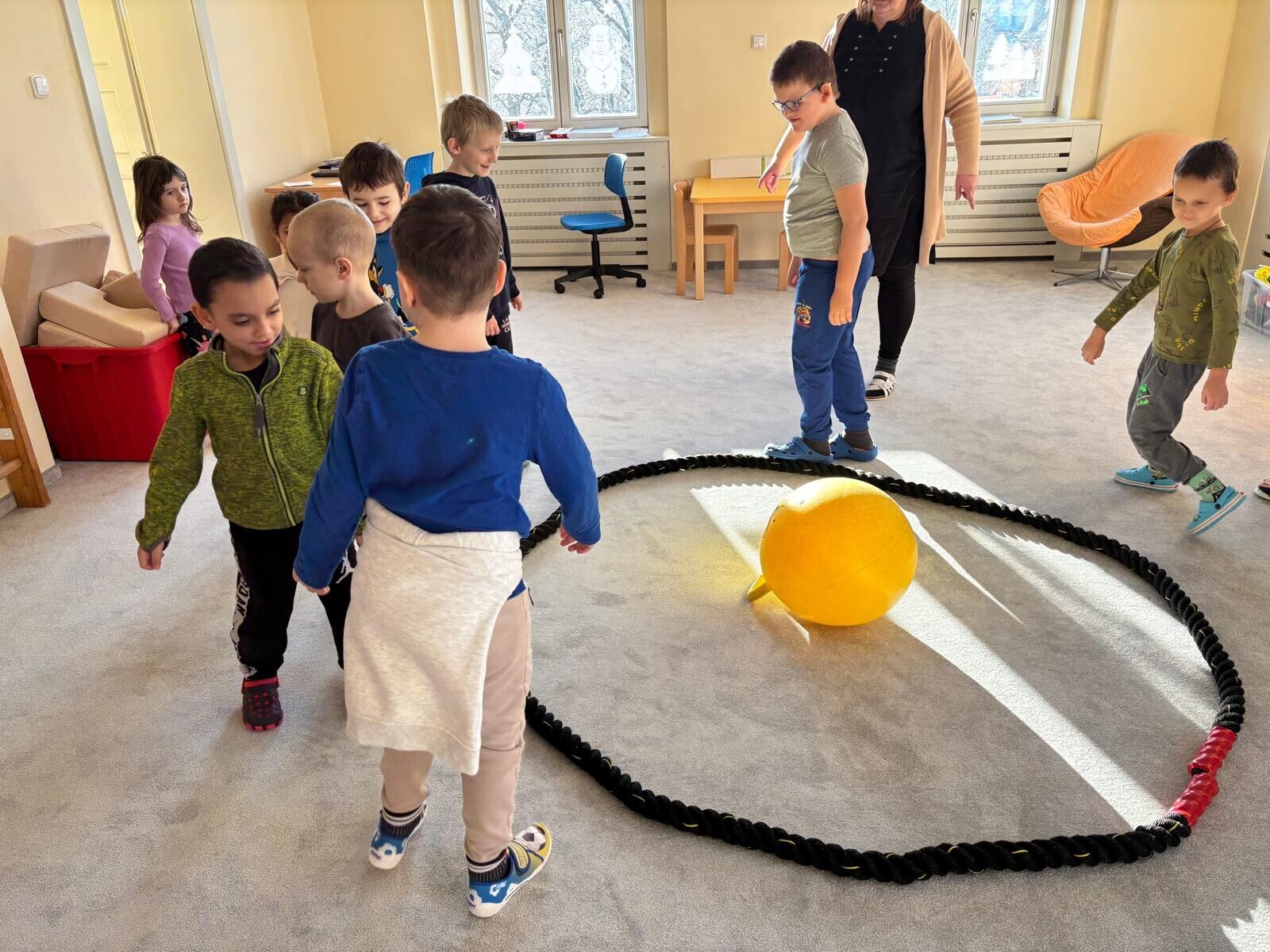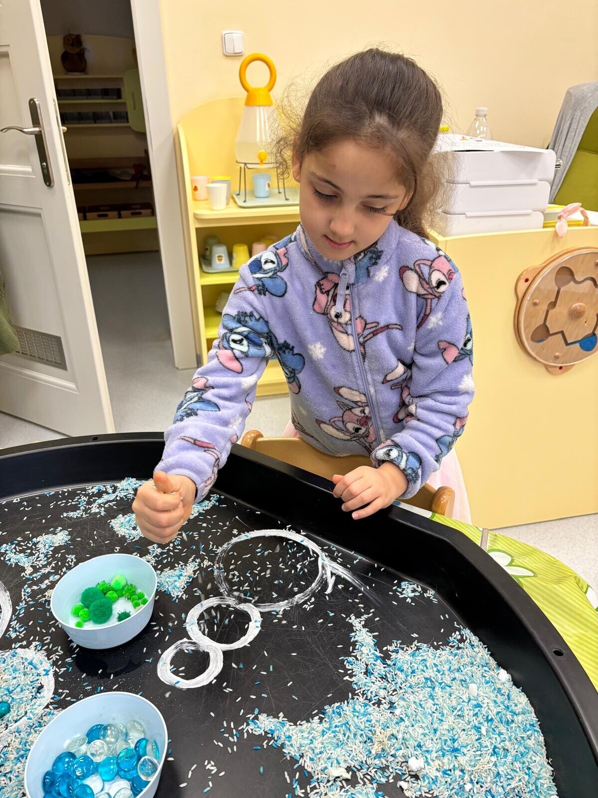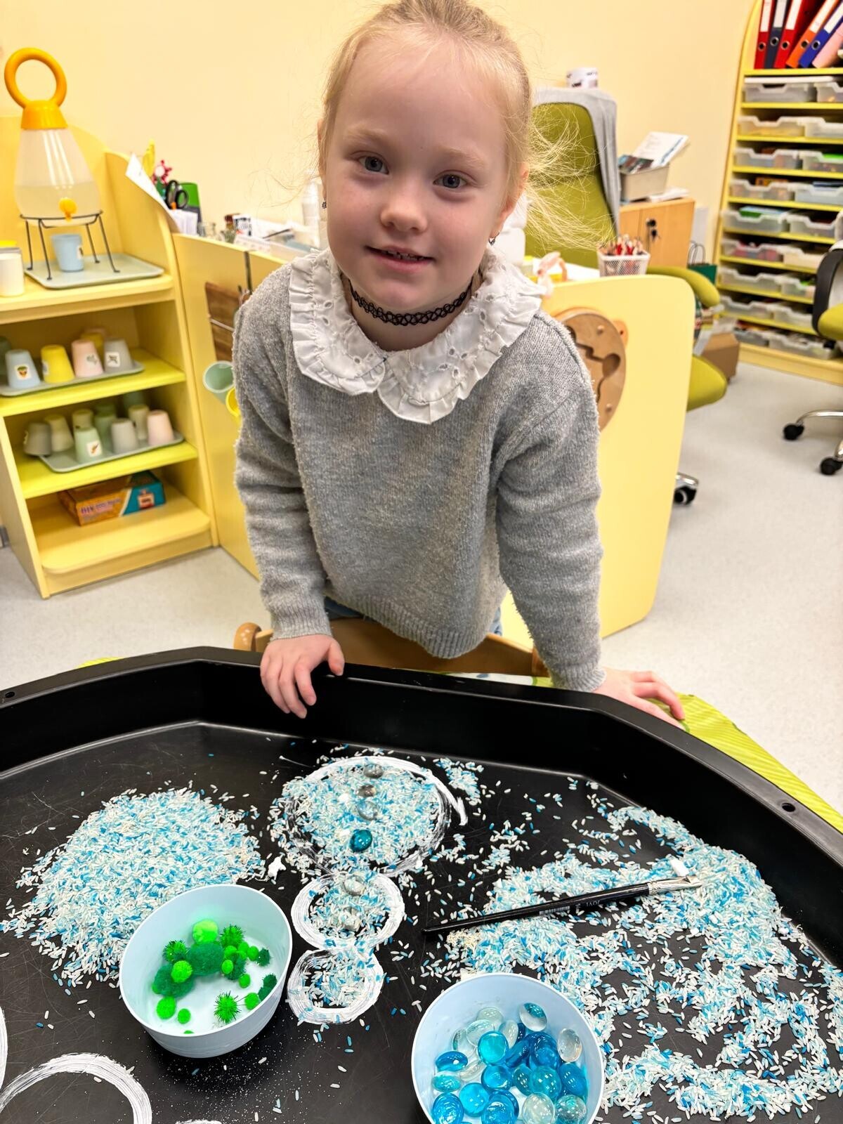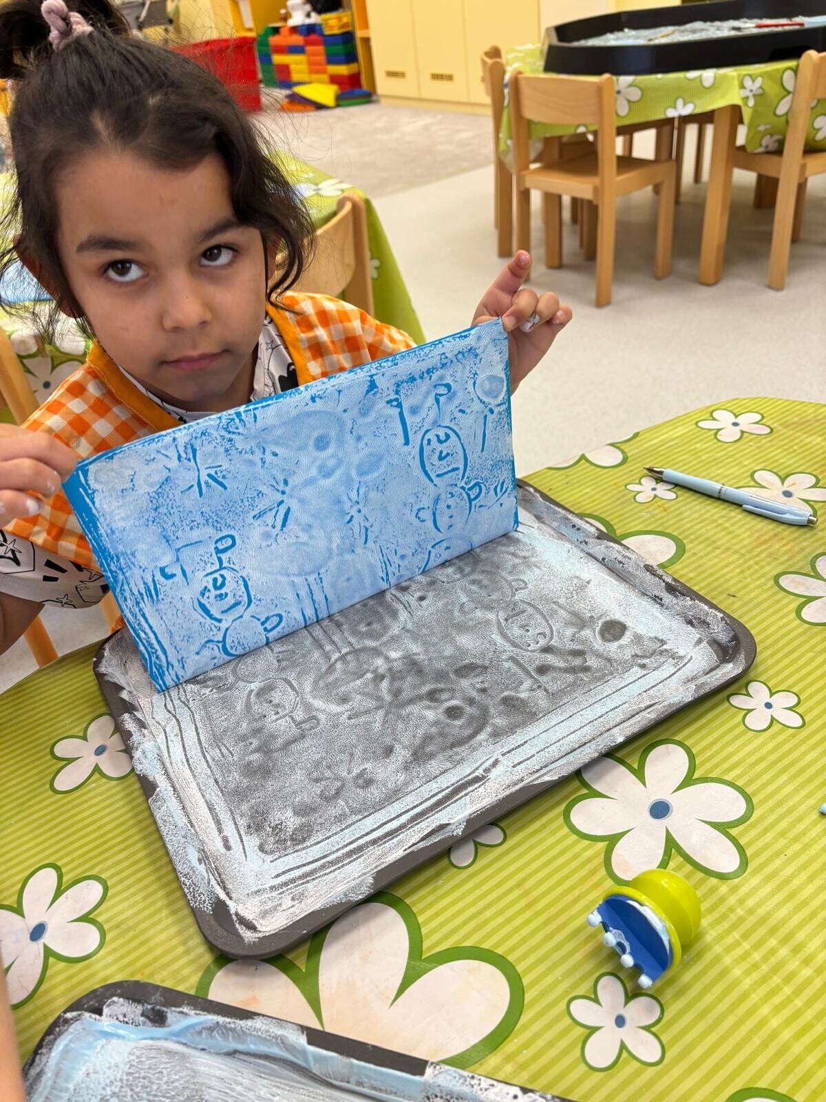 Tento týden si děti povídaly o tom, jaká máme roční období a proč se vlastně střídají. Dozvěděly se něco málo o rotaci Zeměkoule kolem Slunce a na planetu Zemi si i zahrály. Procvičily si osovou souměrnost, dech nebo i geometrické tvary, při navlékání korálků pak třeba jemnou motoriku. Pomocí obtisku pak namalovaly krásné sněhuláky. Naučily se i básničku a písničku k danému tématu.