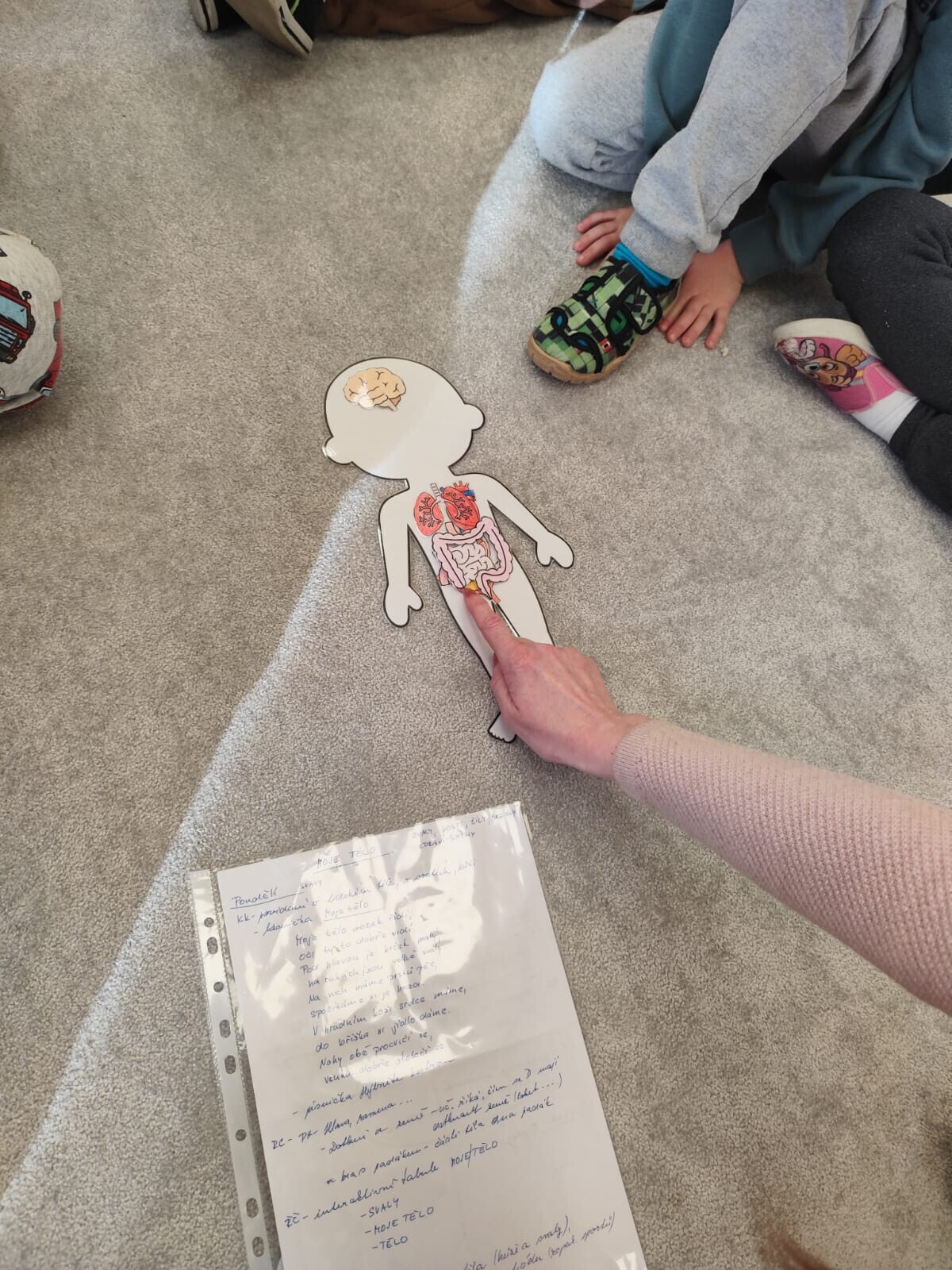 V týdnu od 23. - 27. 2. 2026 jsme měli ve třídě Soviček téma Moje tělo. Děti se dozvěděly něco o lidských svalech, kostech, trávicí spustavě a orgánech. Celý týden měli k dispozici rentgenové snímky lidských kostí, které si u světelného stolečku prohlížely a poté jsme z těchto snímků sestavovali celou kostru. V tomto týdnu děti vyrobily rentgenové snímky pomocí inkoustu a zmizíku, vyrobily lidský mozek pomocí obarvených těstovinových kolínek, hrály hry a soutěžily mezi sebou na interaktivní tabuli a spoustu dalších, zajímavých činností.